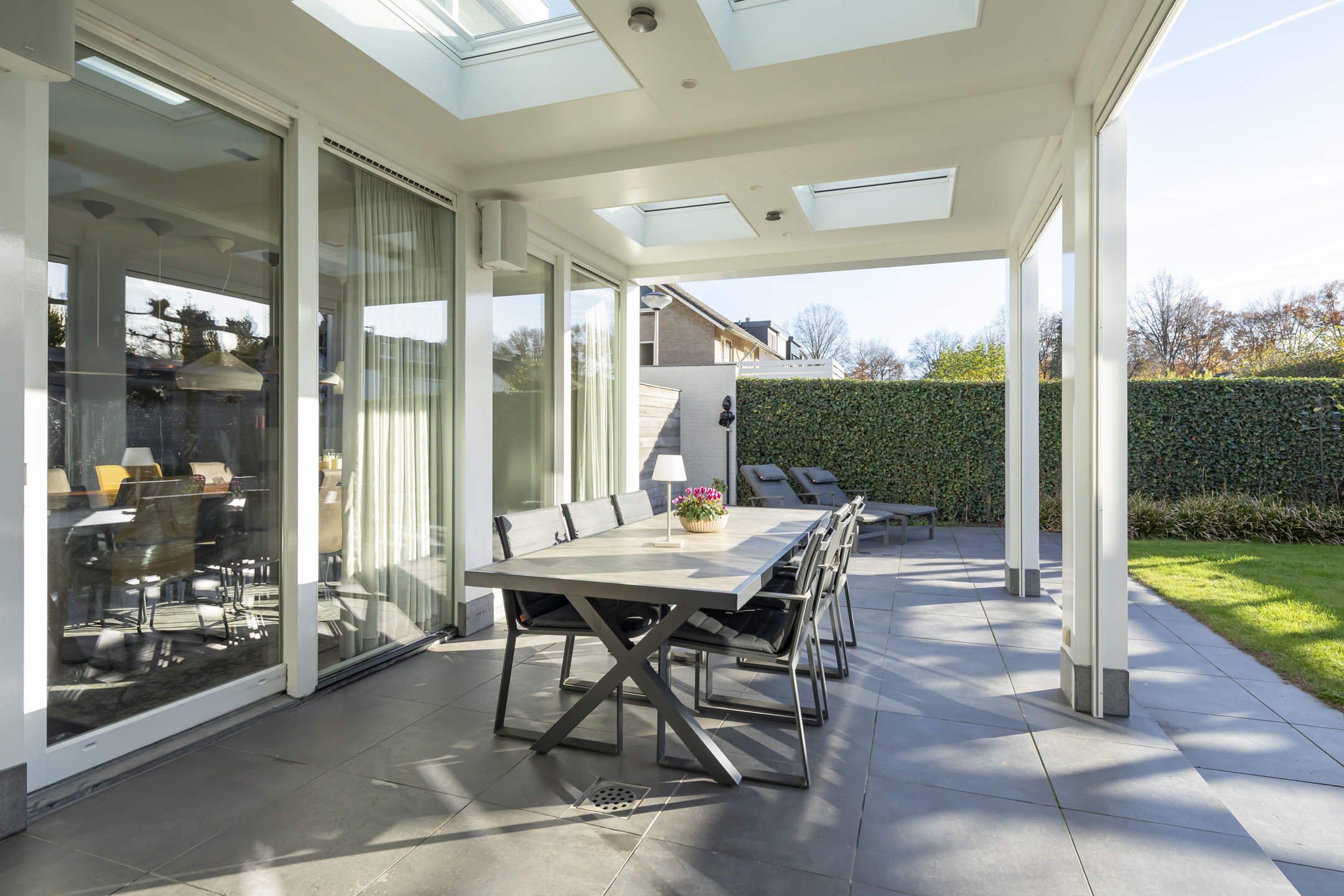 A lovely garden, facing the sunny southwest. You can enjoy the sun here year-round, both under the spacious covered terrace and in the lovely garden. The covered terrace is essentially an extra garden room, equipped with eight electrically operated Velux flat glass skylights, built-in speakers, and electrically operated screens, providing complete shelter from the wind. The covered area, adjacent to the house, is approximately 25 m².