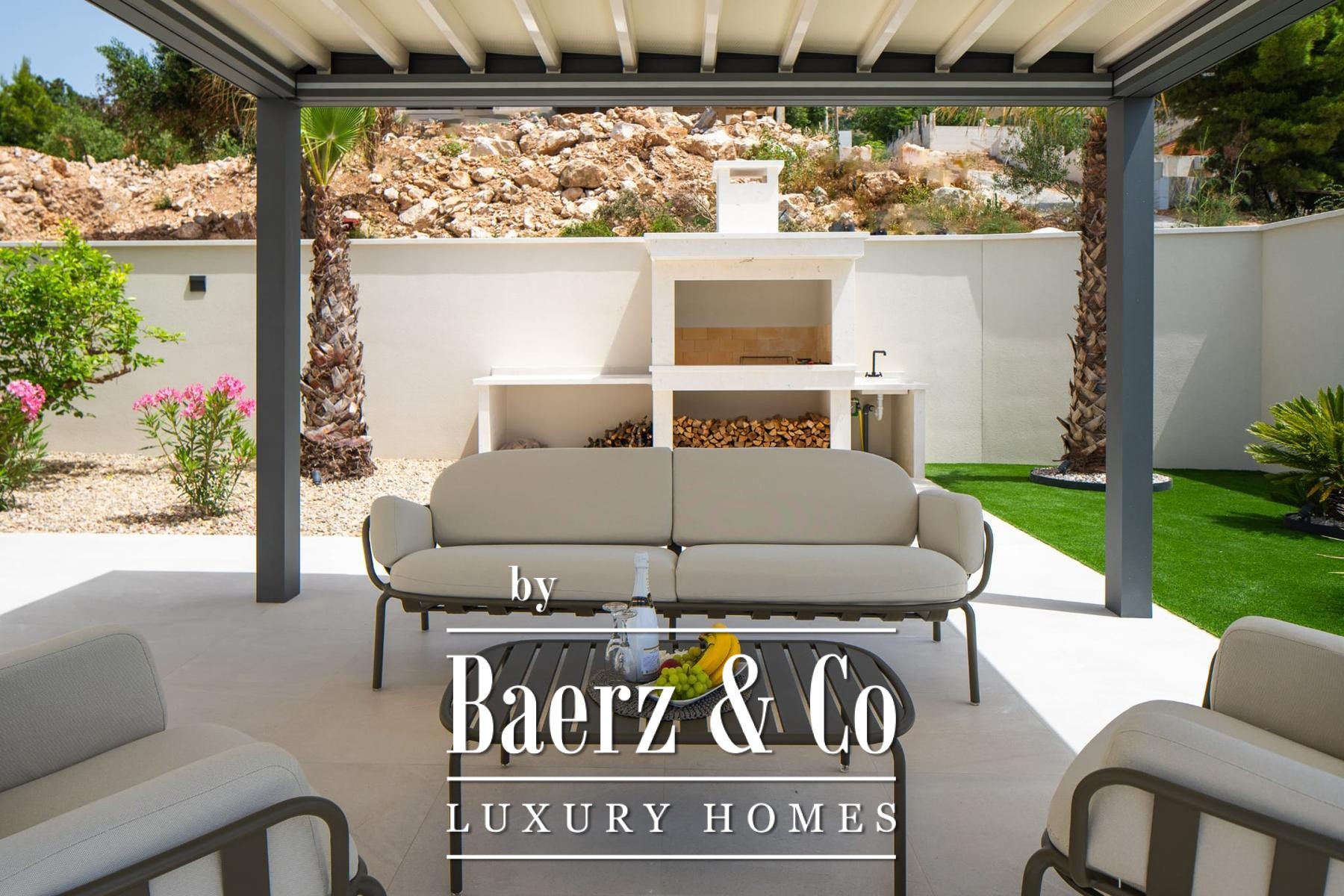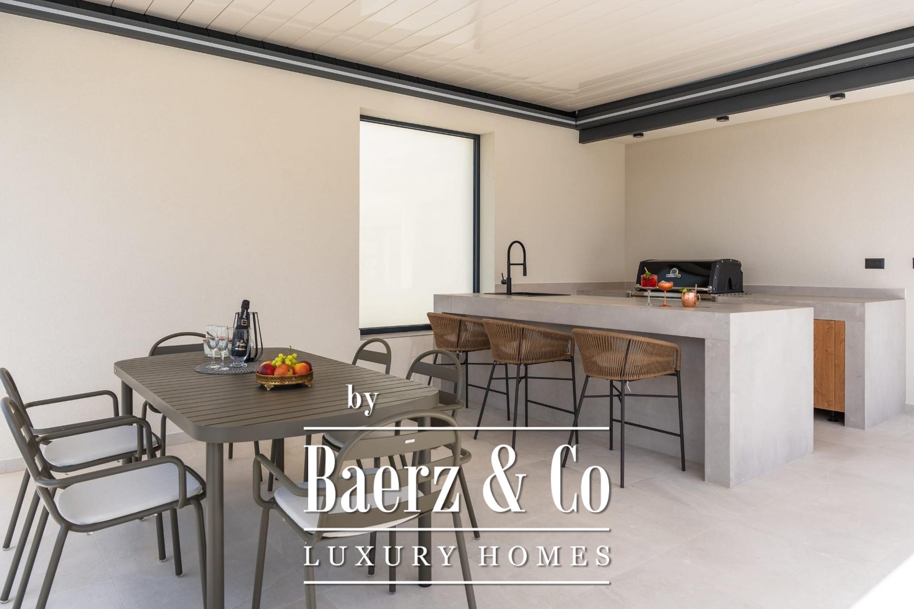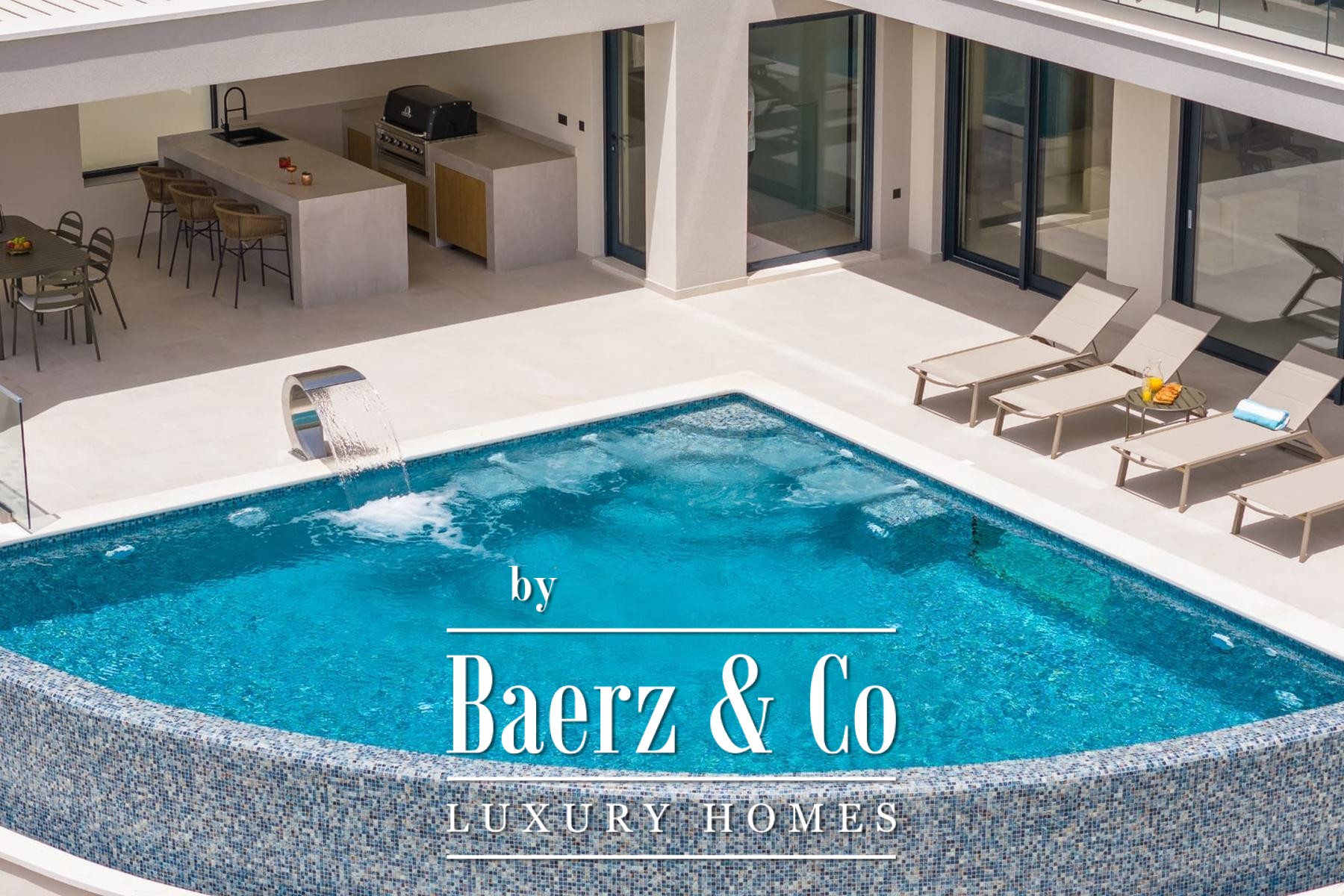 The ground floor flows seamlessly from its open-plan living, dining, and kitchen space onto two partially covered terraces, one of which hosts an outdoor summer kitchen, while a large sundeck introduces the 36 m² infinity pool with massage waterfall. On the lower level, a fun room, sauna, and mini kitchen create a setting for both relaxation and entertaining, complemented by technical rooms and a double garage. The residence reflects high energy efficiency, with solar hot water, integrated LED stone staircase, and advanced filtration systems.