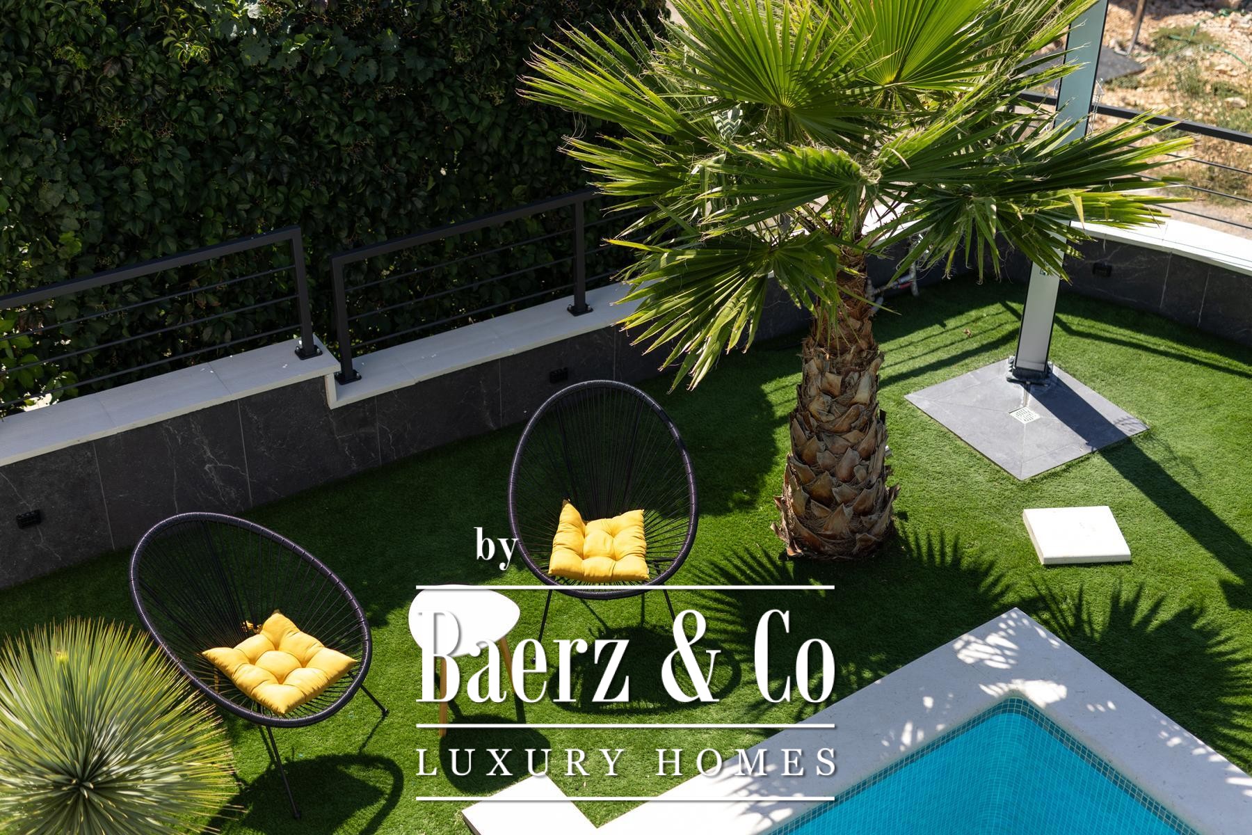Upstairs, four additional bedrooms—two with en suite bathrooms and three with private balconies—offer serene privacy. Practicality extends below with a basement accessible by exterior stairs, while the surrounding gardens and sun terraces frame daily life in natural calm. Four dedicated parking spaces sit discreetly to the side, complemented by a barbecue area at the rear designed for convivial dining. Just 2,200 metres from the shore and situated in a tranquil enclave, this villa blends seclusion with proximity. Premium furnishings and appliances complete the offering, making this a distinguished opportunity for refined coastal living.