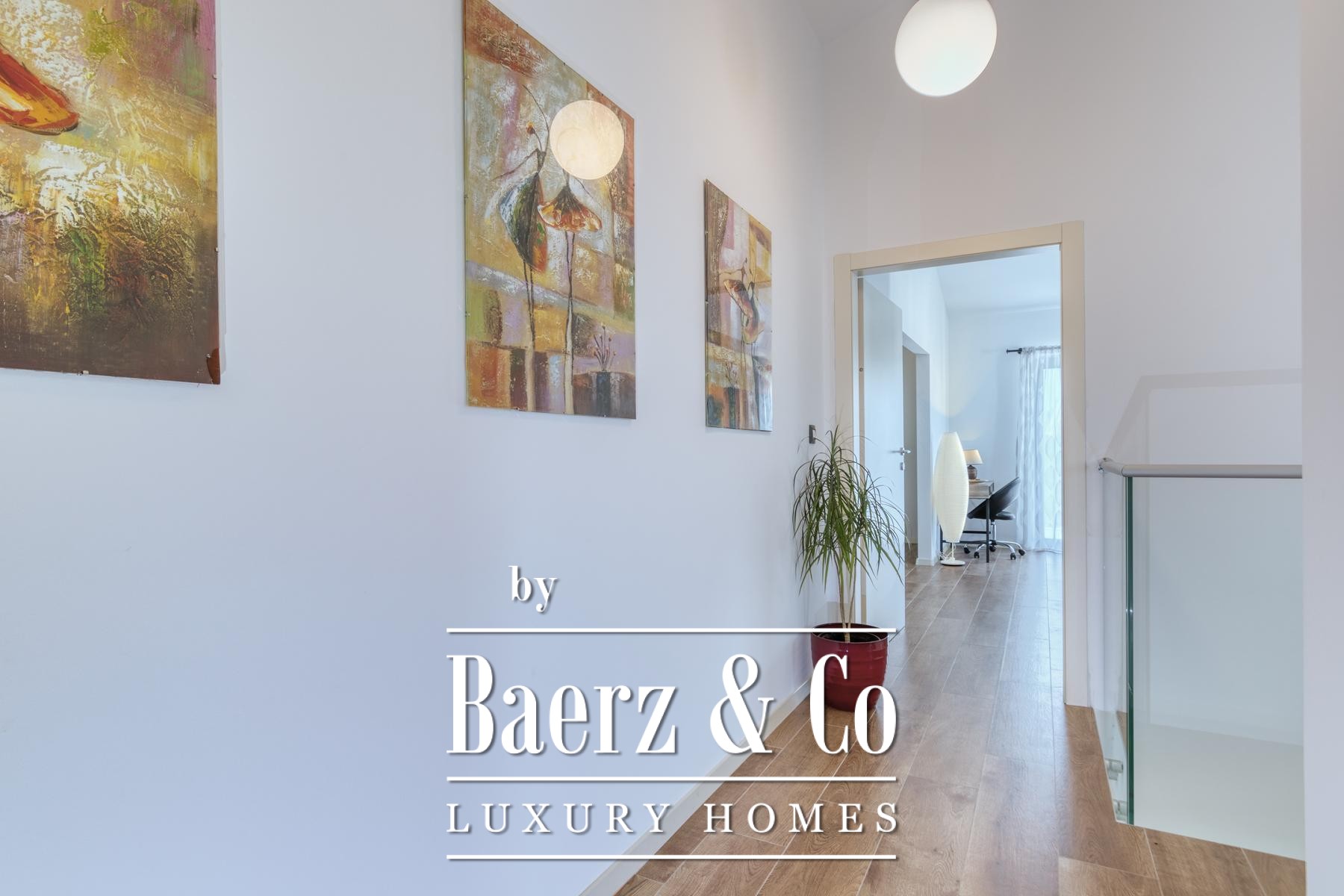 Upstairs, three bedrooms each with its own bathroom provide privacy and comfort, while the master suite’s private terrace invites quiet moments with views of peaceful greenery. Underfloor electric heating throughout, coupled with three air conditioning units, ensures comfort across all seasons. A garage and multiple parking spaces offer convenience and security.