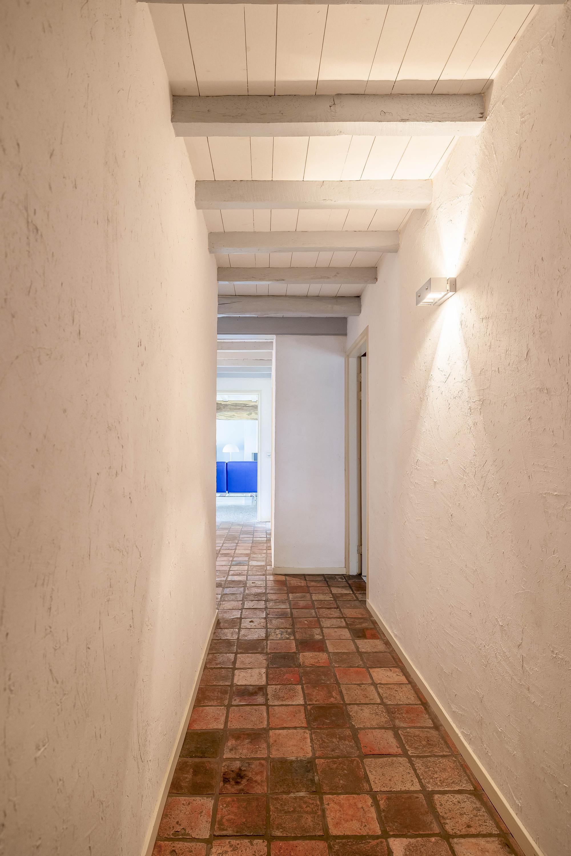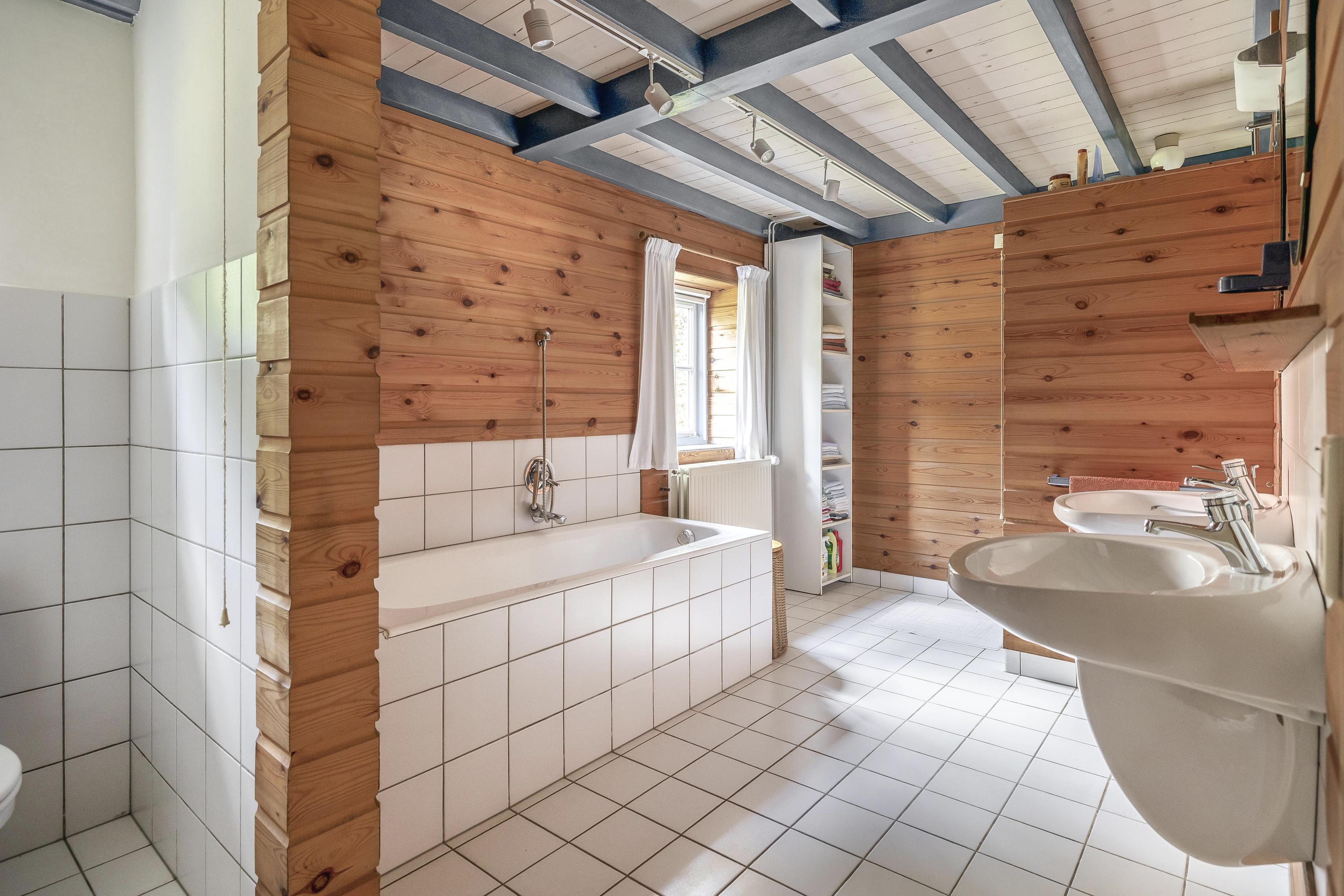From the fixed staircase in the entrance hall, you reach the first floor of the main house. Here you will find a spacious landing with carpeted floors, stucco walls, and a beamed ceiling, with a view into the hall on the ground floor. From here, you have access to two bedrooms and the second bathroom.