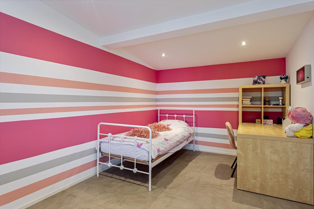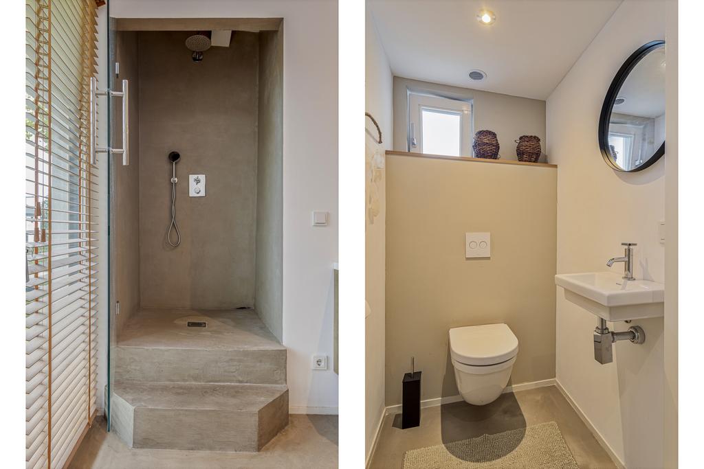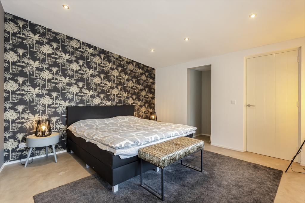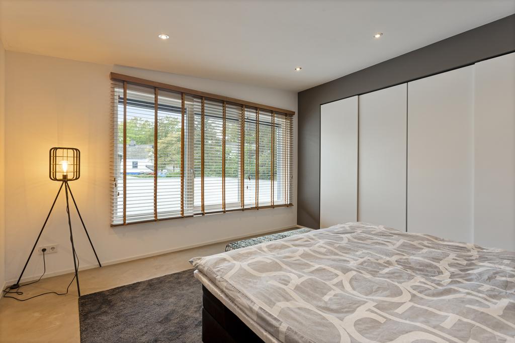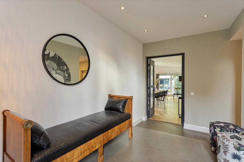 The side and rear gardens are accessible via four large sliding doors. All rooms are finished with either a modern concrete-look floor or a classic wooden herringbone floor. The kitchen is designed around a central island and is fully equipped with all necessary built-in appliances.