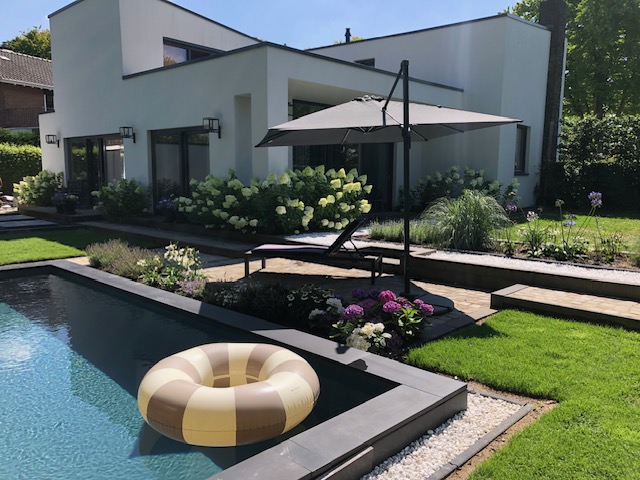 In addition to the detached garage at the back right of the garden, a dedicated guest house is located at the back left—ideal for guests, teenagers, or a home office. This space (approx. 20 m²) consists of a living/work area, a shower room, a toilet, a kitchenette, and its own covered terrace.