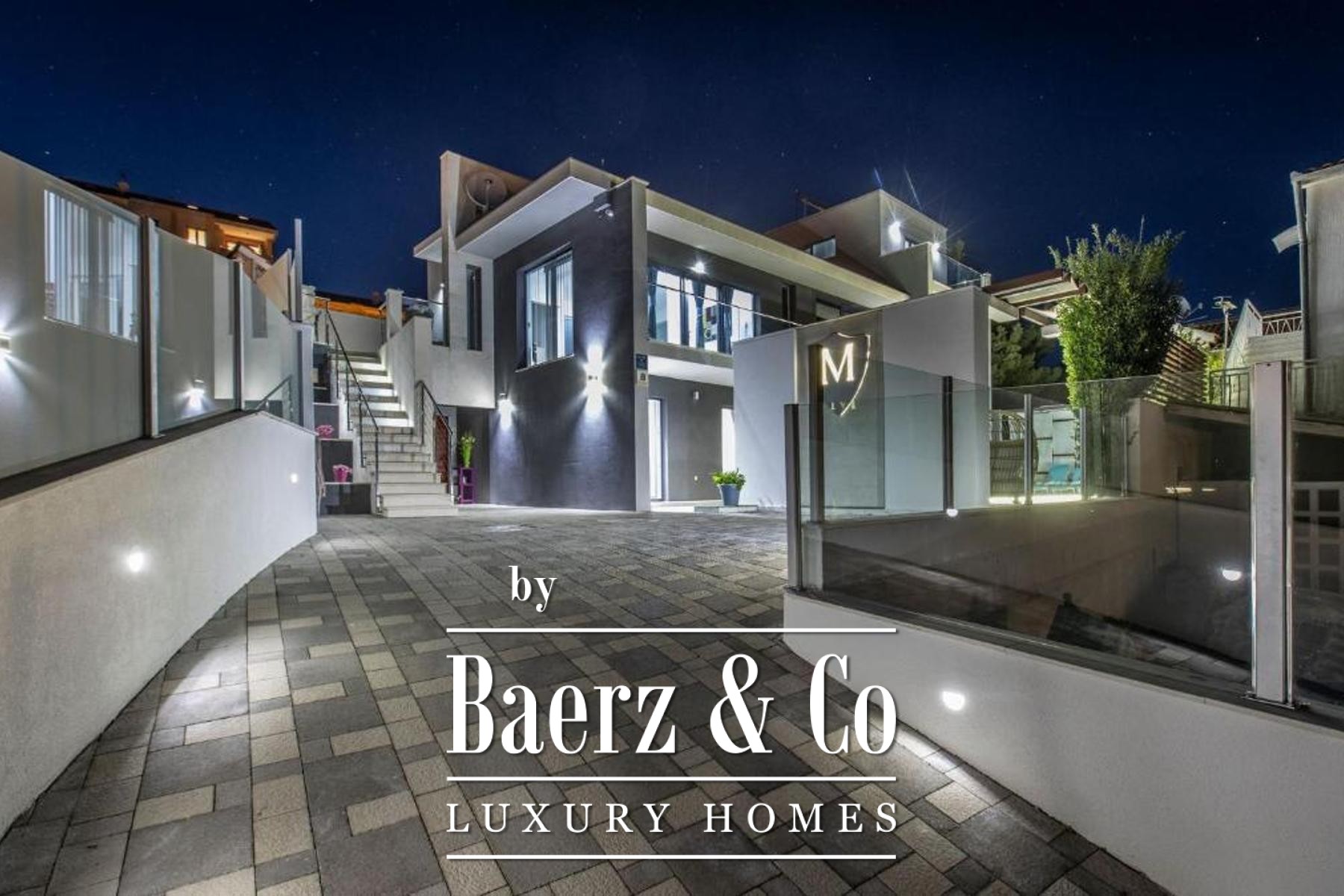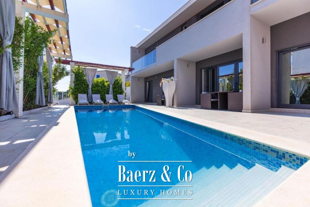 The upper level presents a luminous living space with a kitchen and dining area, two bedrooms, and two bathrooms, with each main room connecting to balconies oriented towards sea and pool views. Flexibility is integral, as the first floor can be separated into independent apartments to suit a range of lifestyles or hospitality needs. Refined finishes and premium furnishings underscore every detail, while thoughtful amenities include a tavern with barbecue, an inviting space for dining and gathering, and a sunlit yard. Three parking spaces complete the picture of relaxation and opportunity in Croatia’s coastal landscape.