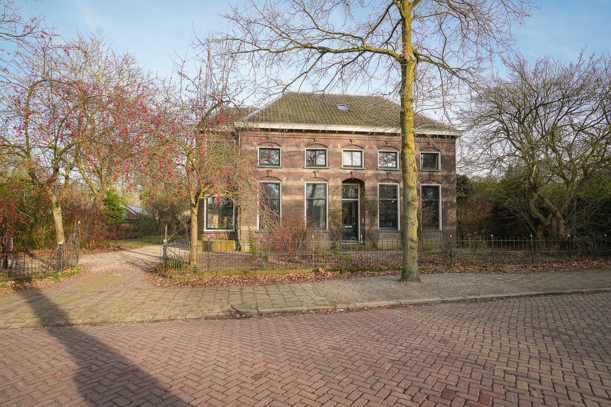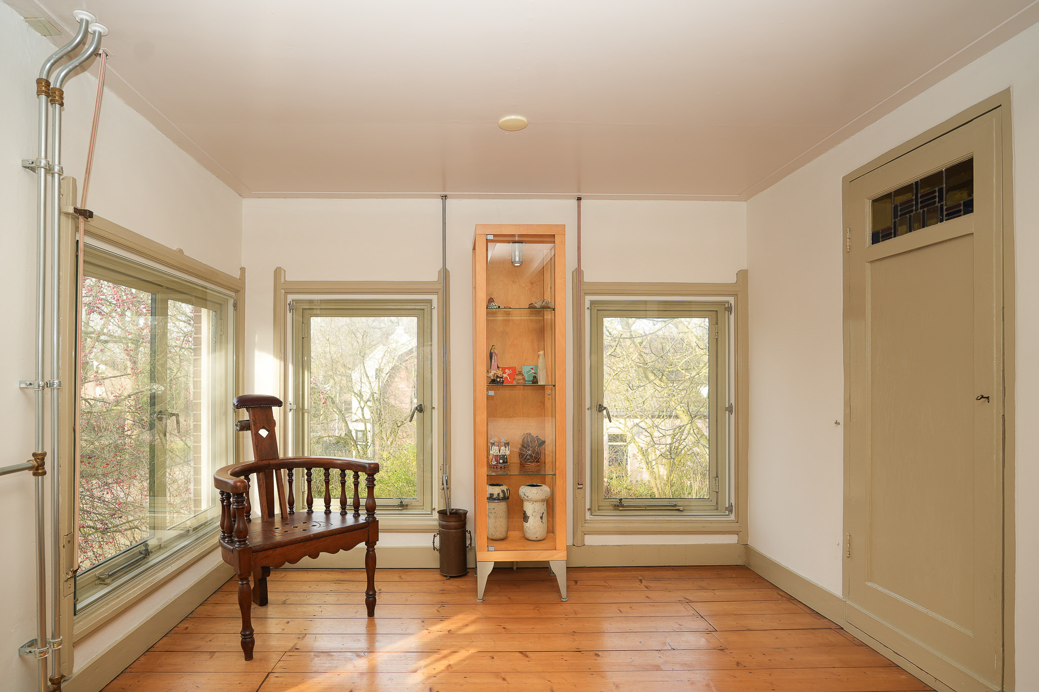 De entree voert naar een L-vormige gang, die toegang geeft tot de verschillende vertrekken, waar licht en hoogte meteen opvallen. Halverwege de gang bevindt zich de fraaie trap naar de eerste verdieping met een karakteristiek bordes. Aan de voorzijde ligt de woonkamer en suite, verdeeld in een zit- en eetgedeelte. Deze ruimte wordt gekenmerkt door originele schuifdeuren met glas-in-lood en een erker. In het eetgedeelte zorgen de parketvloer en vaste inbouwkasten voor een rustige en verzorgde uitstraling; in het zitgedeelte dragen het balkenplafond, de maatwerk wandkasten en de stoere houtkachel bij aan een warme, huiselijke sfeer.