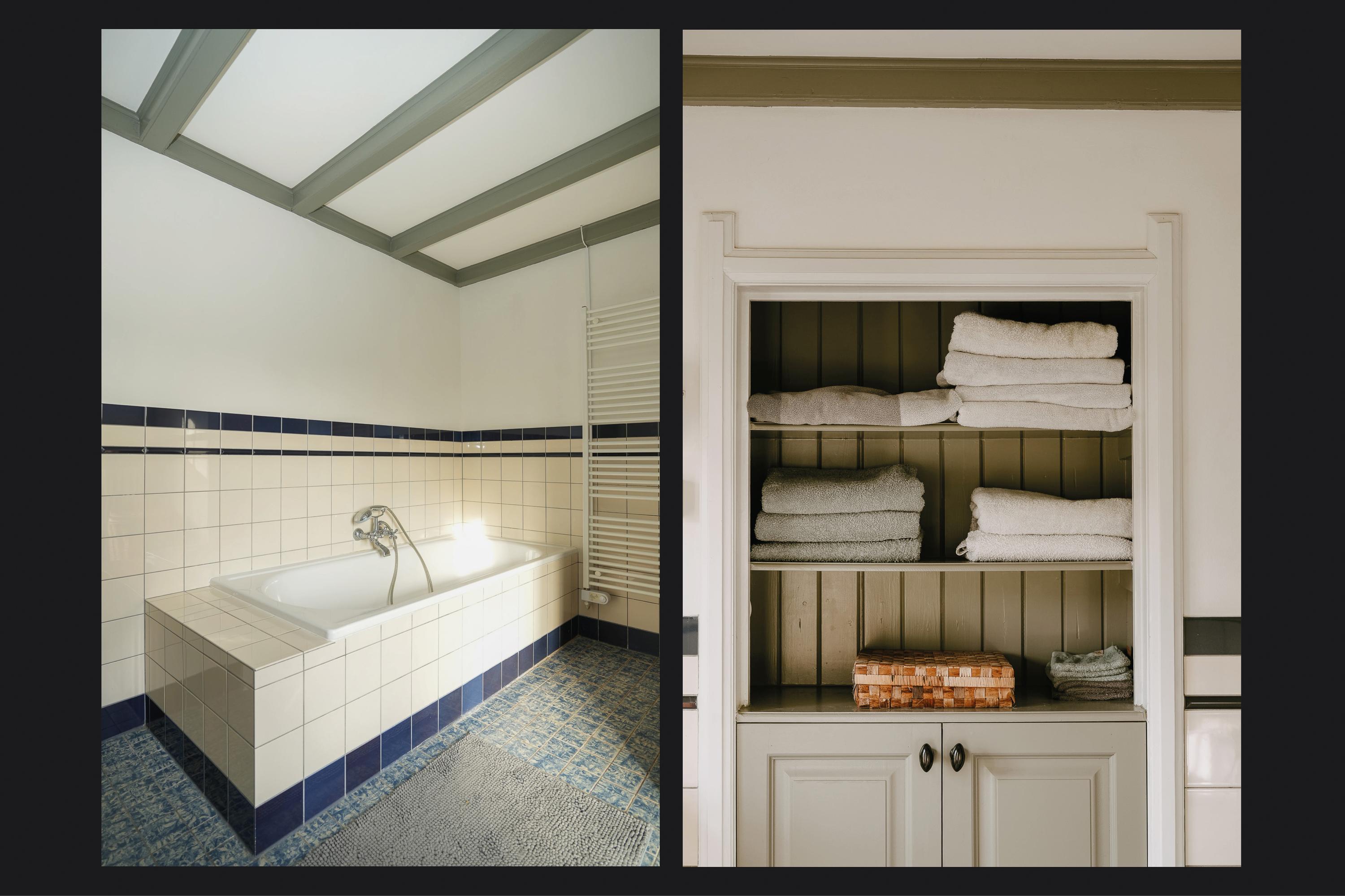 In de ouderslaapkamer aan de voorzijde is een bijzonder, oorspronkelijk wastafelmeubel behouden gebleven. Dit meubel bestaat uit twee porseleinen waskommen, opgenomen in een maatwerk meubel met kastruimte, en wordt geaccentueerd door een marmeren achterwand, bijpassend beslag en een brede spiegel. Een sfeervol detail dat het historische karakter van de villa benadrukt en de slaapkamer een Franse allure geeft. Een fraai aanvullend detail is de kastruimte in deze kamer, waar zich in het verleden een lift bevond.