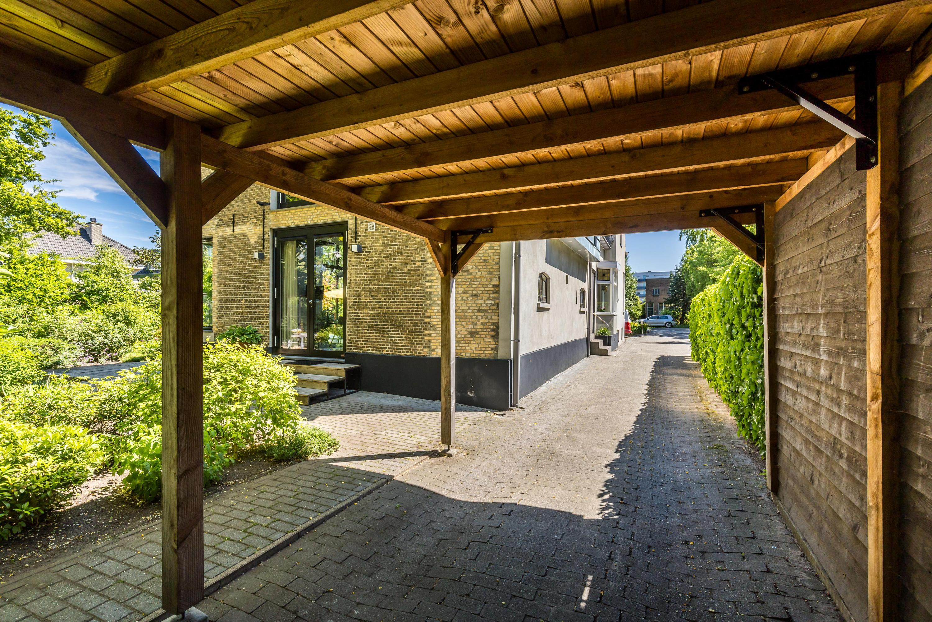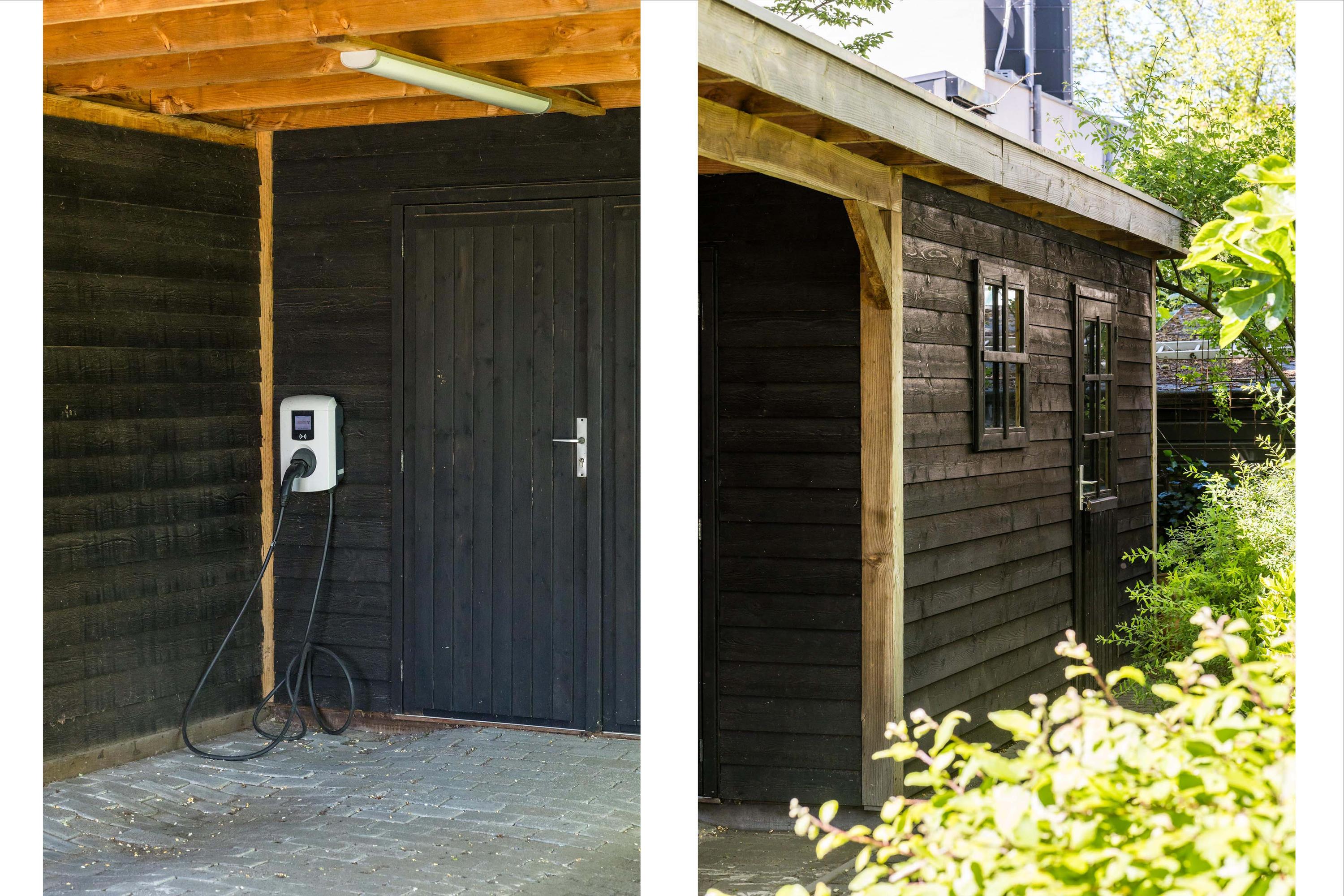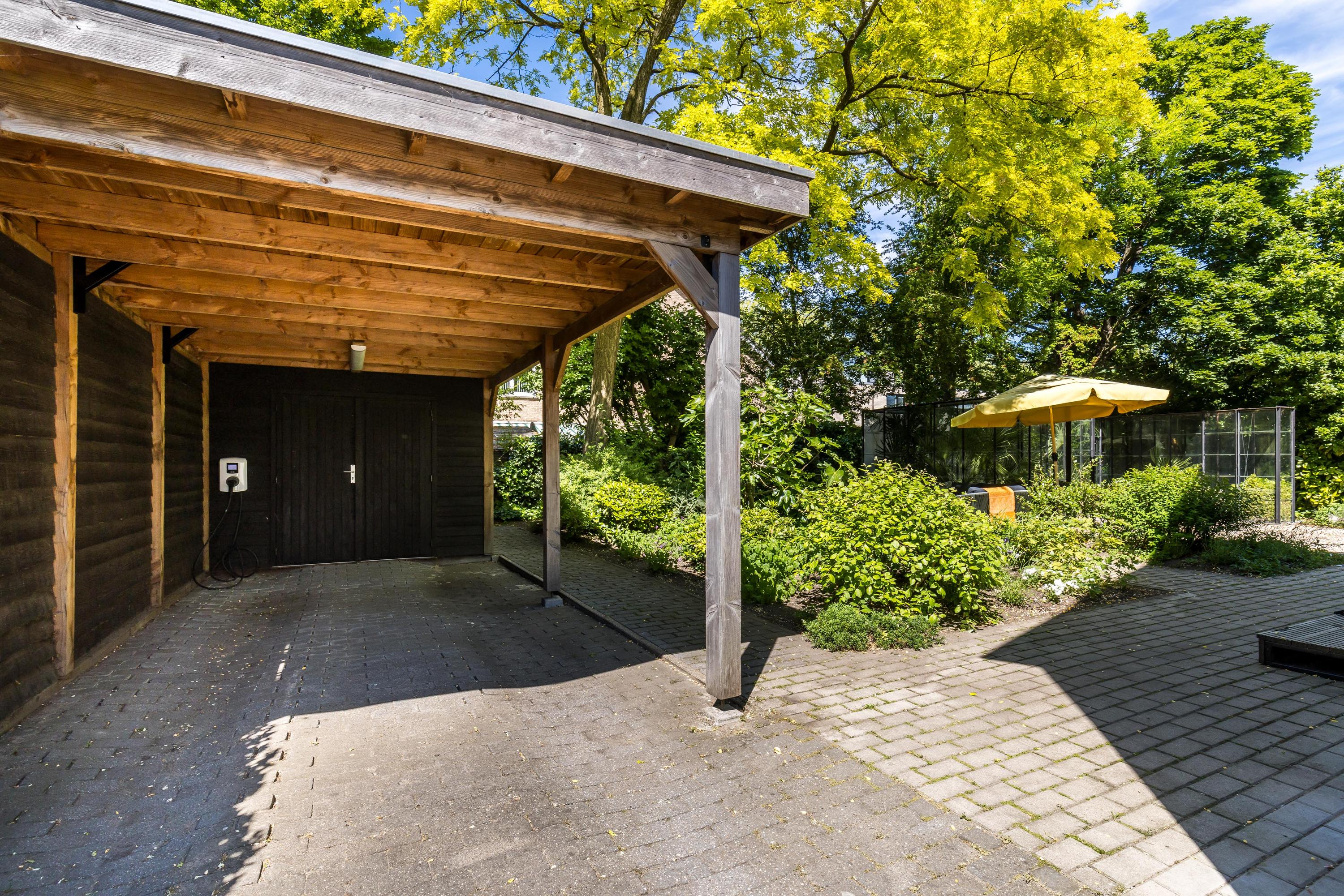 The front garden is beautifully landscaped with hedges, gravel paths and various plants. A side garden with driveway offers on-site parking, a carport with a charging station and a large storage room. The other side garden and the backyard together form a beautiful main garden area. At the back of the garden is a food forest with fruit trees, herbs and soft fruit. This garden has been landscaped under architecture and offers a lot of privacy and various sunny seating areas.