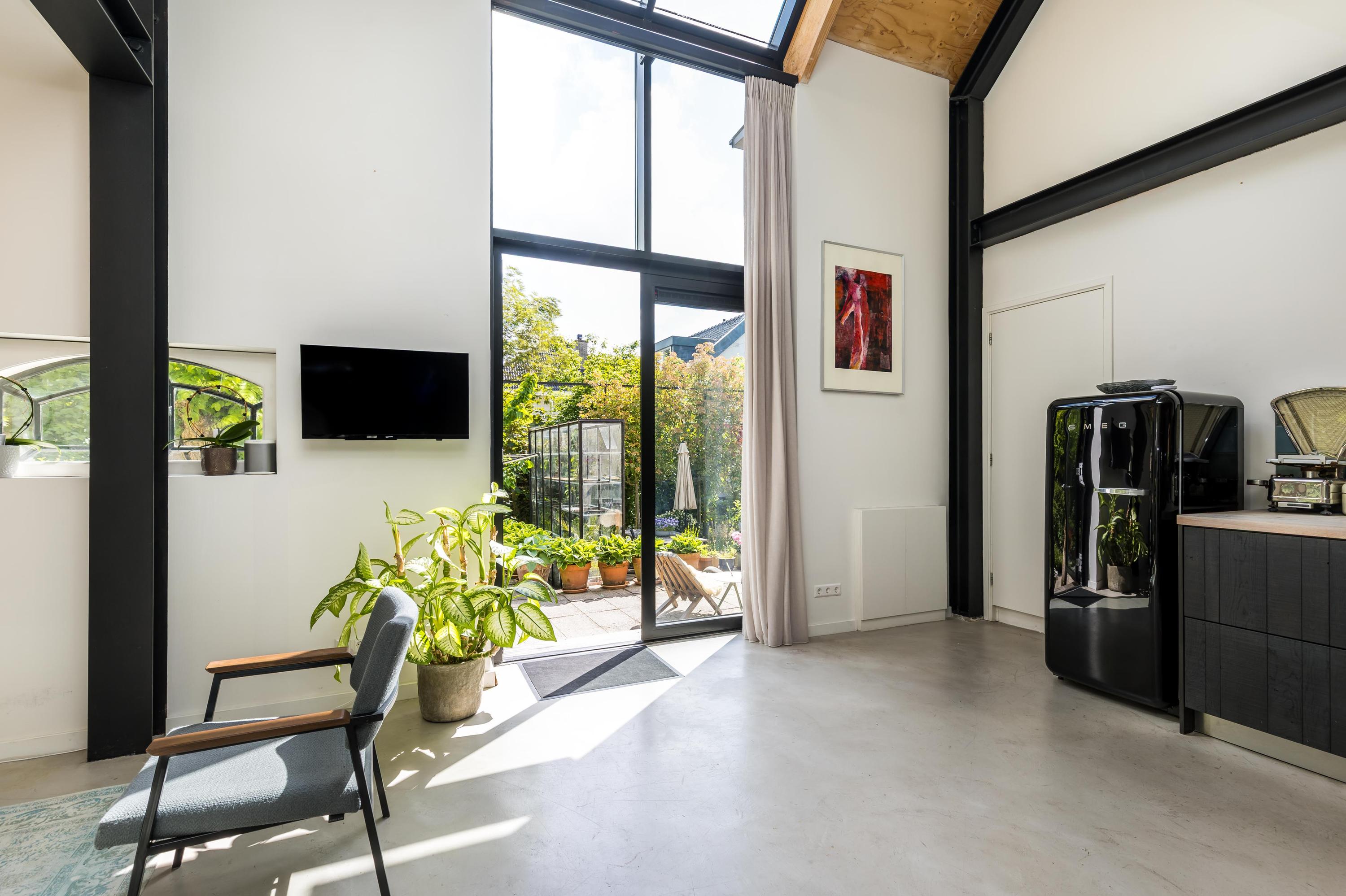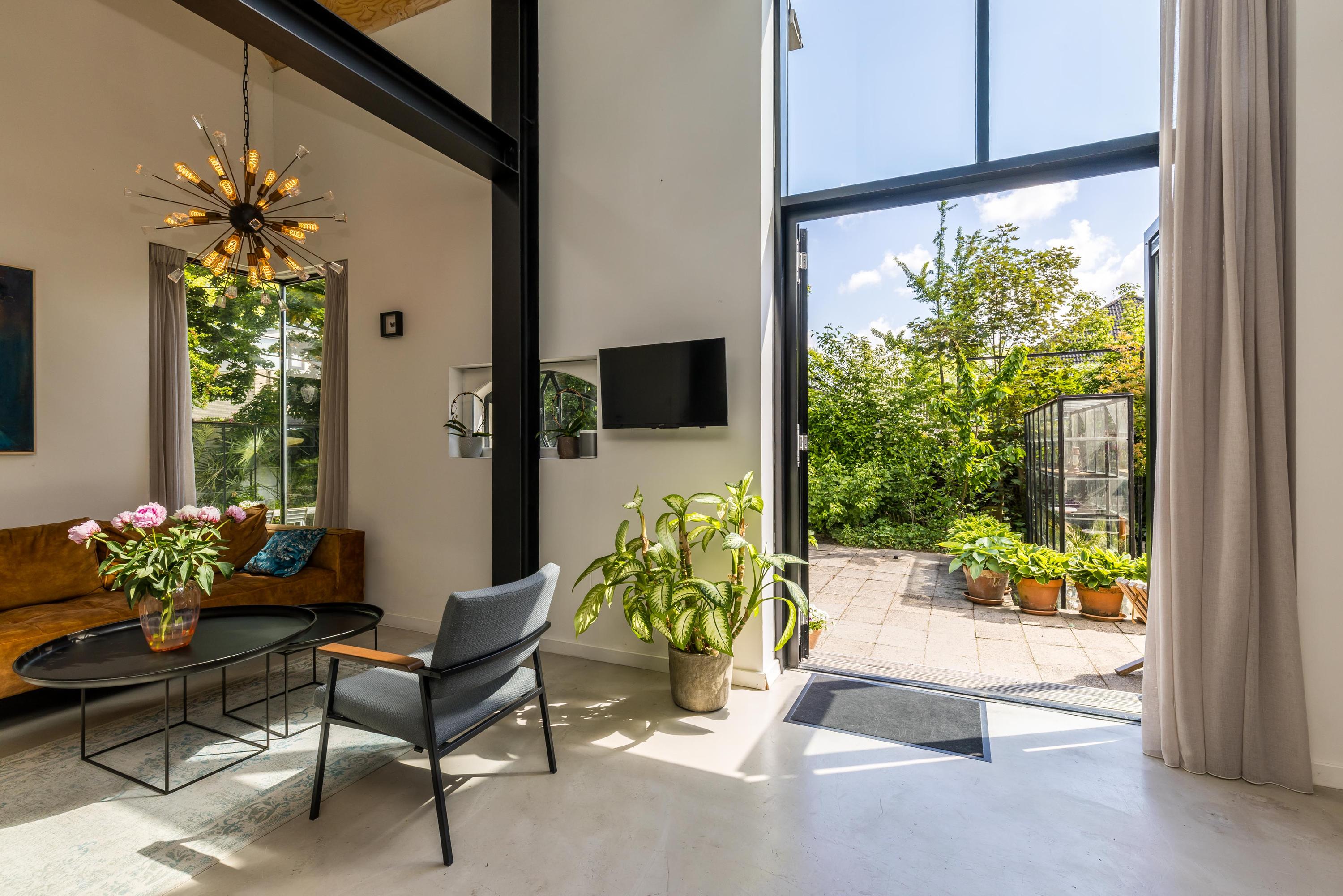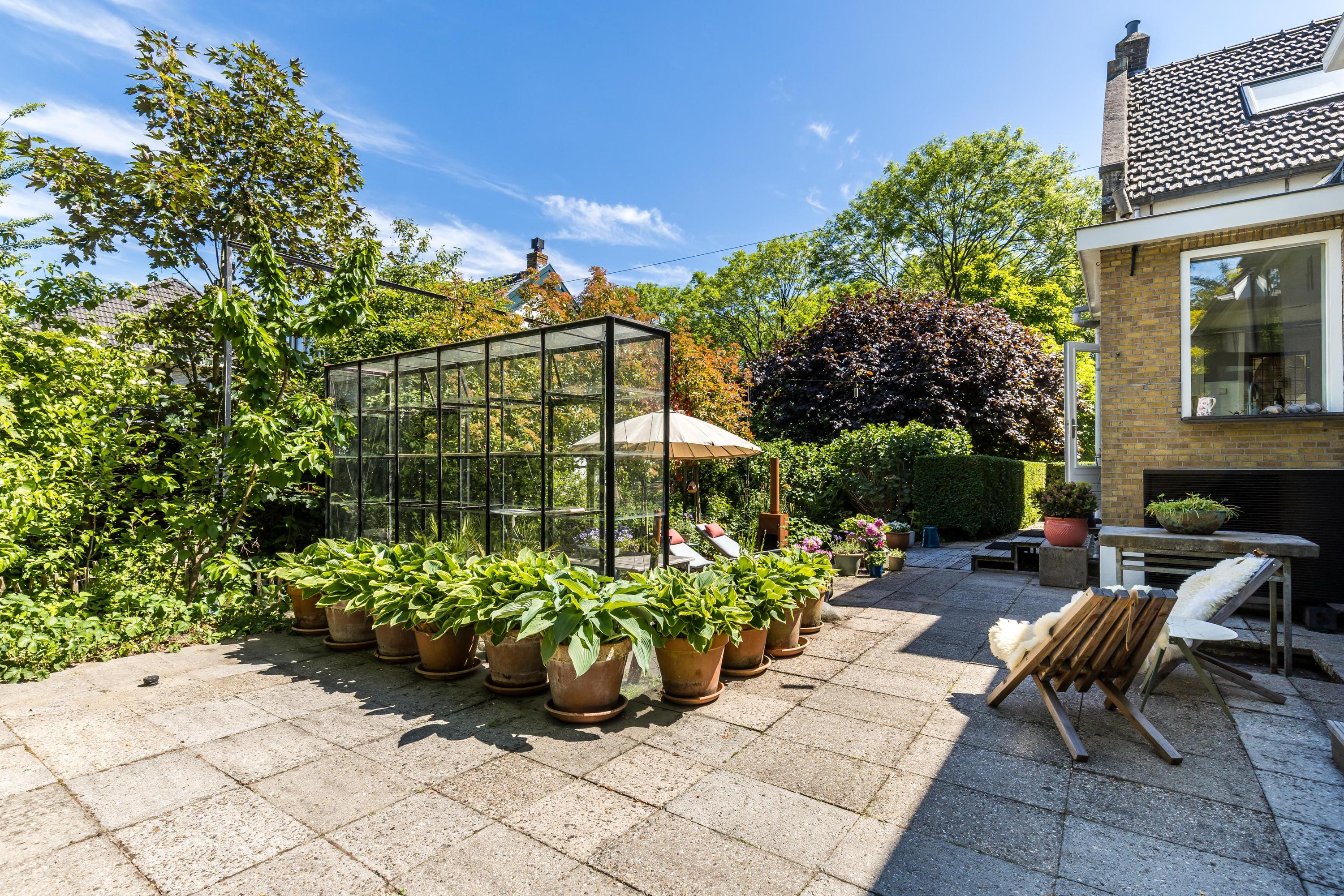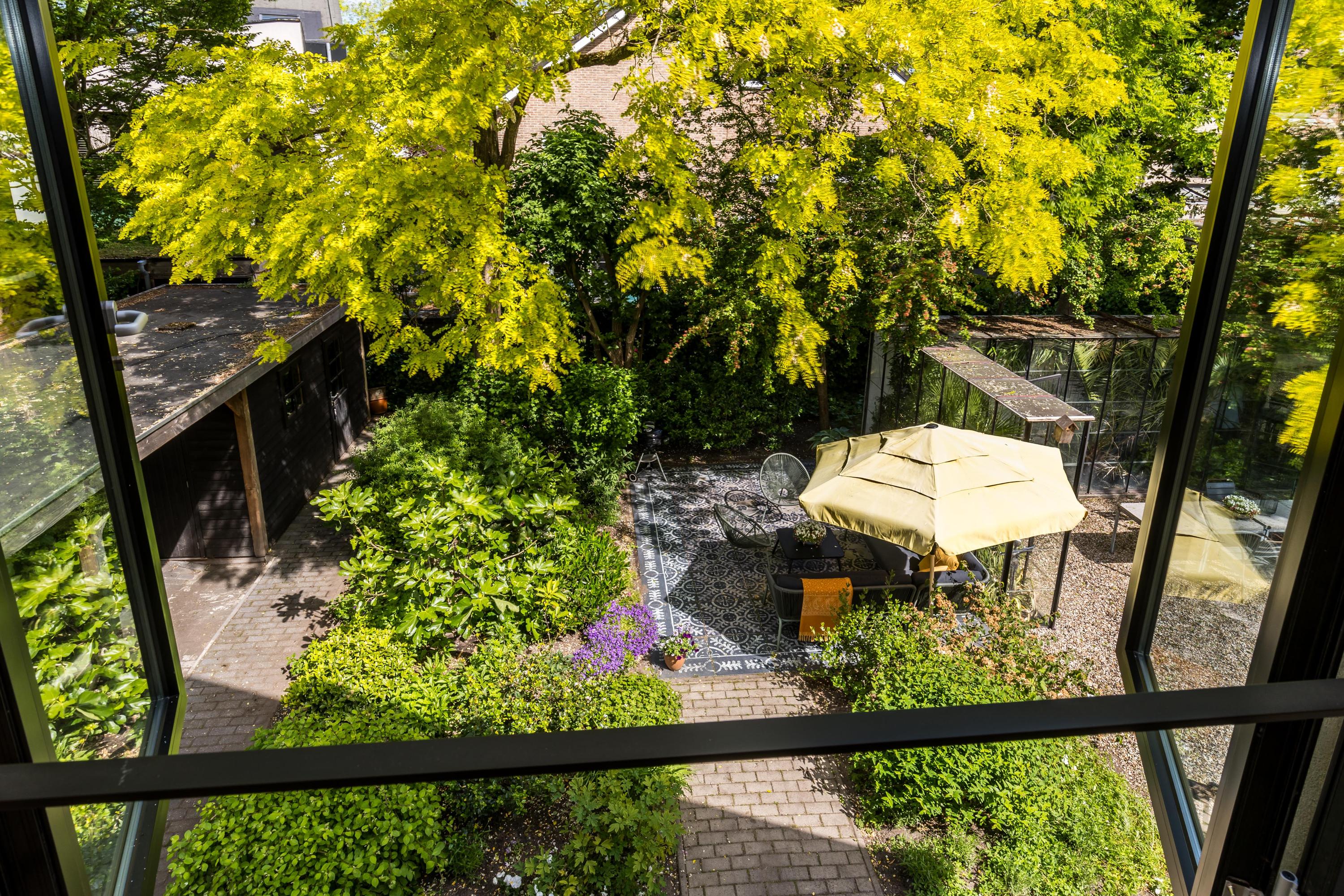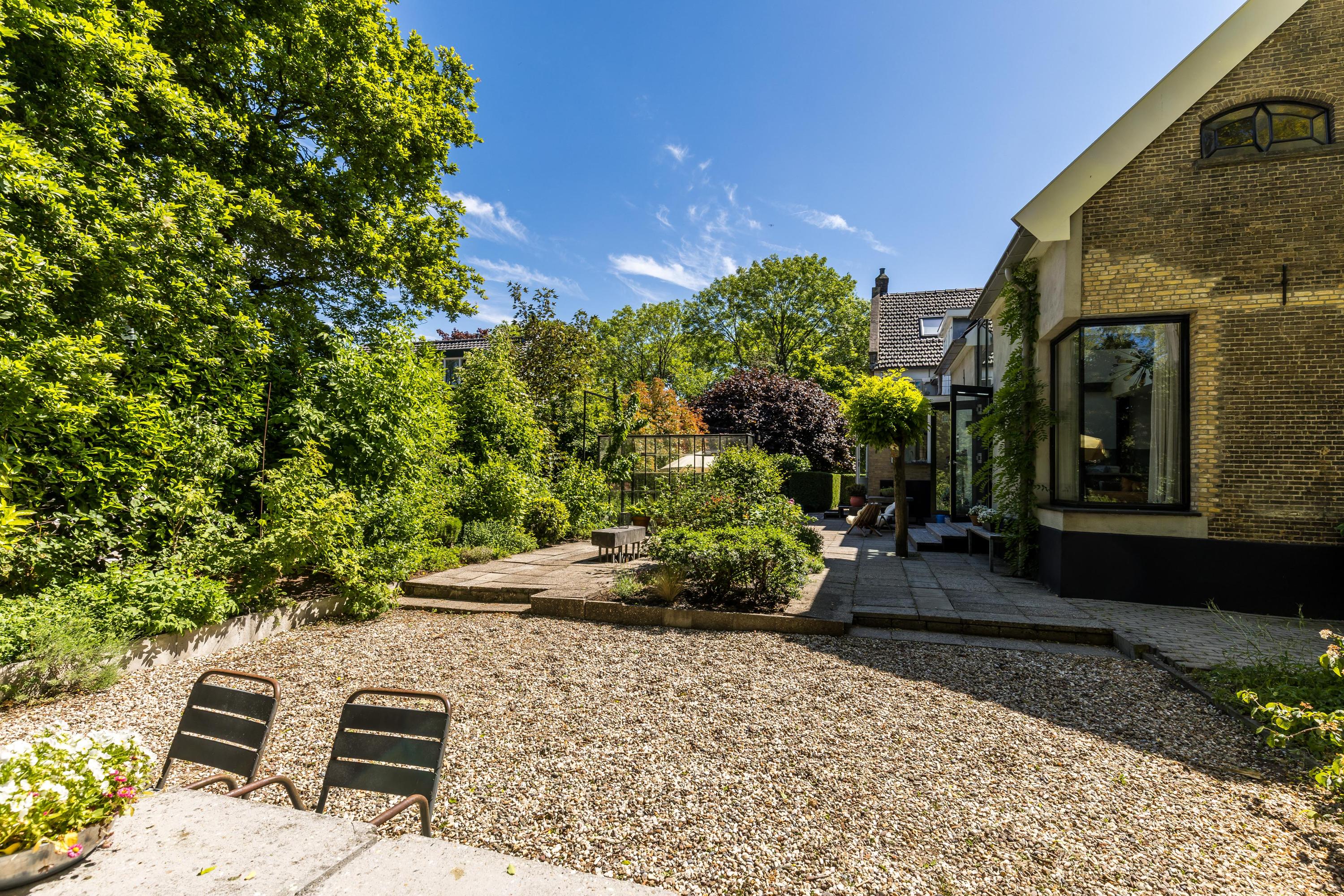 Entrance on the side of the house, spacious hall with toilet, wardrobe and staircase, attractive intermediate room with stained glass windows, cupboard space and a door to the kitchen, spacious wide living room with windows on three sides that provide lots of light, a beautiful wooden floor, high ceilings and a beautiful view, under the sitting room is also a (wine) cellar with daylight. The stained glass separation also leads to the kitchen, equipped with a kitchen unit and patio doors to the side garden and a door to the basement. From this kitchen there is access to the utility room with laundry room and heat pump installation. This utility room in turn provides access to the beautiful very spacious and garden-oriented kitchen in the back house with stairs to the first floor, a private toilet, a loft, high ceiling, large windows and patio doors to the garden.
