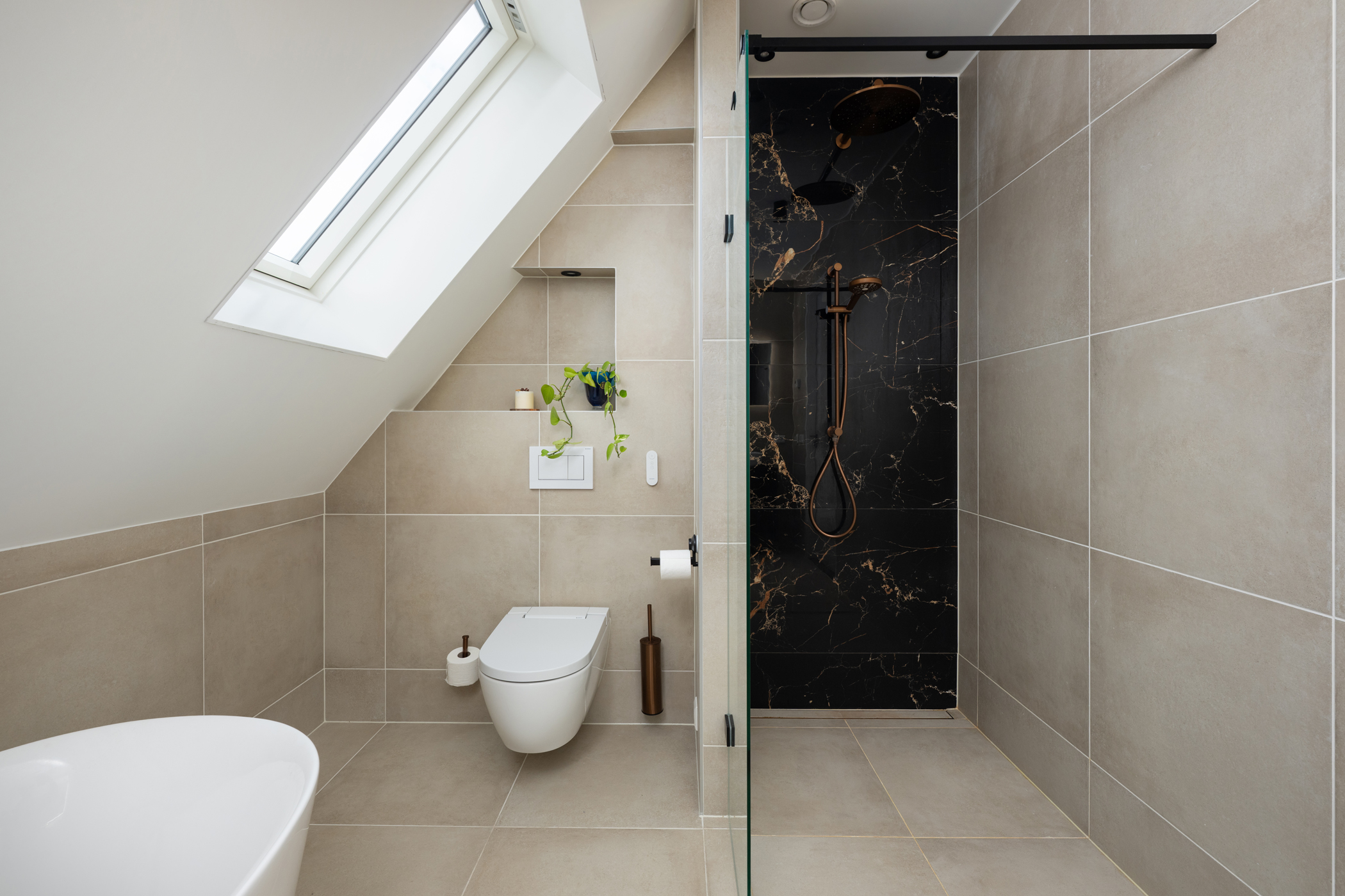 The modern bathroom features a bathtub, walk-in shower, toilet, double washbasin, and a heated, illuminated mirror.