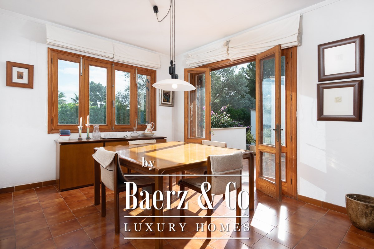Quality materials—parquet floors, air conditioning, gas central heating—create a quietly refined atmosphere. Outside, a large freshwater pool, summer kitchen with barbecue, and thoughtfully tended gardens set the stage for relaxed Mediterranean living. The villa includes a garage and terraces, all within Santa Ponça, a coastal enclave offering a refined promenade, reliable infrastructure, and swift access to Palma in twenty minutes and the airport in thirty. This property articulates location and potential in one of Mallorca’s most desirable addresses.