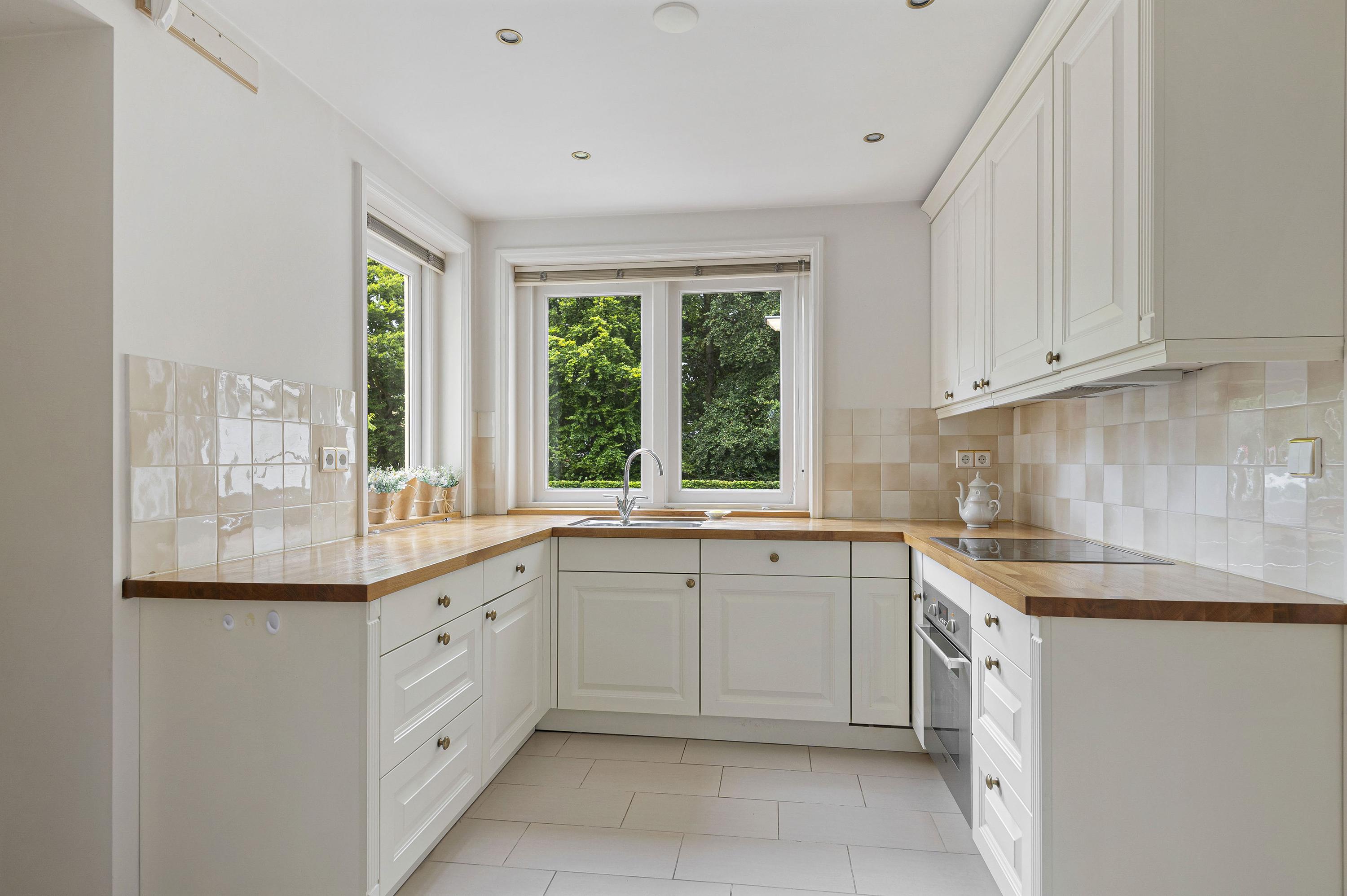 Entrance into very spacious hall, attractive stained glass windows, toilet and sunken wardrobe. The living room is arranged in L-shape, has lots of light, attractive gas fireplace and has a beautiful wooden parquet floor. The conservatory and second living room were later built so there is a lot of extra space created which gives multiple possibilities. The conservatory and second living room have a neat tiled floor with underfloor heating. The kitchen is located at the front of the house which also provides access to the spacious utility room.