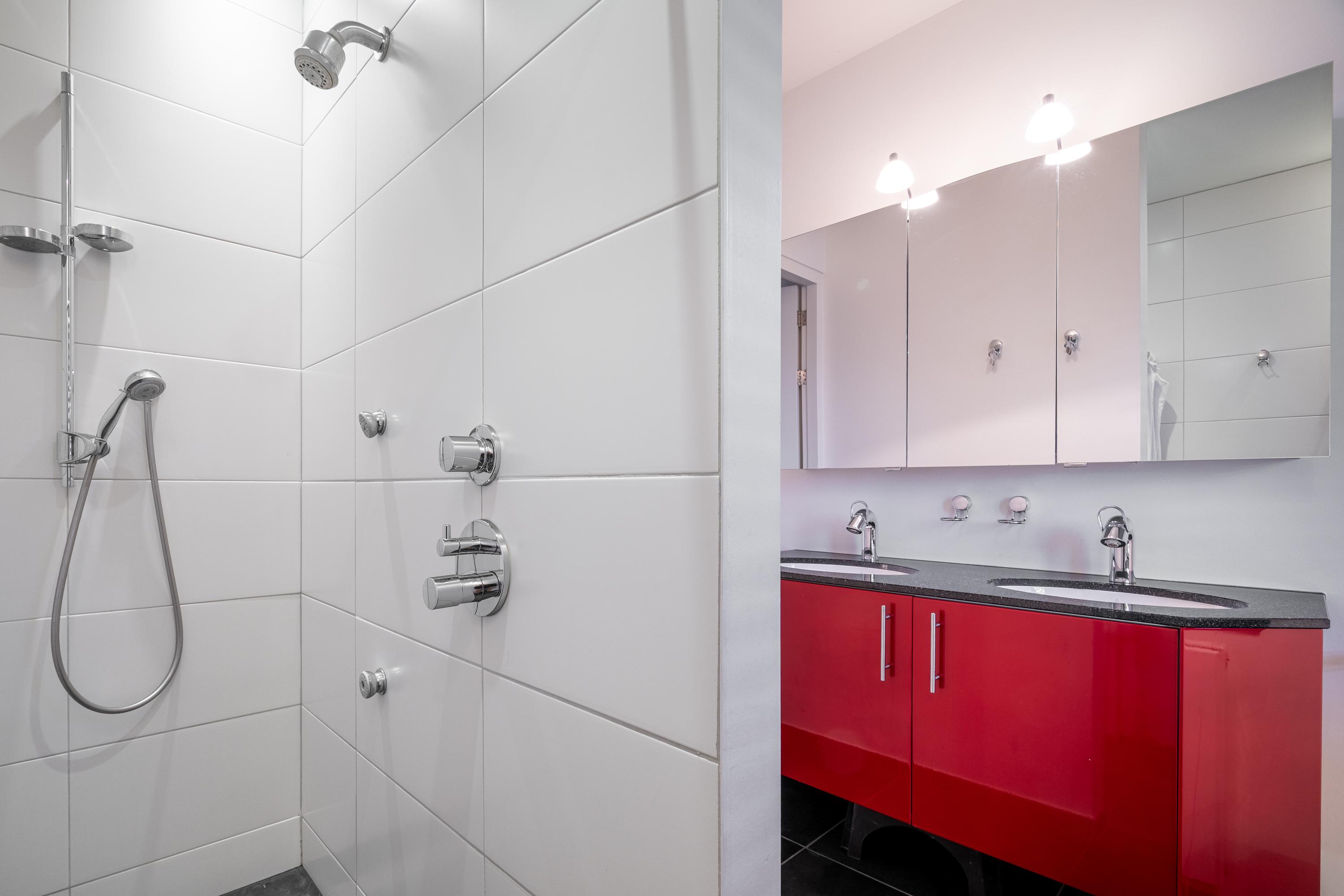 A fixed staircase leads to a landing with access to the walk-in closet, the boiler room, and the fourth bedroom with en-suite bathroom. The bedroom (approx. 29m²) has a practical dormer window and therefore offers a beautiful view of the garden. From the bedroom, there is open access to the third bathroom (13.5m²), which is equipped with a freestanding bathtub, double sink, walk-in shower, and toilet. The walk-in closet has custom-made cupboards on both sides.