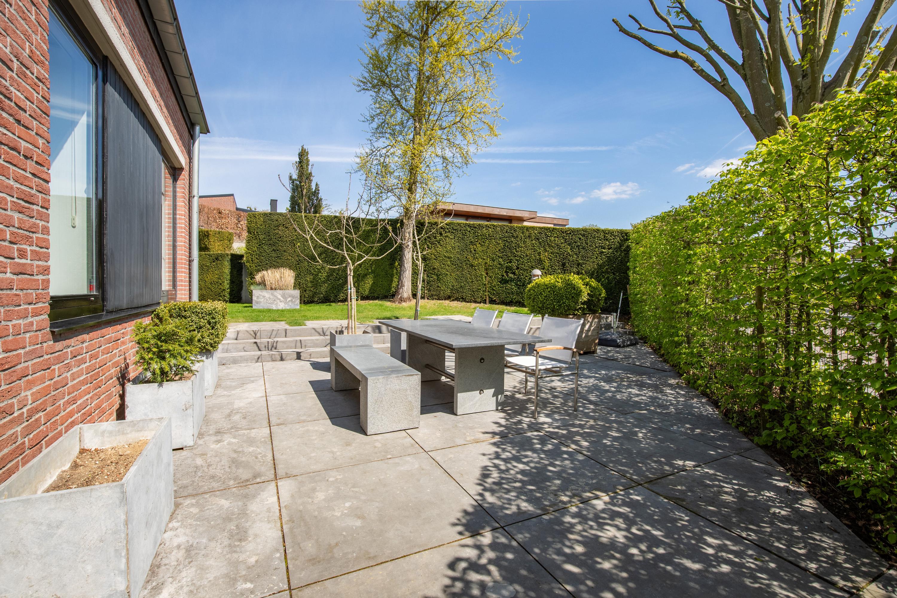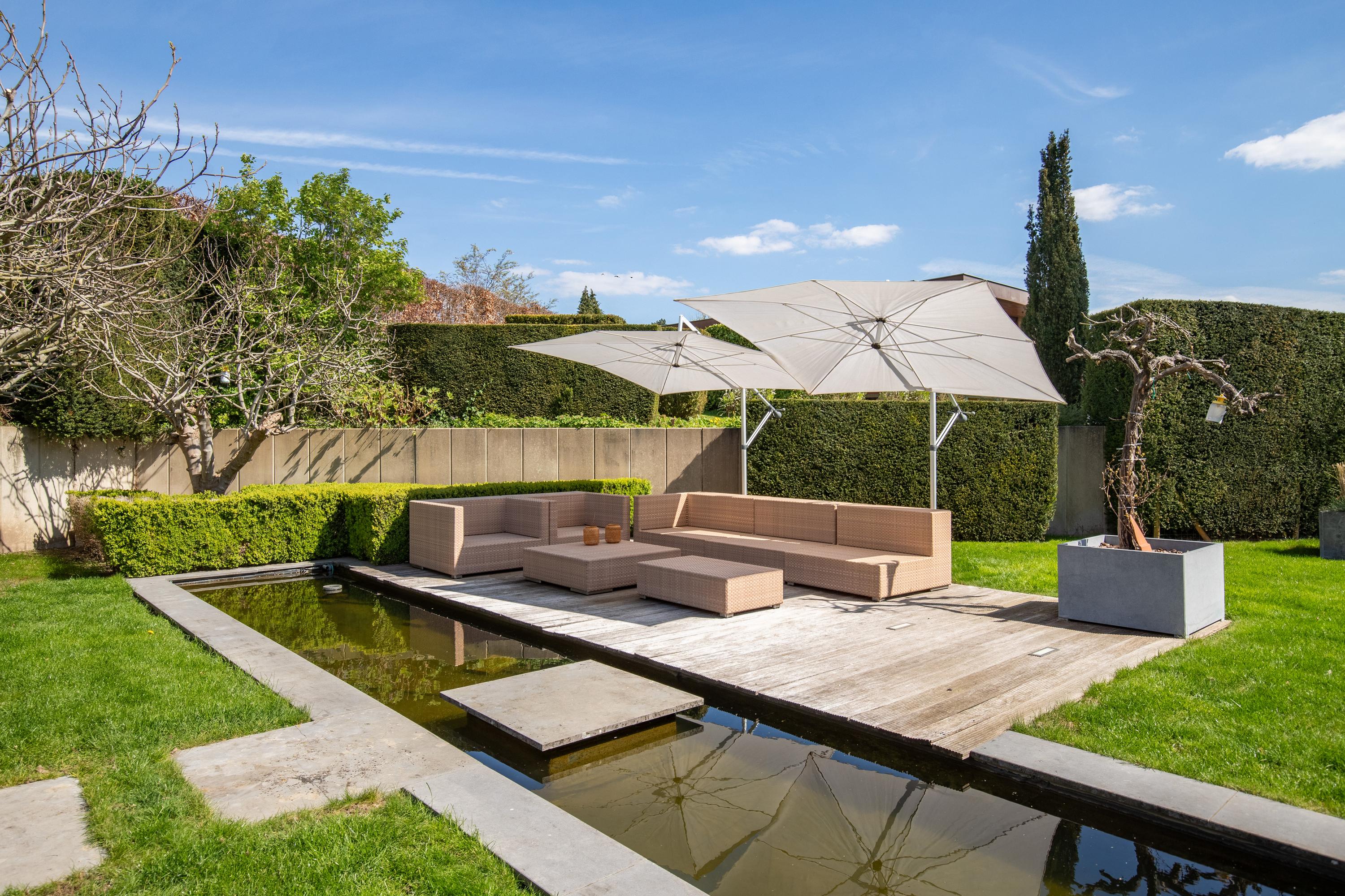 The sleeping areas are connected to the living room and kitchen via a hallway lined with windows on both sides. A beautifully tiled half-bathroom. Three bedrooms, some of which feature built-in closets. A spiral staircase leads from the master bedroom down to the pool at ground level. The tasteful and luxurious bathroom is finished with high-quality materials and accessible from the hallway. First, there is a spacious walk-in closet with built-in cabinetry, followed by access to the bathroom. This has been recently fitted with a wall-hung toilet, a walk-in shower with a tempered glass screen, a freestanding bathtub, and a bathroom vanity featuring a full-width sink with a mirrored wall. The walls and floor feature a distinctive finish with large, ultra-thin ceramic tiles laid seamlessly. Finally, ceiling lighting with elegant recessed spotlights has been installed. The bathroom features underfloor heating. From each of the living areas, there is a direct connection to the exterior of the villa and a magnificent view of the rolling hills and the architecturally landscaped garden. Surrounding the villa are exquisitely landscaped terraces where one can enjoy the sun or shade. A water feature in an elongated concrete element with a wooden deck tastefully completes the ensemble. The beautiful fig trees are a true eye-catcher in the garden. The garden is also accessible from the front and side.