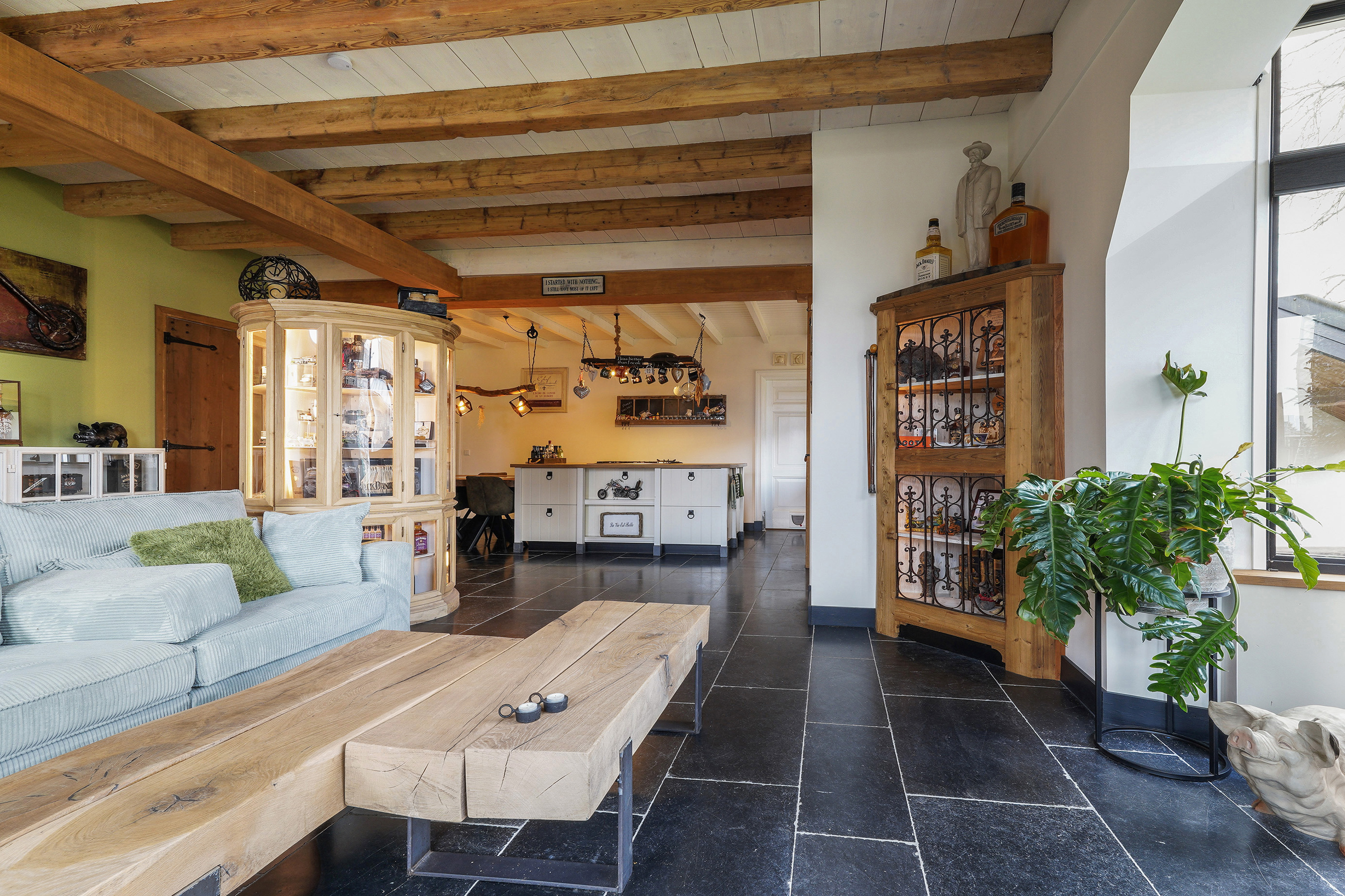 De aangrenzende garage doet zijn naam geen eer aan. Met een oppervlakte van circa 160 m², een grote sectionaaldeur aan de achterzijde van 3,5 meter breed én hoog, een vliering en extra inpandige ruimtes is dit een droom voor liefhebbers van auto’s, stallen van een camper, verzamelaars of hobbyisten. Een grote bus rijdt hier moeiteloos naar binnen. En dan hebben we het nog niet eens over de overige inpandige ruimtes gehad, want met de zolder boven de bar beschikt de woning in het geheel over ruim 300 m² aan extra ruimte naast de woonoppervlakte.