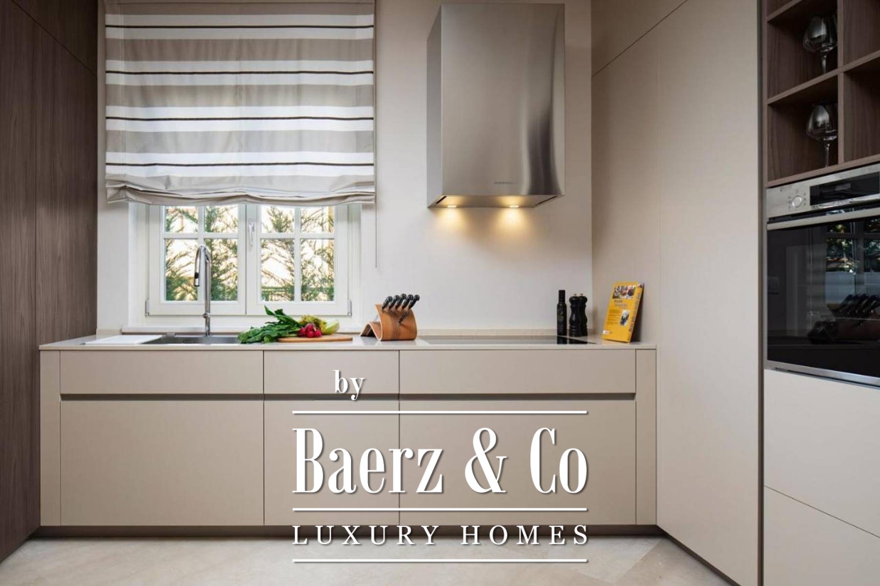 The ground floor’s central living room invites natural light and garden views, flowing into a kitchen and dining area designed for both gathering and privacy. From here, glass doors connect to a covered terrace, complete with a dedicated grill area set beside the 33 m² swimming pool, offering tranquility within this green oasis. One bedroom with en suite bathroom and direct pool access completes the ground level.