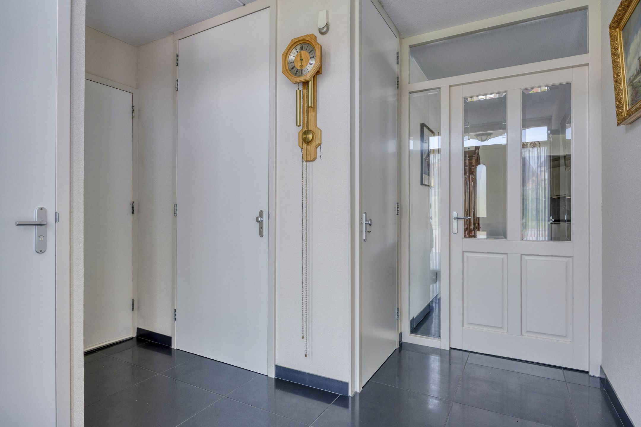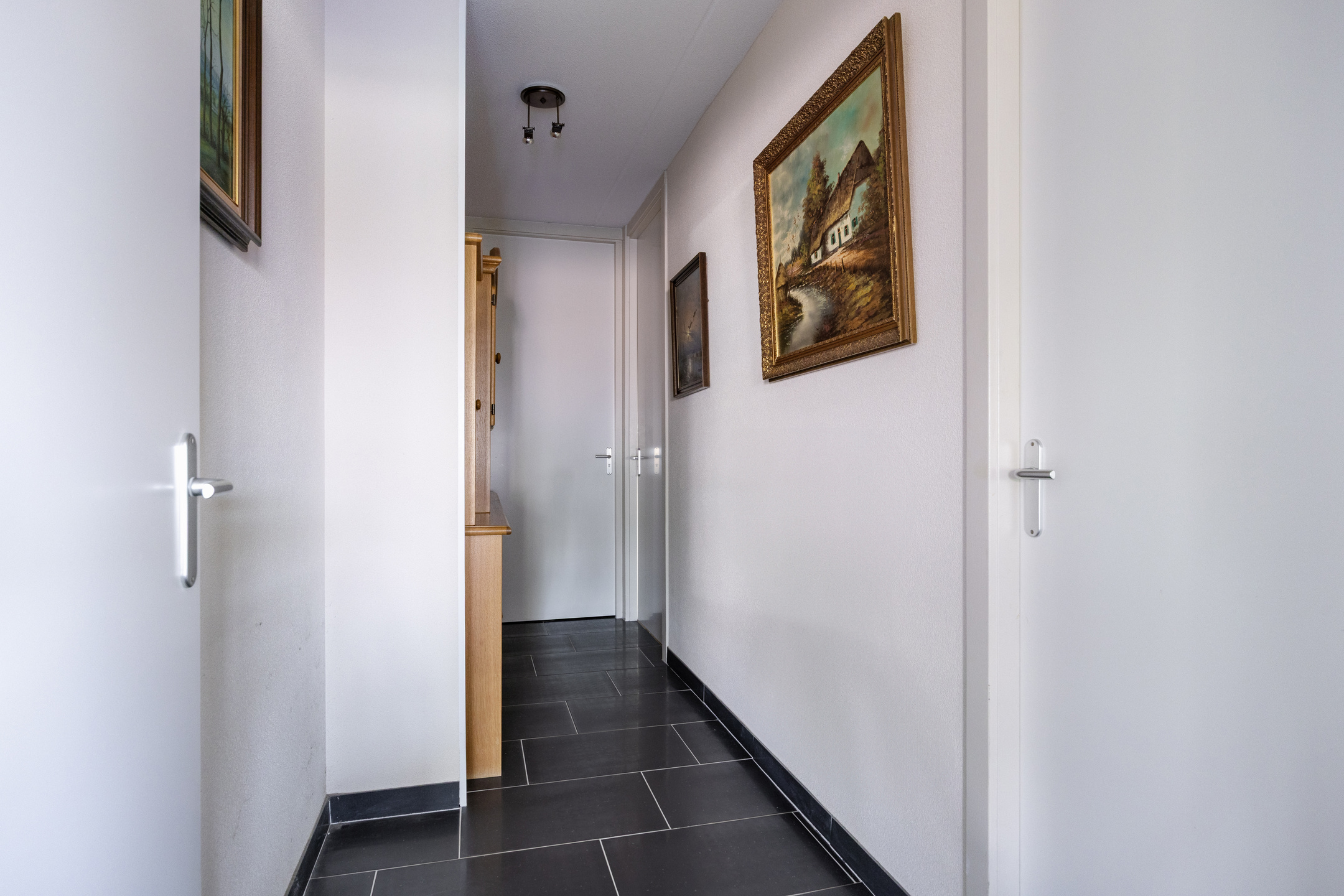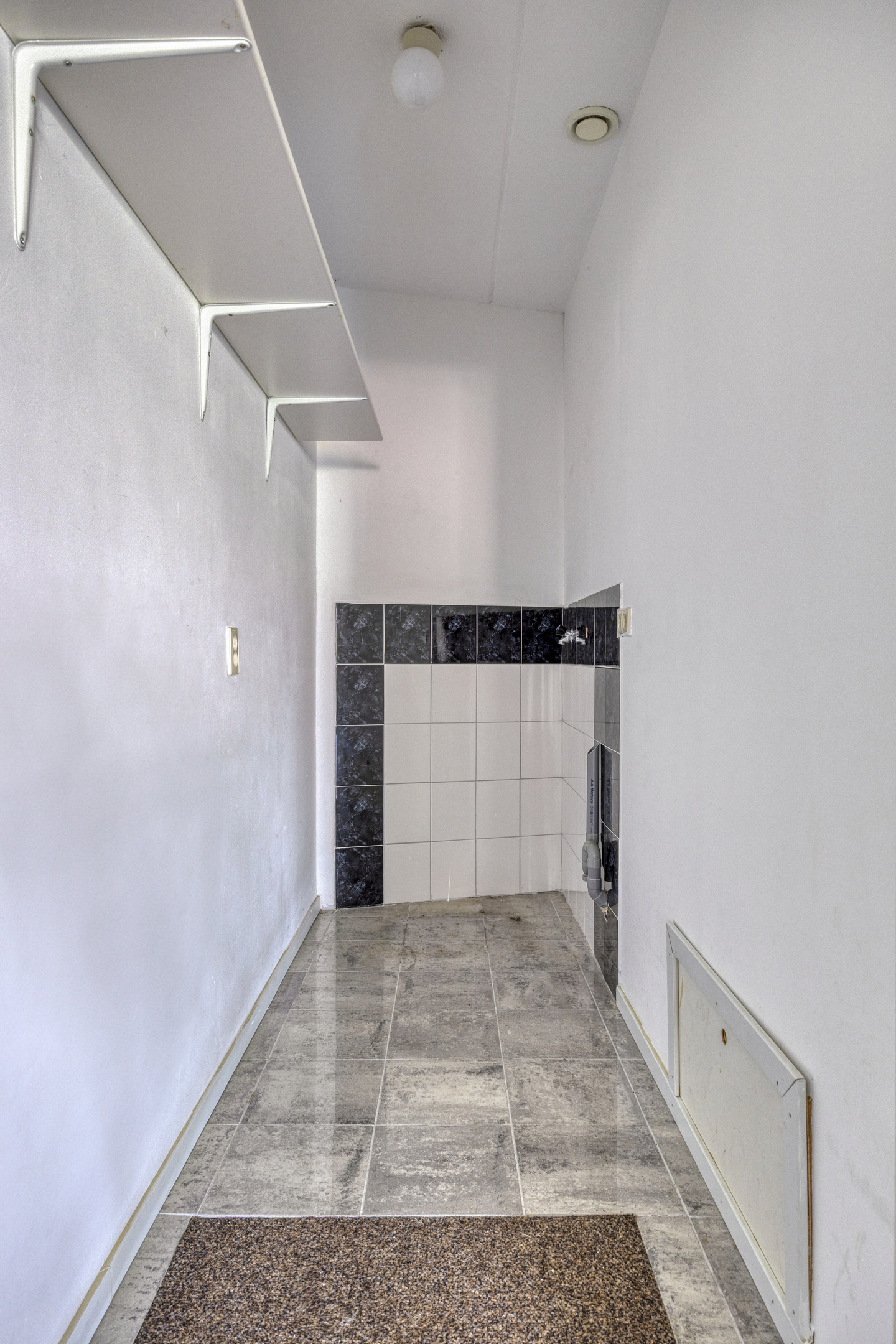 Hallway / entrance with storage closet with HR-combi boiler and WTW unit, wall finish stucco, tile floor with hatch to the crawl space, ceiling finished with spraying;