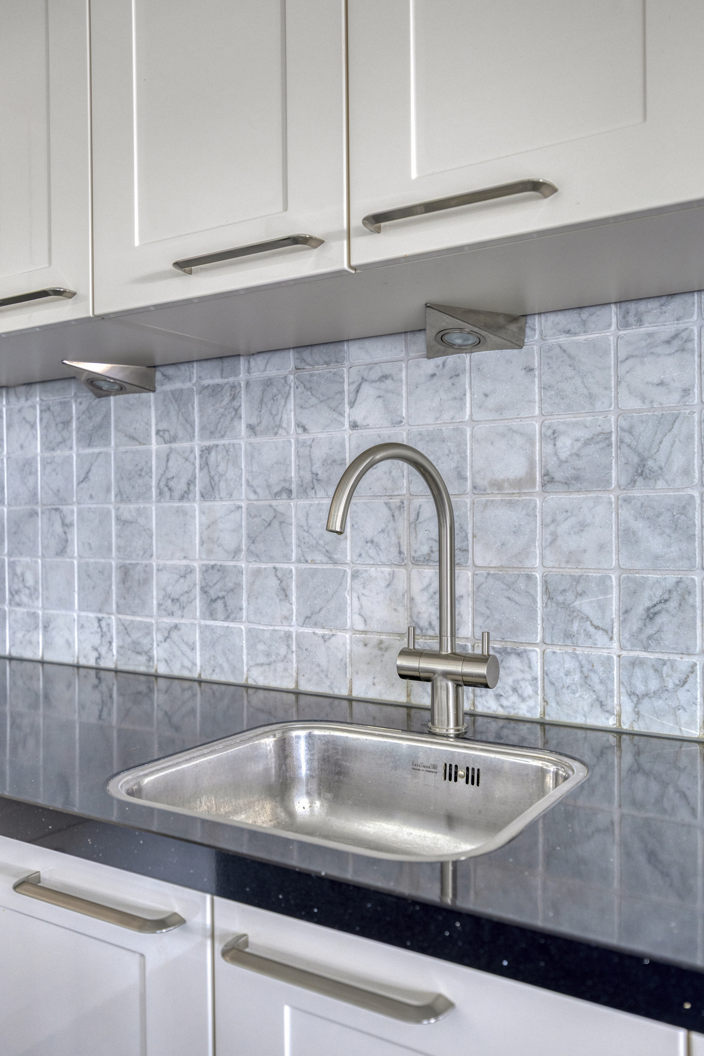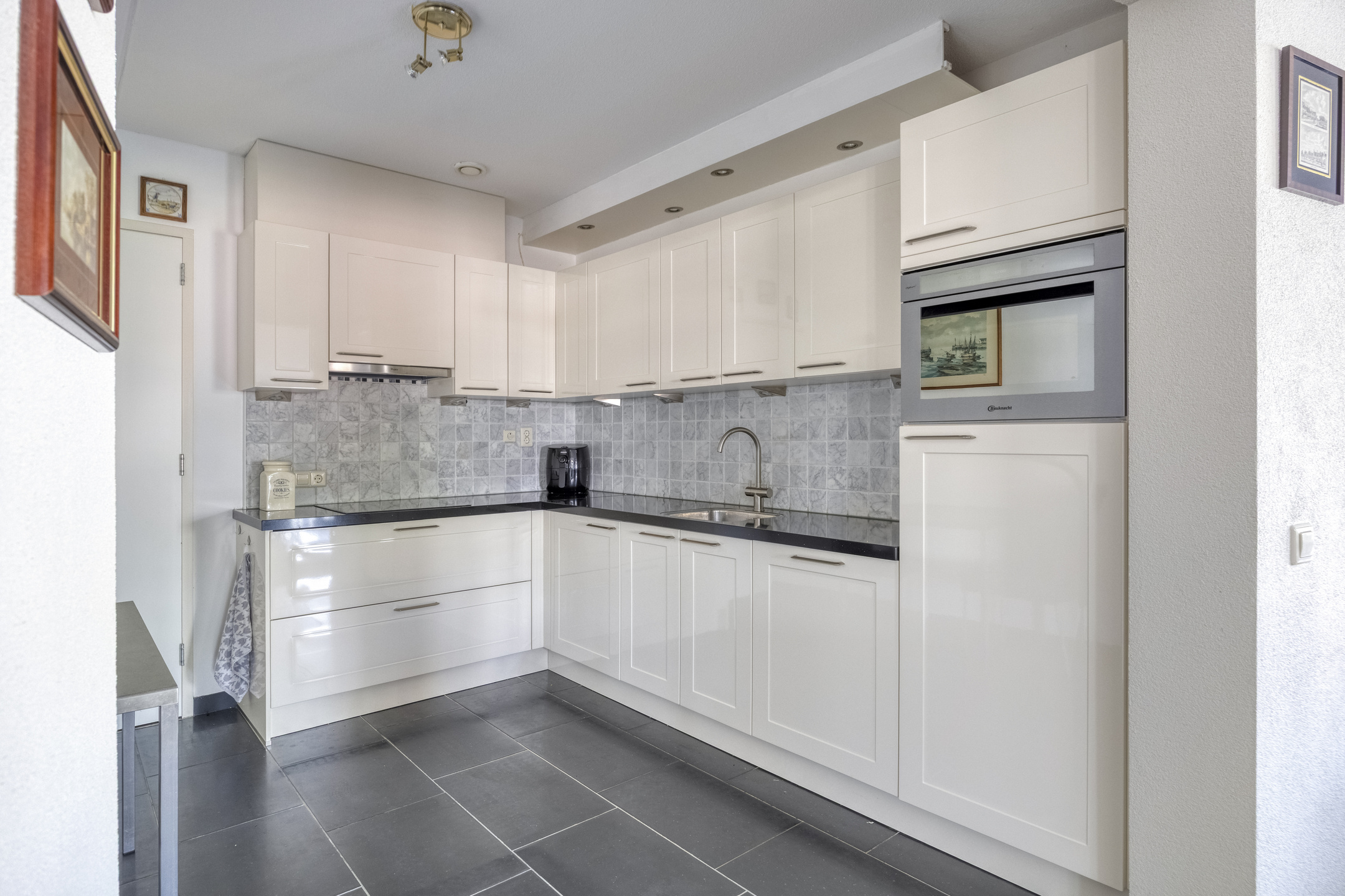 Semi open kitchen with corner kitchen (2013), equipped with a granite countertop with sink, built-in induction hob, -cooler, -combi oven/microwave, -dishwasher and an extractor hood, wall finish stucco, tiled floor, ceiling finished with painting;