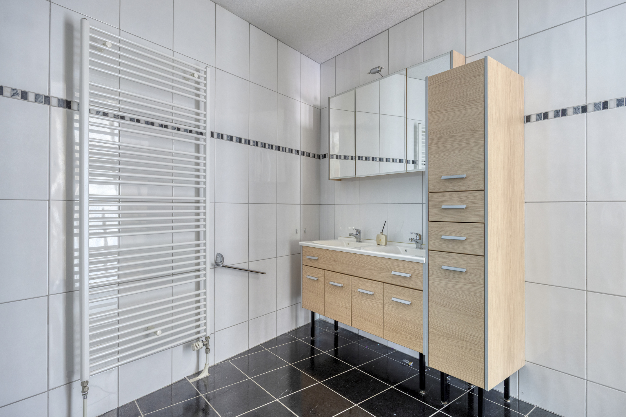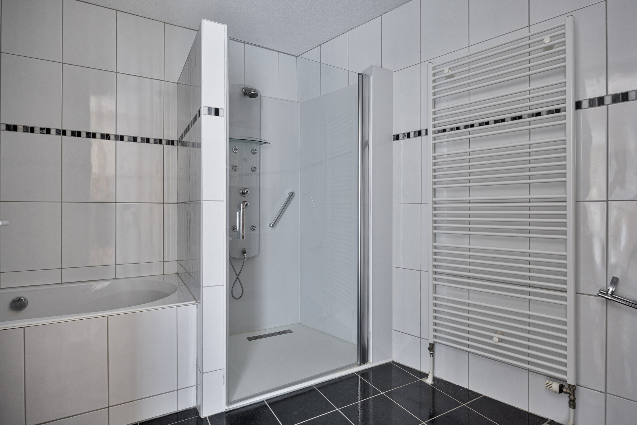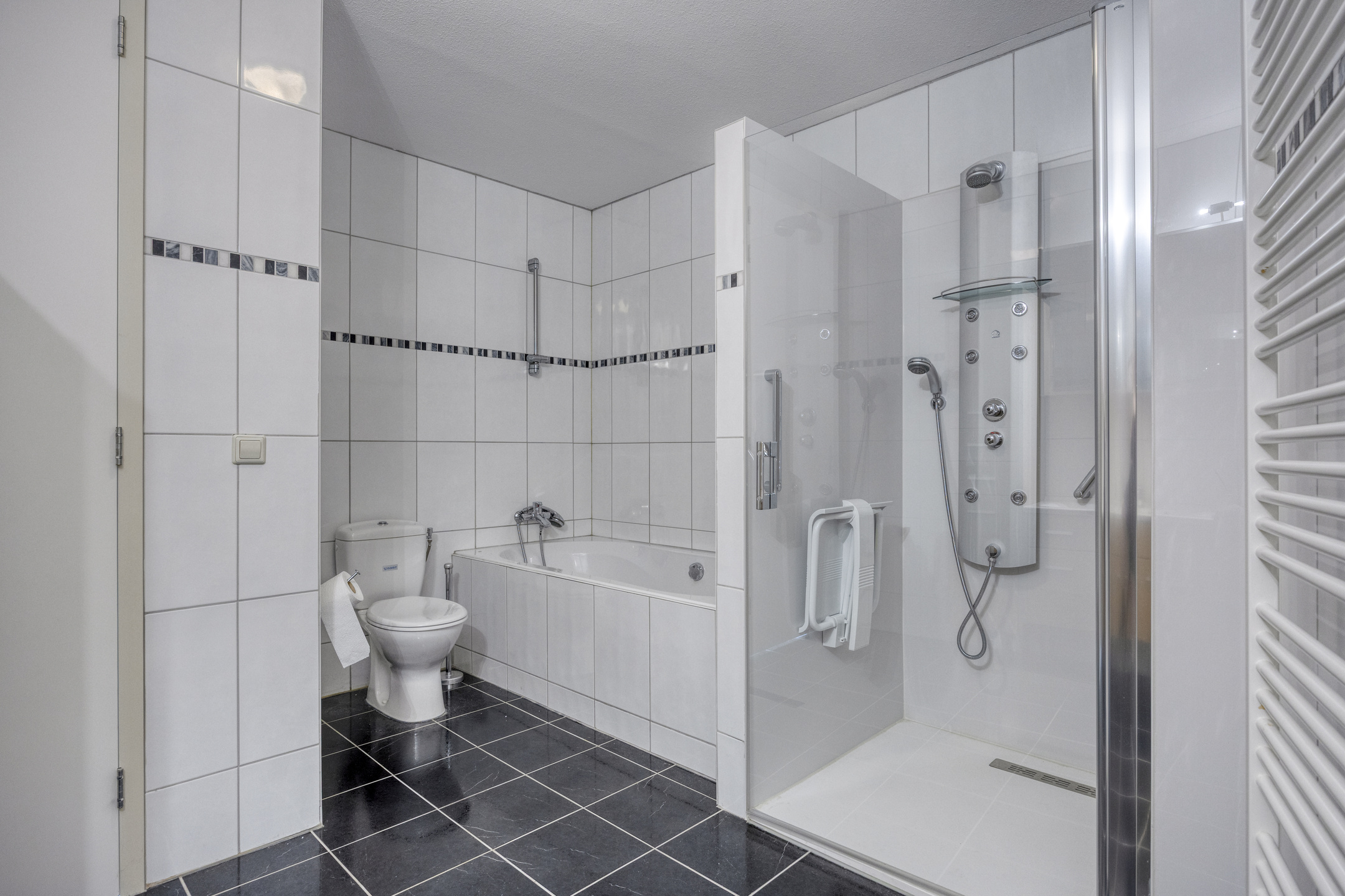 tiled bathroom, equipped with a bathtub, shower cubicle with jets and massage panel with low entry, toilet, bathroom cabinet with double sink and a radiator;