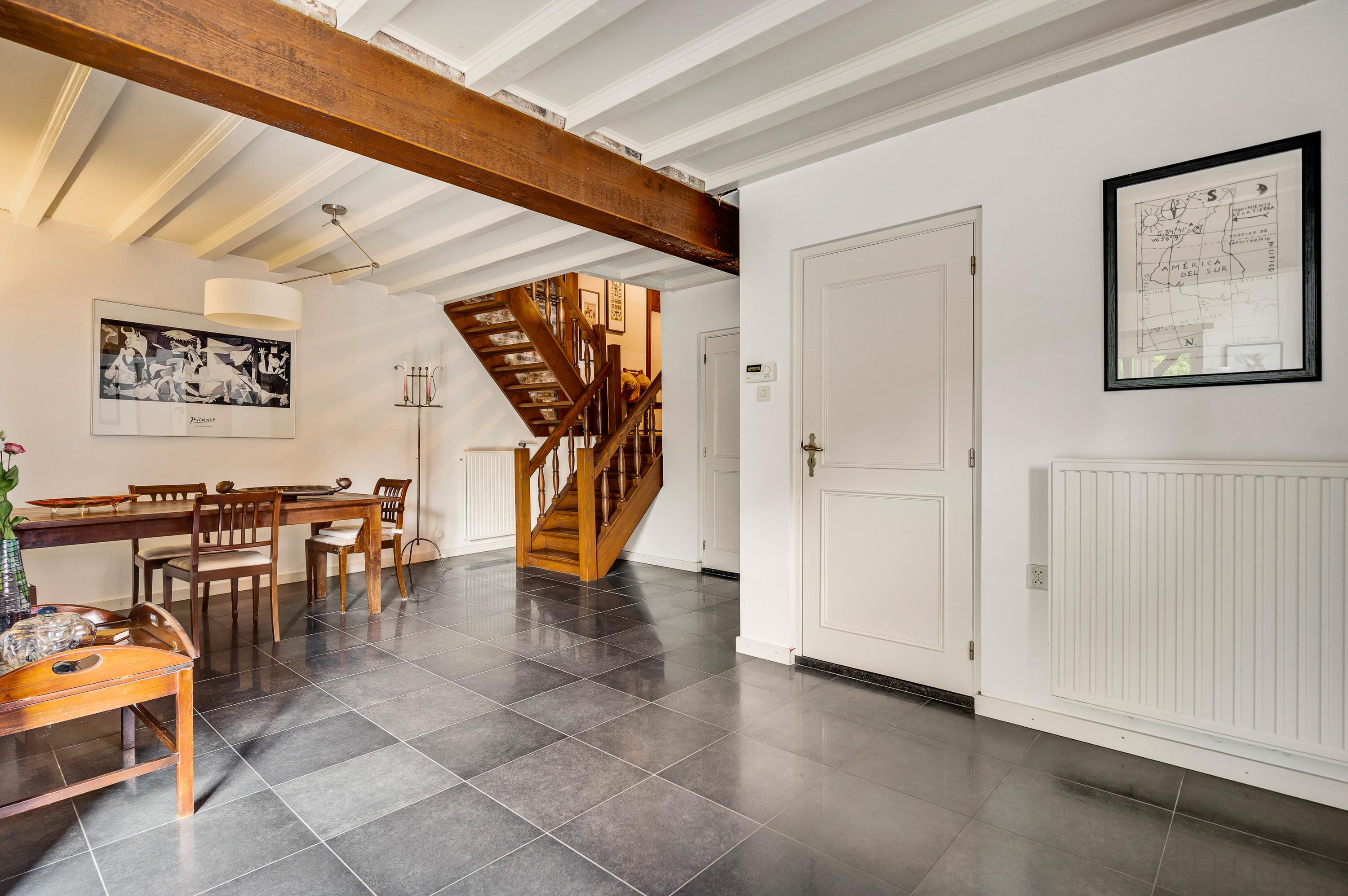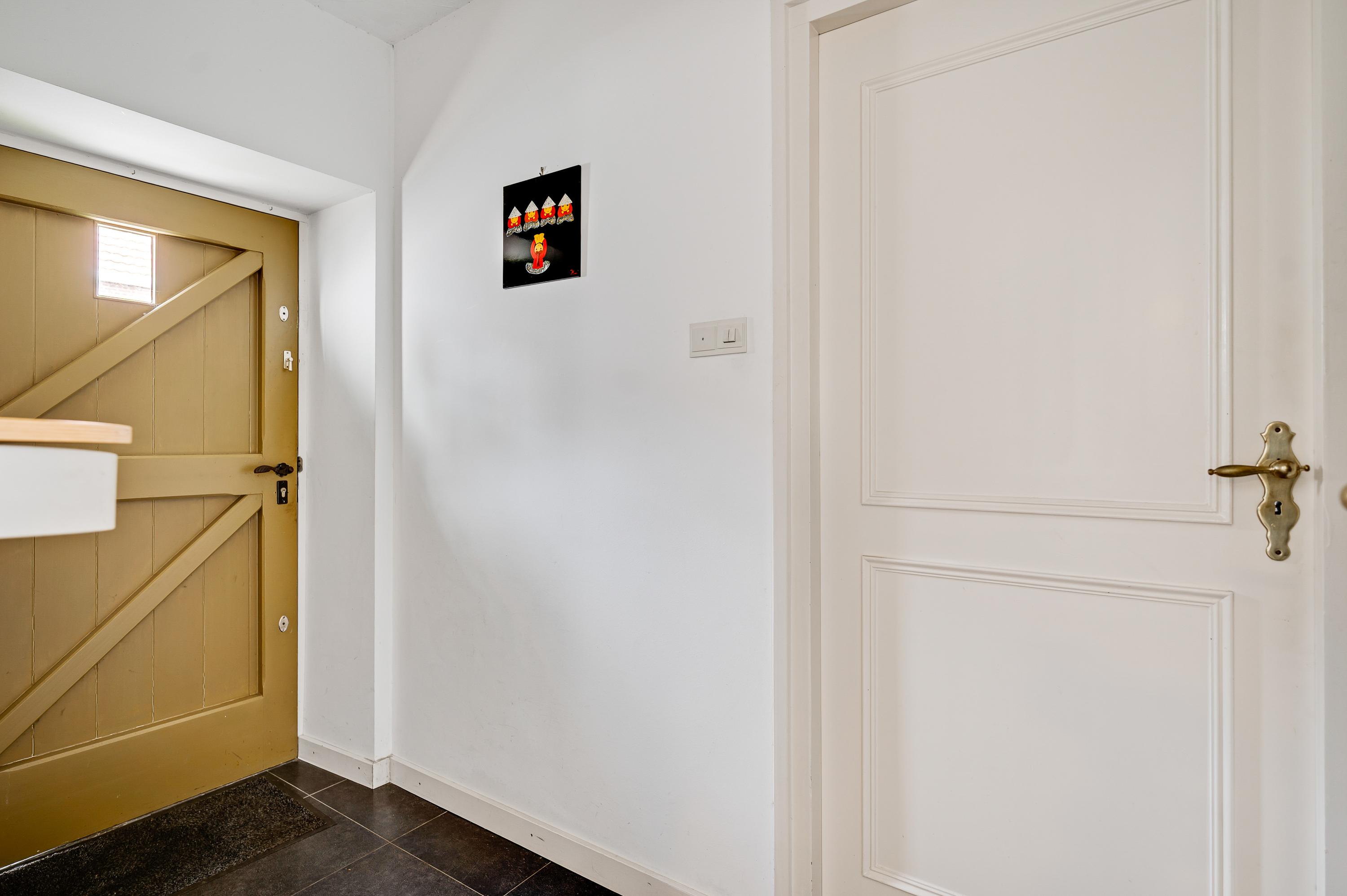 The spacious hall with a fireplace and meter cupboard provides access to the toilet, a bedroom with a separate bathroom, and the kitchen. The stairs to the first floor are also accessible from the hall. The hall also served as the B&B's former living room. This space can be used for various purposes.