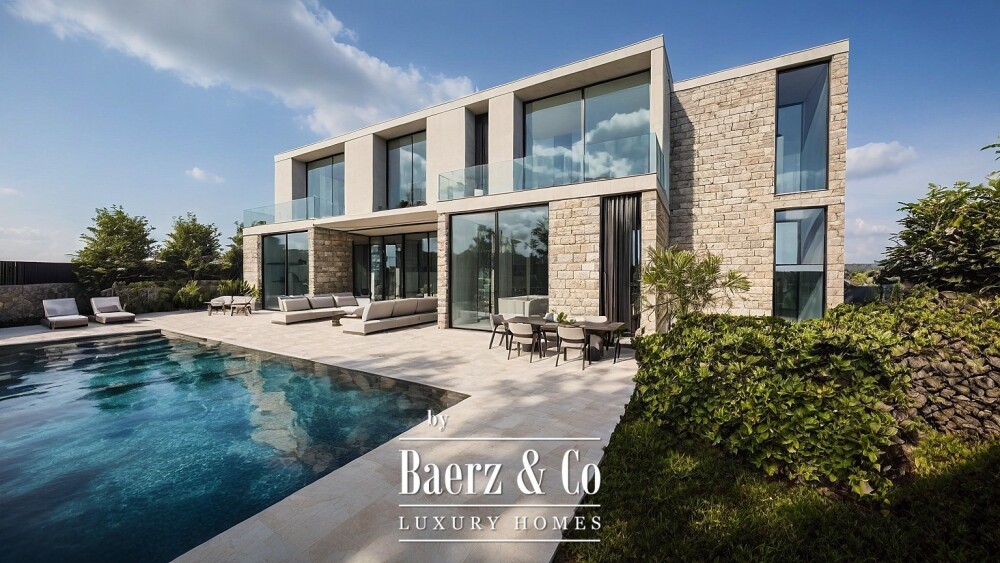 Entering the property, seamless flows of natural light define the spatial rhythm, inviting the outdoors in through expansive windows. The ground floor features interconnected living areas that open directly onto a landscaped garden and swimming pool, ideal for embracing the climate year round. The east wing houses a spacious kitchen with a central island, while the central dining area forms the heart of the home. To the west, a bright living room offers refined comfort, all oriented toward the Mediterranean to maximize sea views.