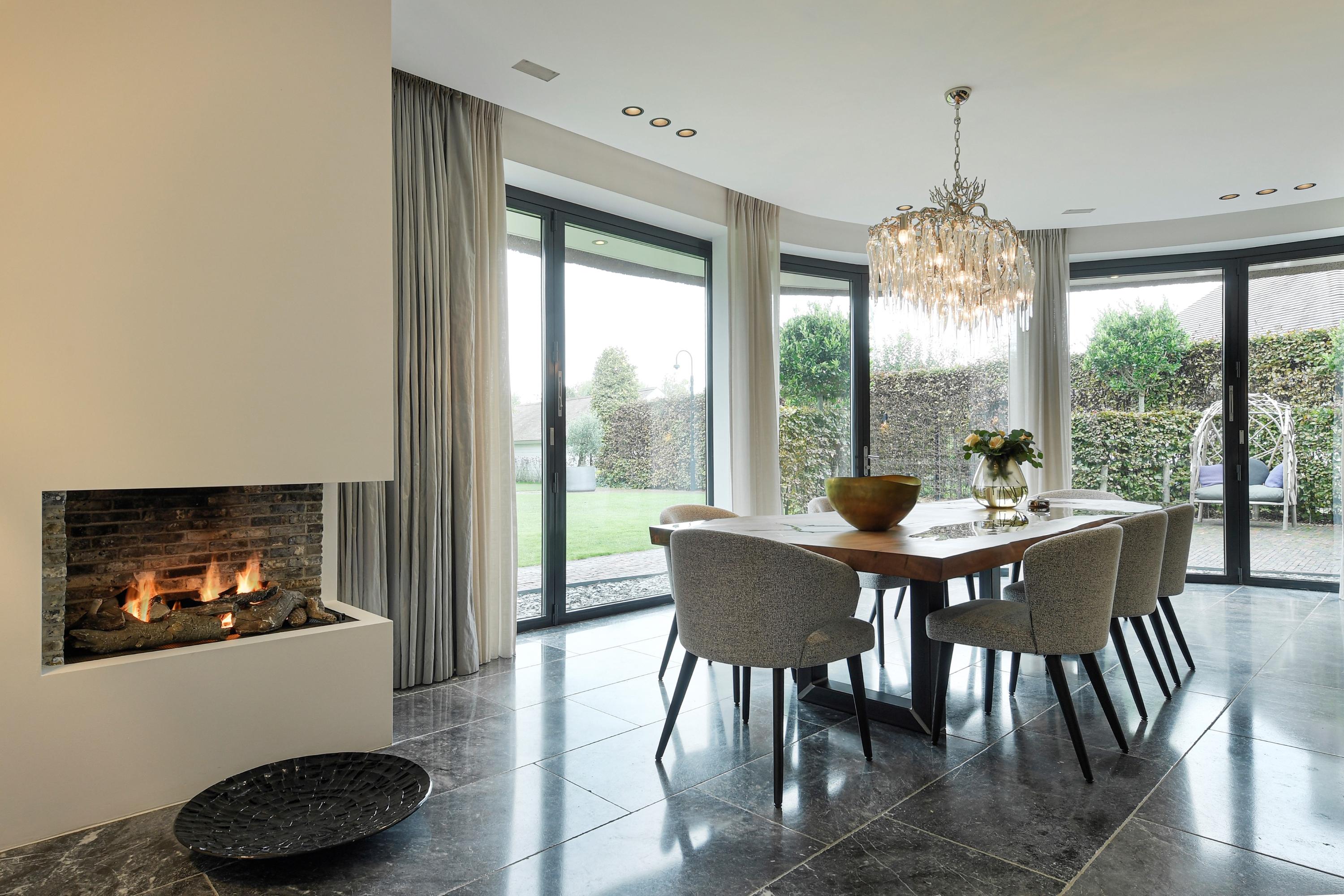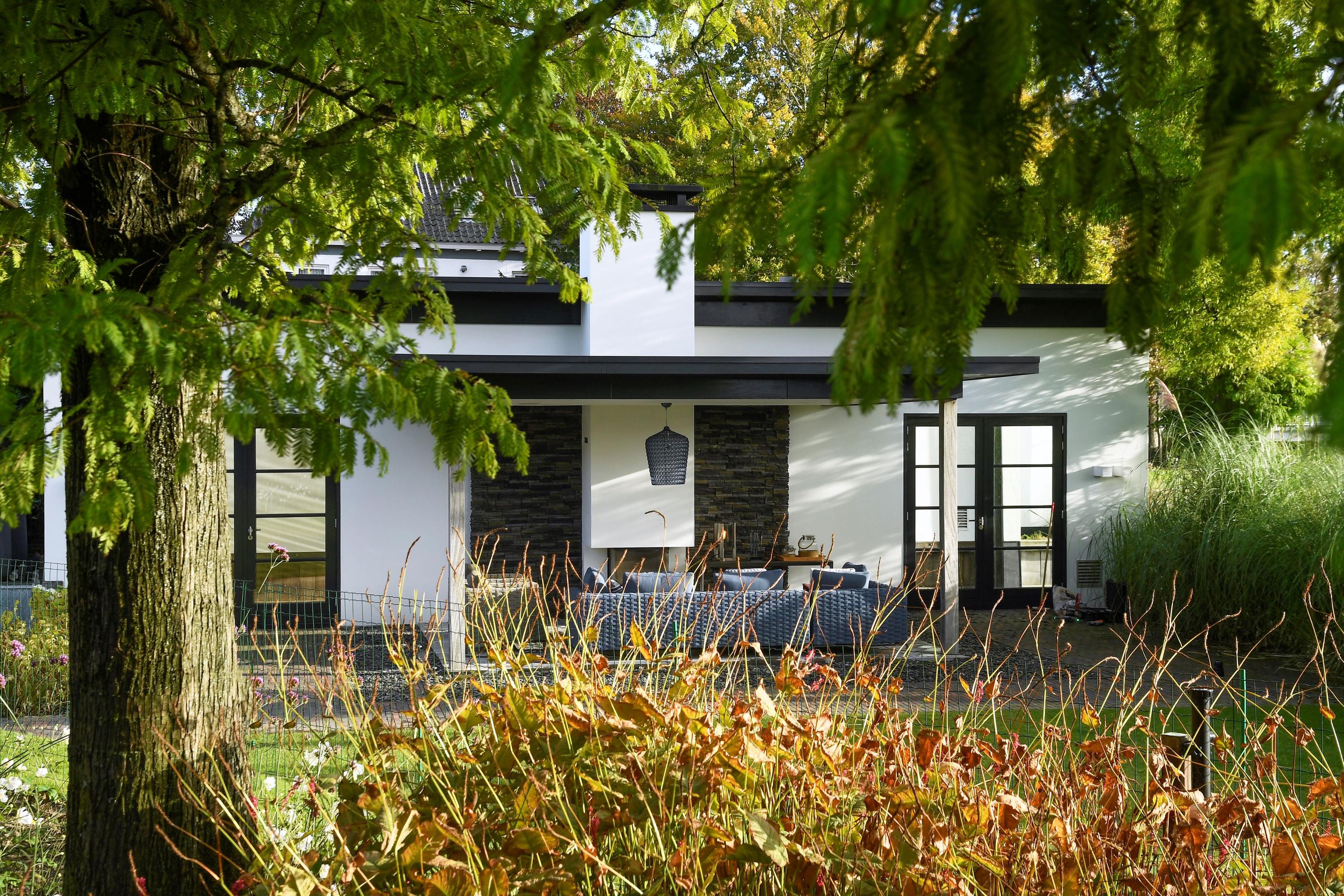 Gardens designed by a landscape architect frame terraces and a 53 m² boathouse with remote-controlled lift, enabling private access to Dutch waterways. An adjacent covered veranda with wood-burning fireplace allows year-round enjoyment outdoors.