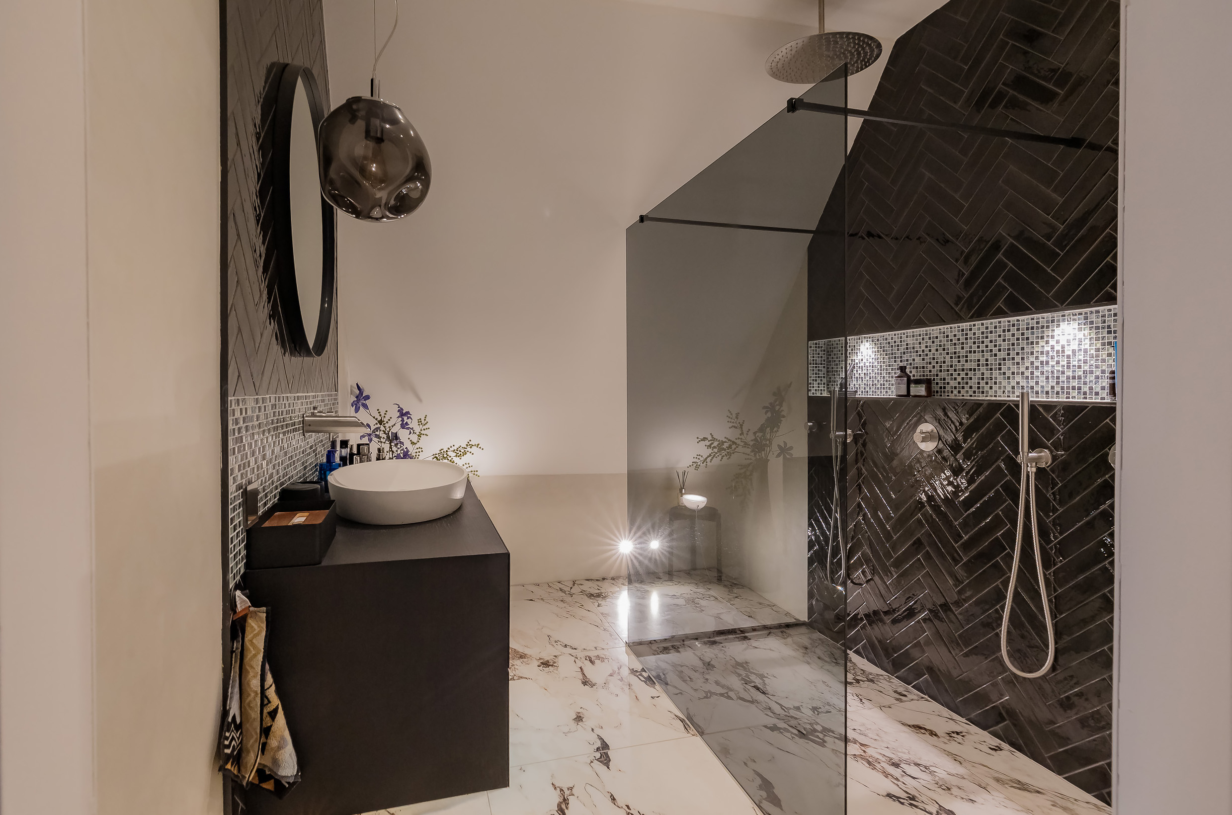 Upstairs, the master suite functions as both a personal retreat and saferoom, offering panoramic water views, gas fireplace, and a luxurious bathroom with jacuzzi, sunshower, and bespoke walk-in dressing. Three guest rooms and a second refined bathroom ensure comfort for family and friends.