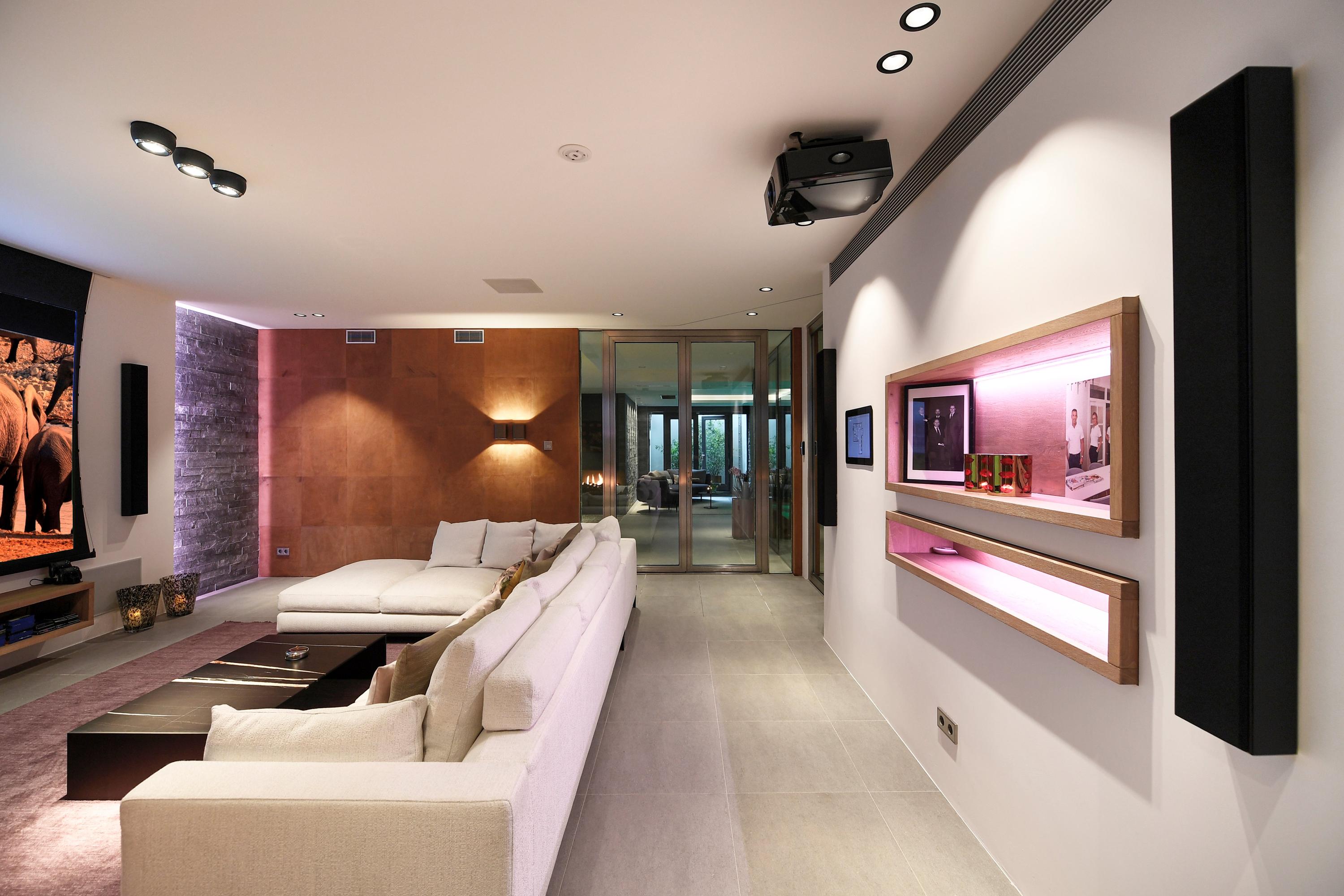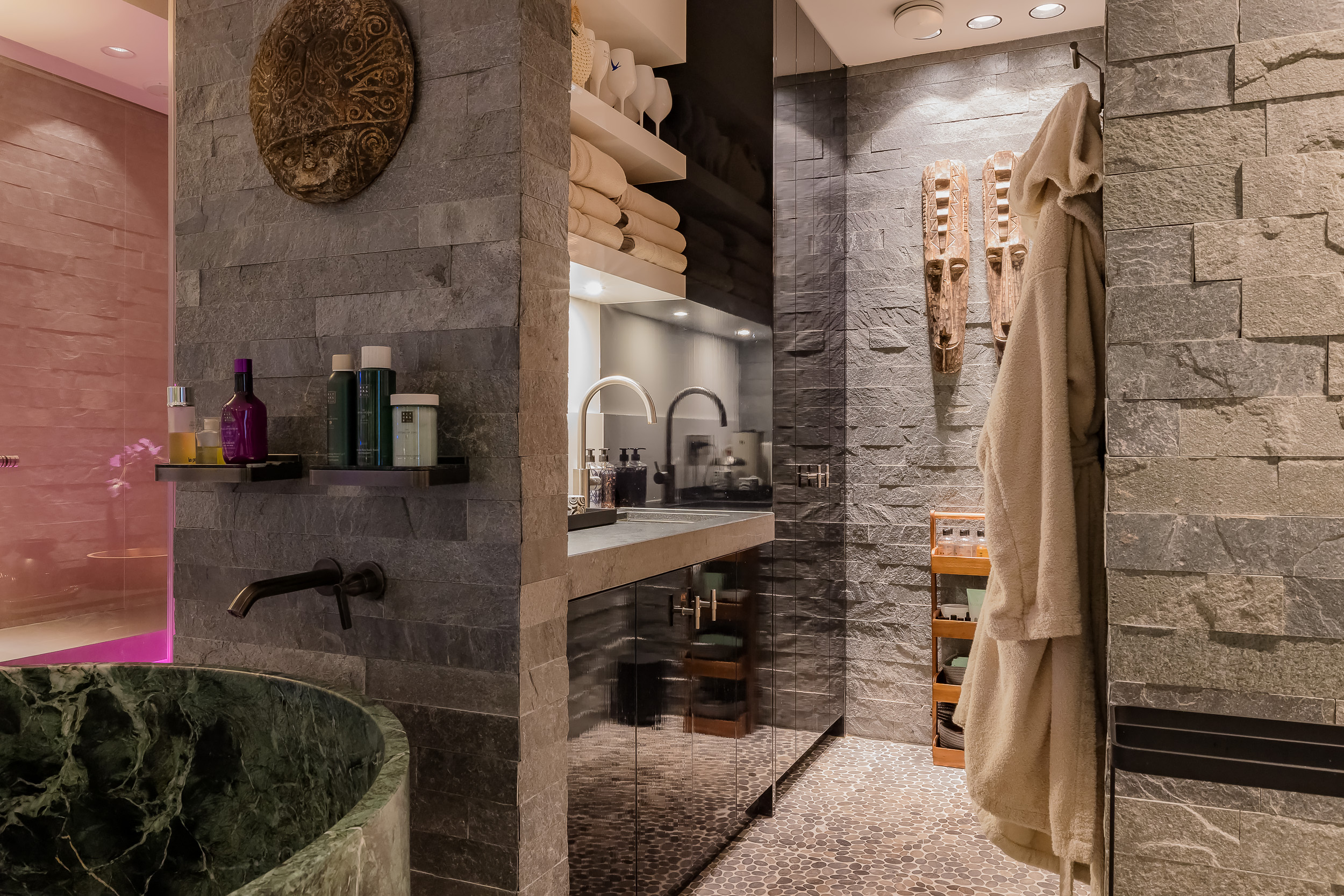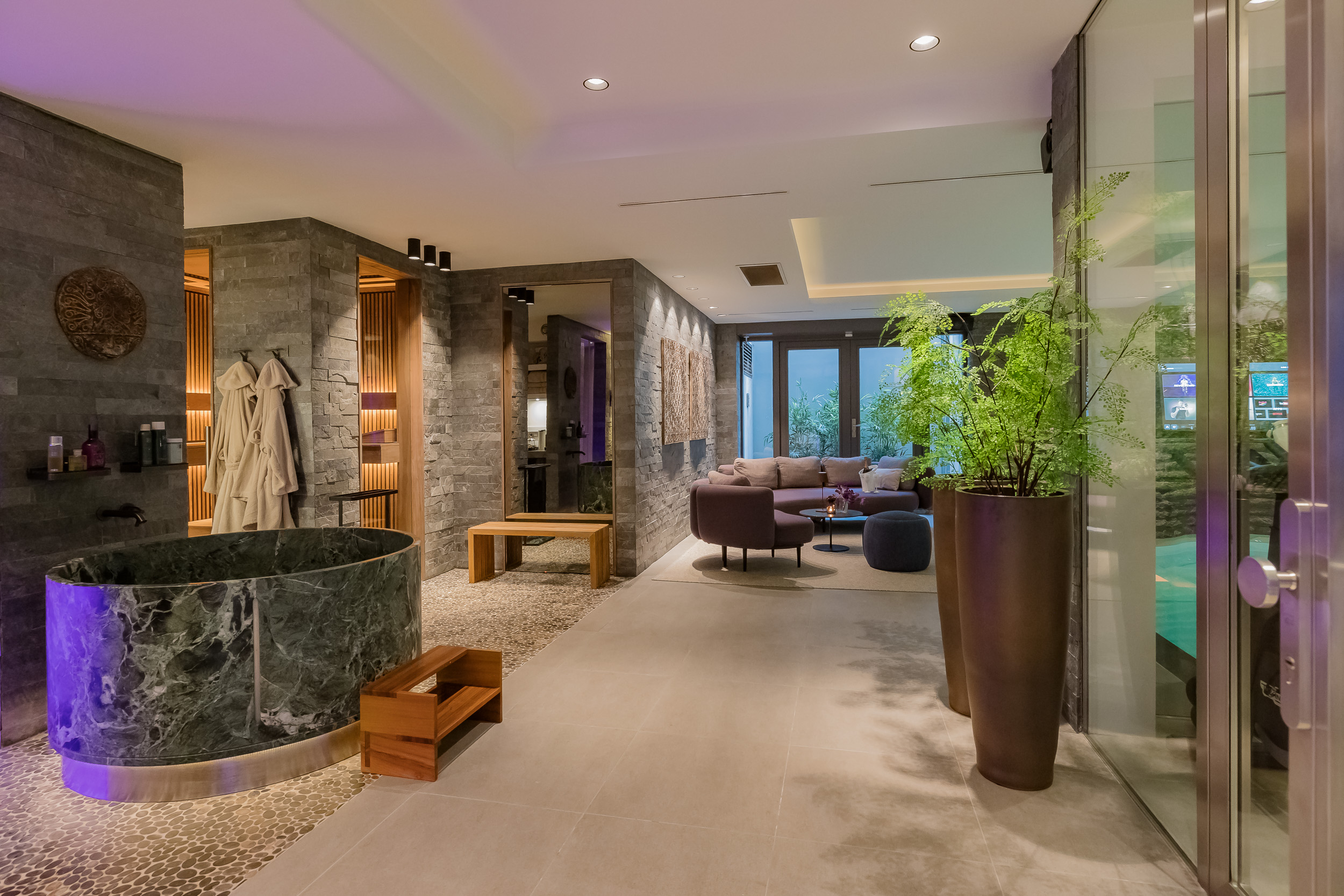 The souterrain level is devoted to wellness, highlighted by a 13-metre heated indoor pool set beside sculpted, wave-like walls, plus a private cinema, fitness area, steam cabin, sauna, and soft lighting throughout.