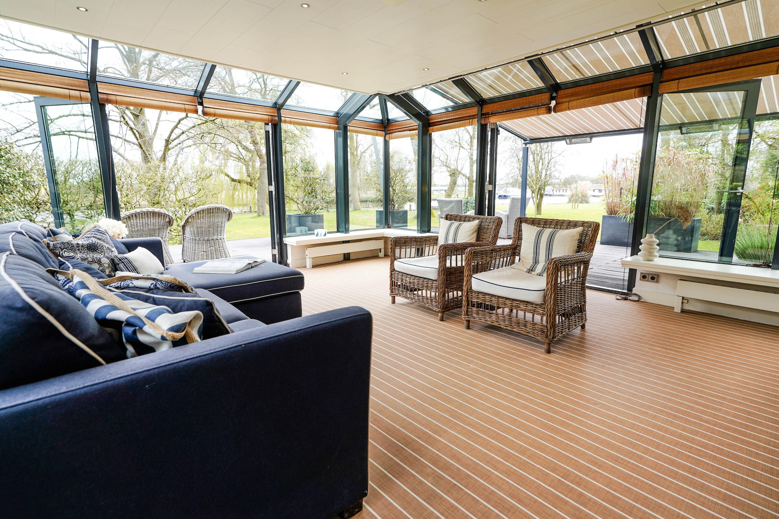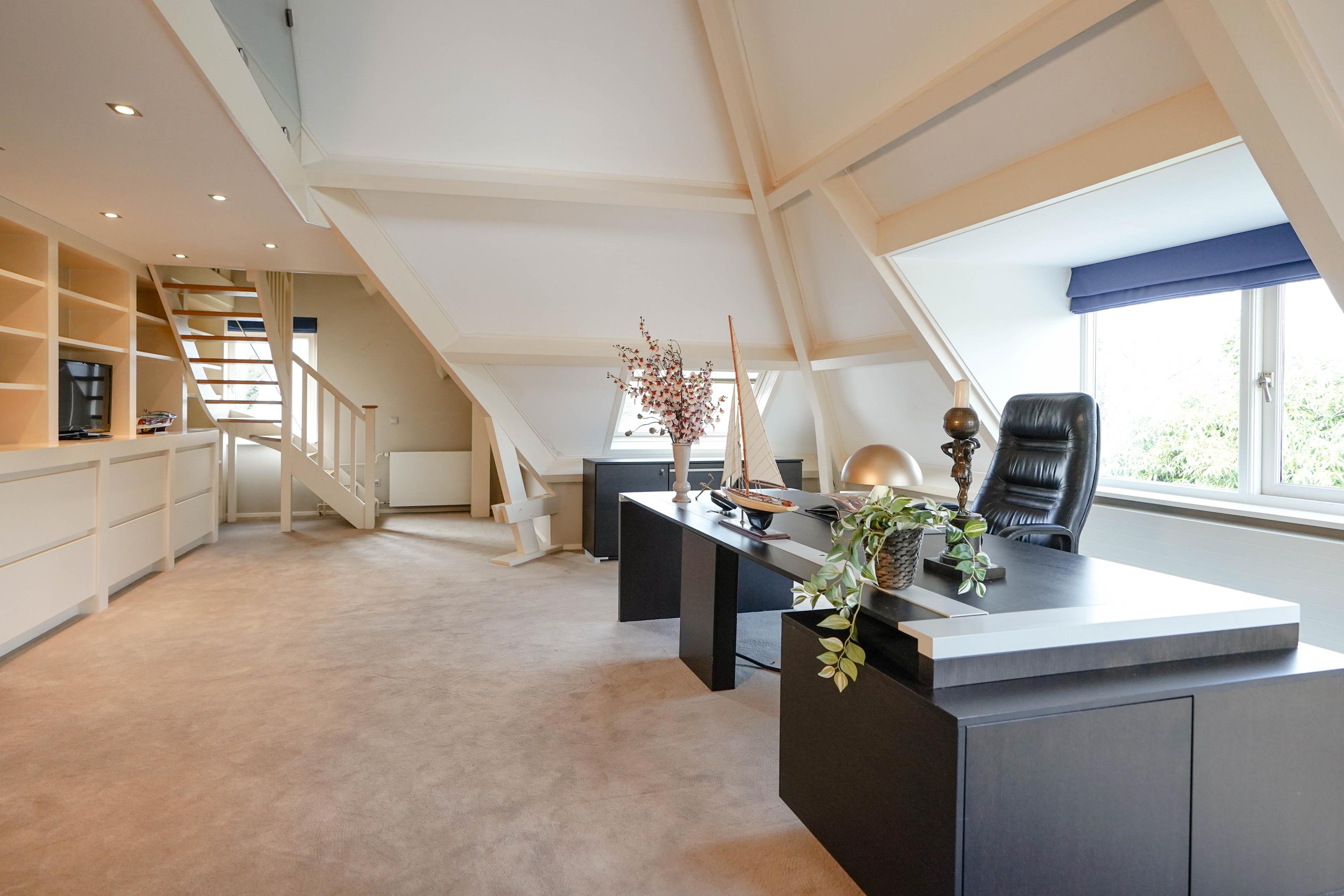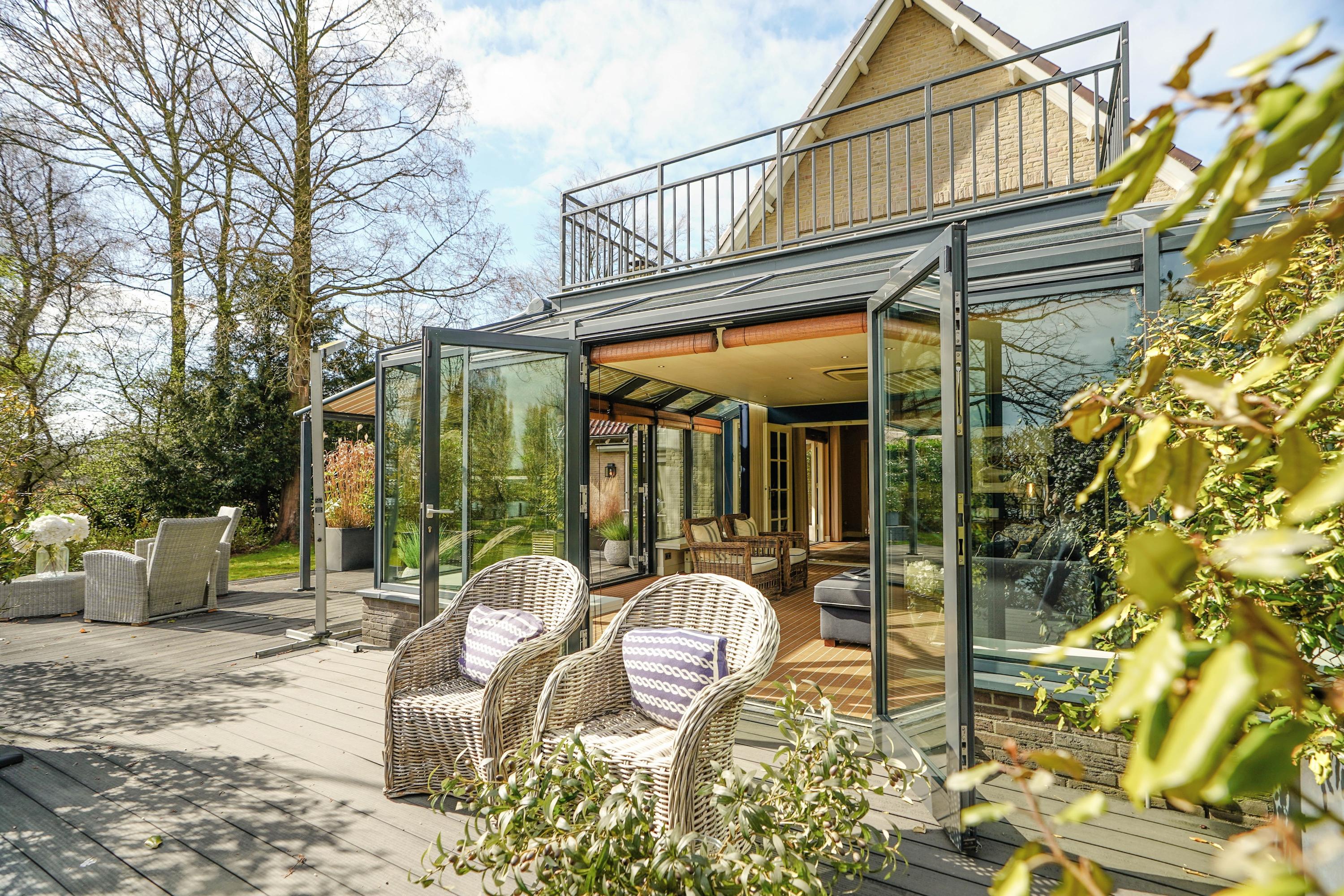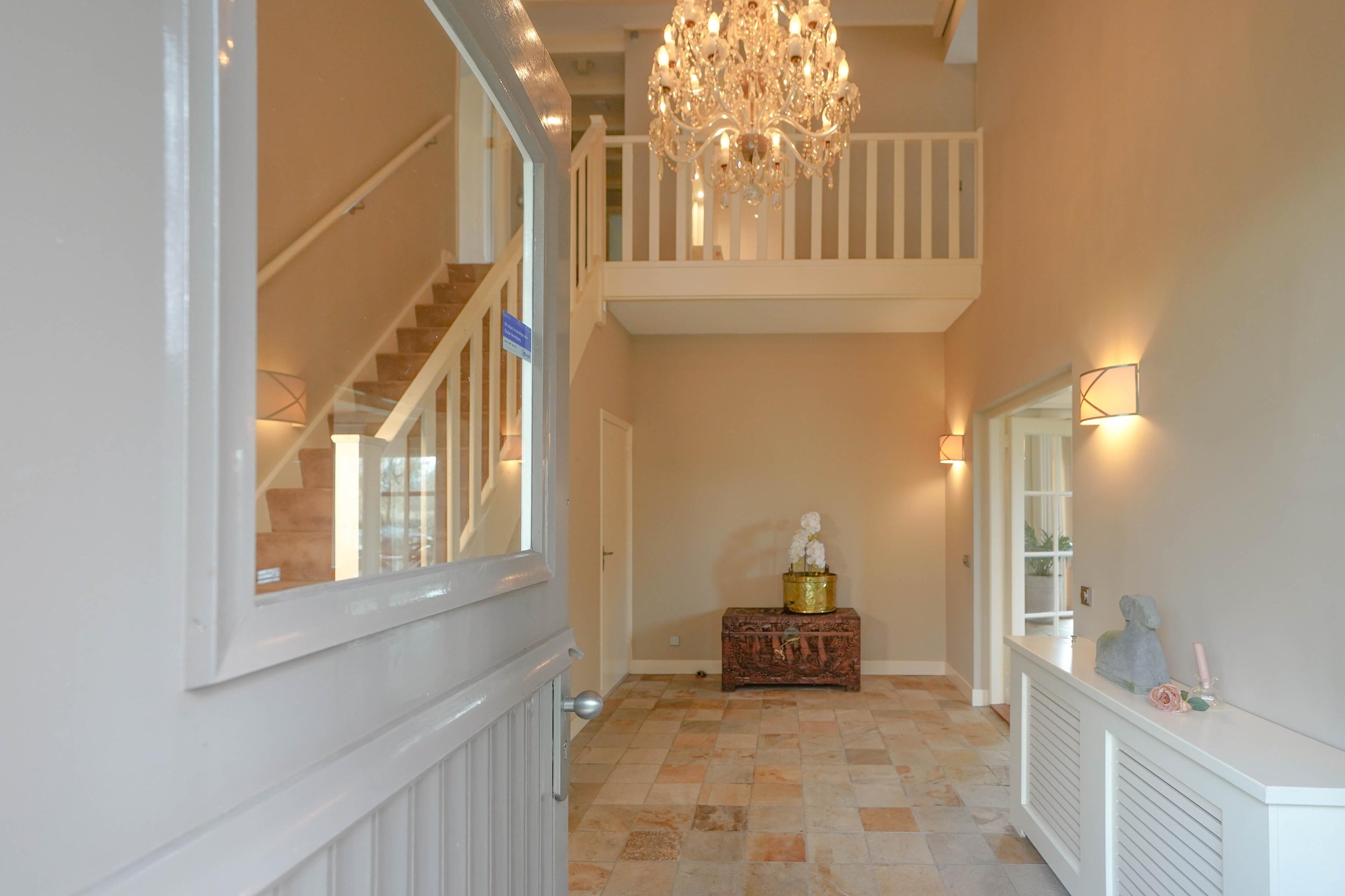 From the hall you enter the very spacious, attractive and bright living room through the double doors with a beautiful sandstone fireplace and sliding doors to one of the terraces. The dining room forms the connection between the living room and the kitchen. The luxury kitchen is spacious, bright and equipped with an island and of course all the usual equipment. Next to the kitchen you will find the utility room with cupboard wall and American fridge. You will also find the washing machine and dryer connections here. The entire ground floor has underfloor heating. From the kitchen you can also walk through French doors onto the terrace, with a nice, covered spot, perfect for a cup of coffee in the morning sun. Behind the kitchen is the lovely, sun-drenched conservatory (equipped with air conditioning) with again the beautiful view of the garden, the water and the nature reserve. Of course you can also walk from the conservatory, through French doors, straight into the garden.