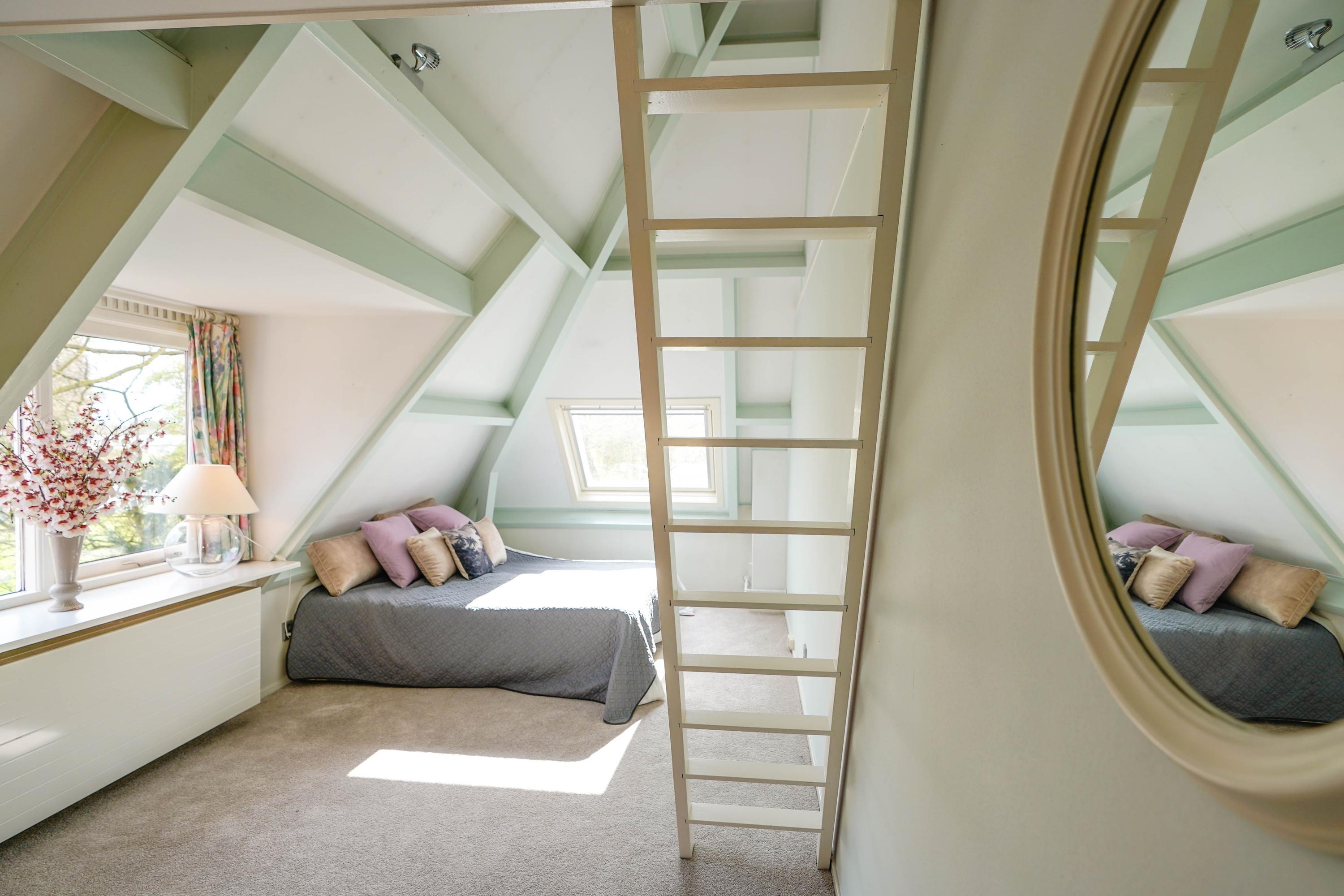 Landing, the first bathroom with shower, double sink and a toilet. Two spacious, identical children's bedrooms with a fixed staircase to a sleeping loft. The master bedroom has its own bathroom en suite (equipped with underfloor heating), fixed cupboard wall and French doors to a roof terrace with breathtaking views. Last but not least, on the first floor you will find the very spacious study with gas fireplace, view of the water, custom-made built-in cupboards and a fixed staircase to the vide and large storage attic.