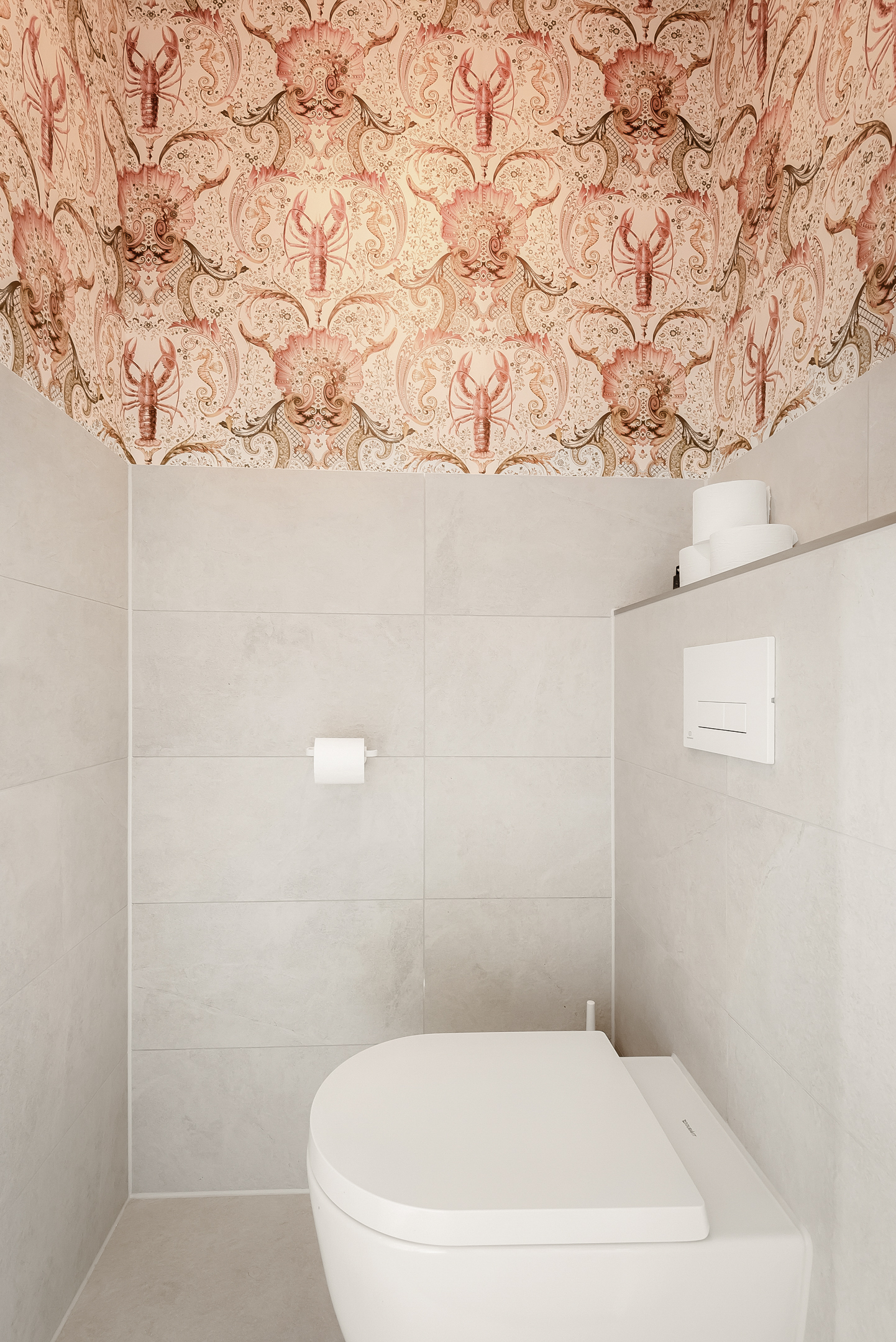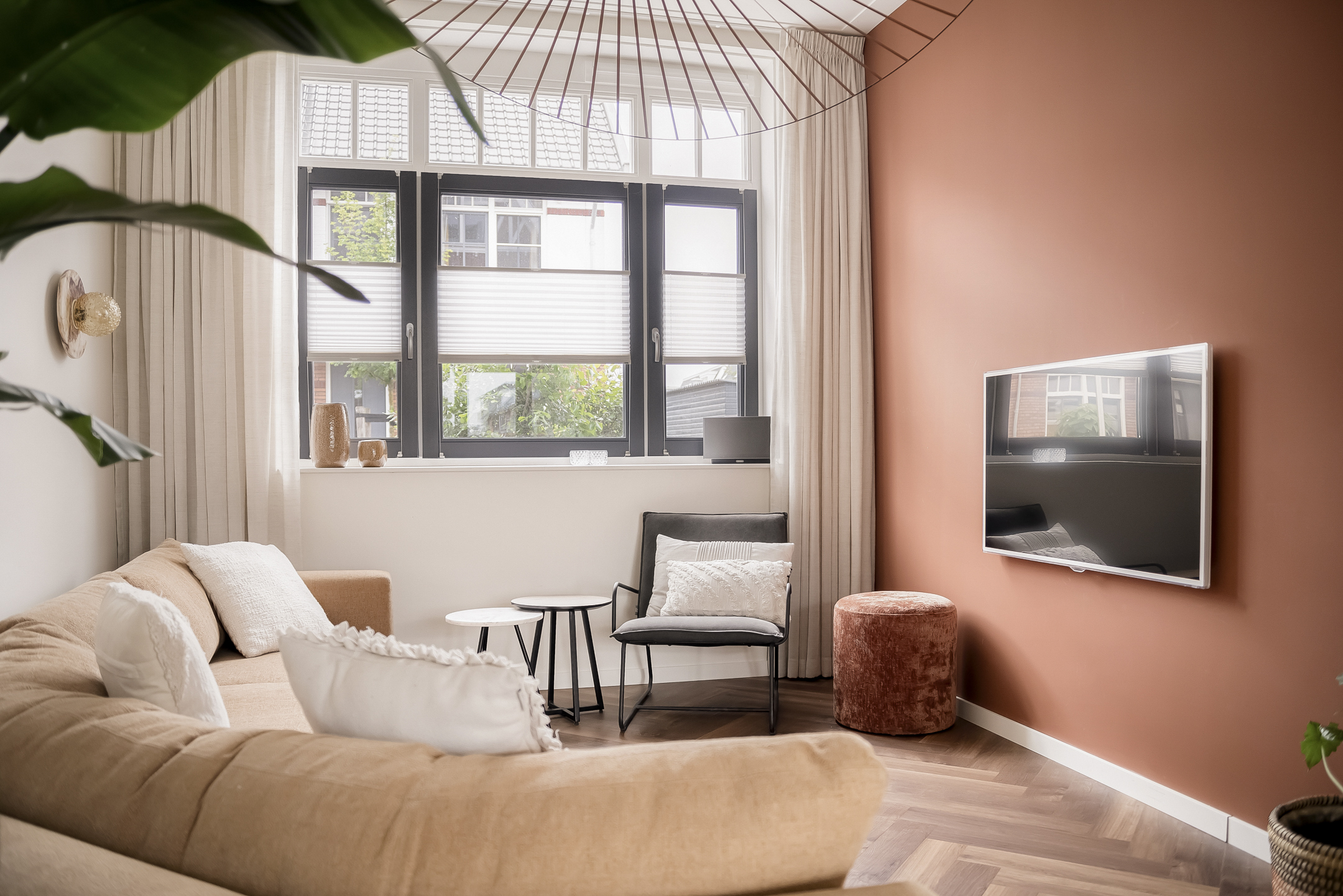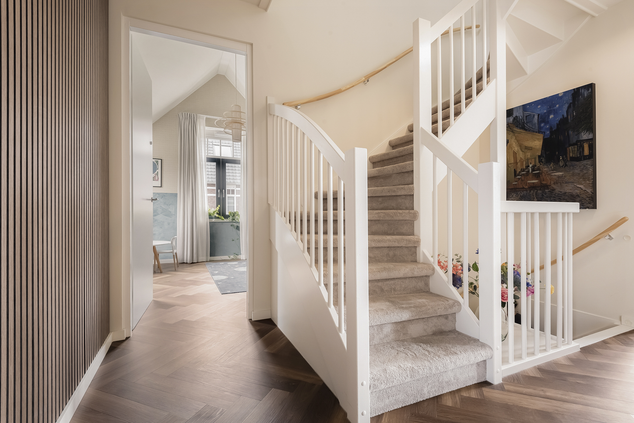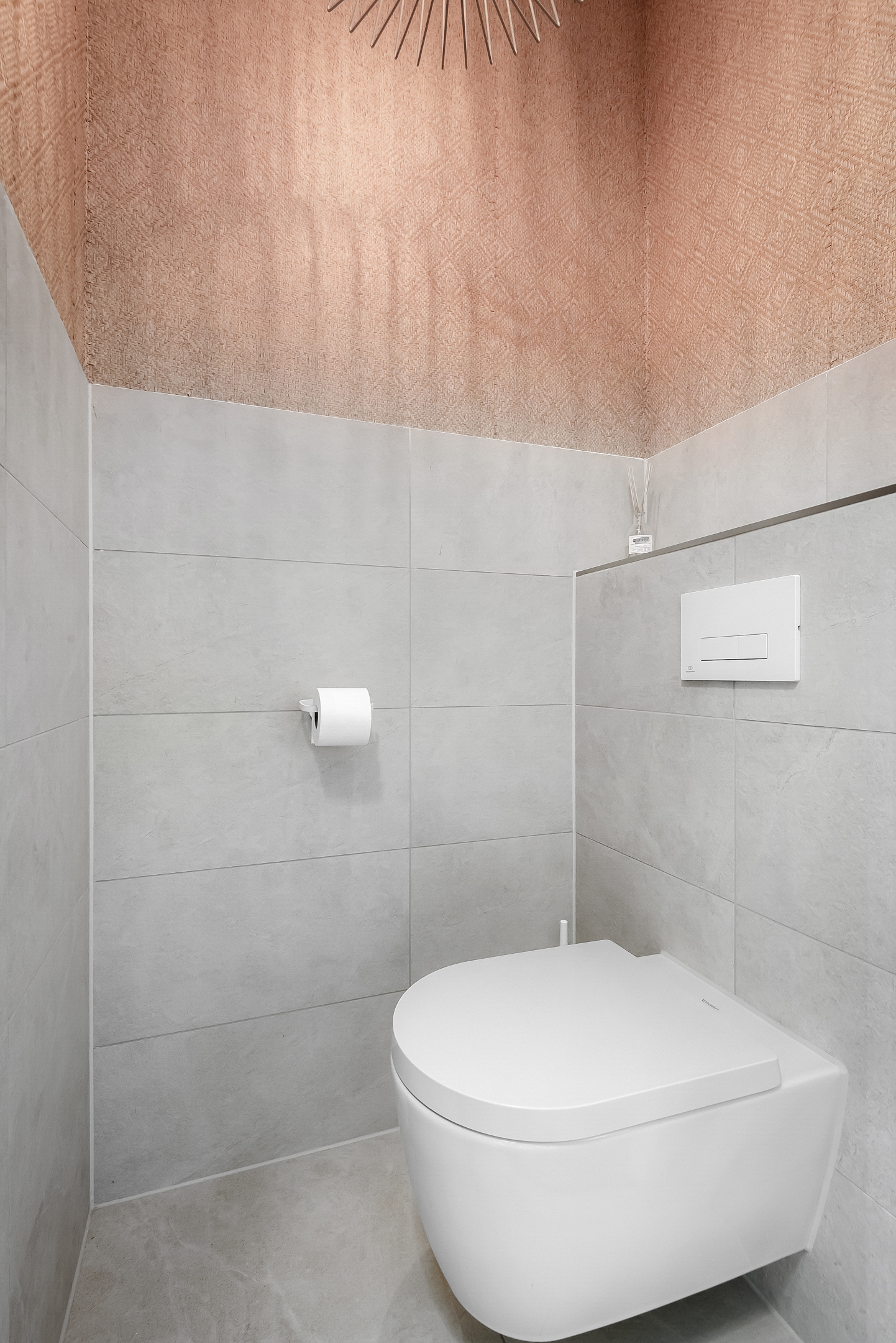 The entrance hall, with stylish wall paneling, a modern toilet and a meter cupboard, provides access to the bright living room and open-plan kitchen. The cozy living room is located at the front of the house.