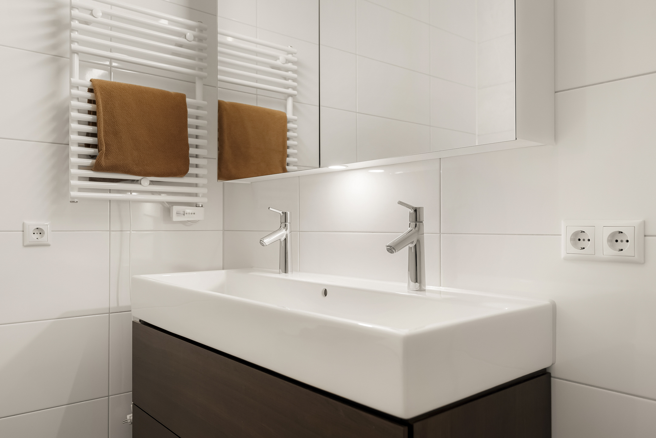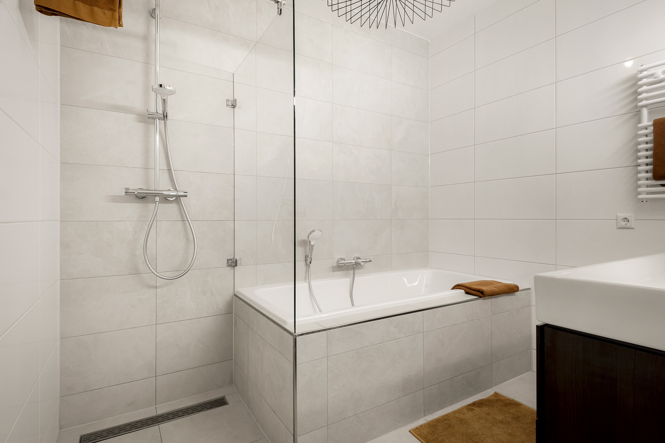 The second bathroom includes a walk-in shower with linear drain, a vanity unit, a designer radiator and a dormer window providing plenty of natural light. Opposite the bathroom is a separate toilet for added convenience.