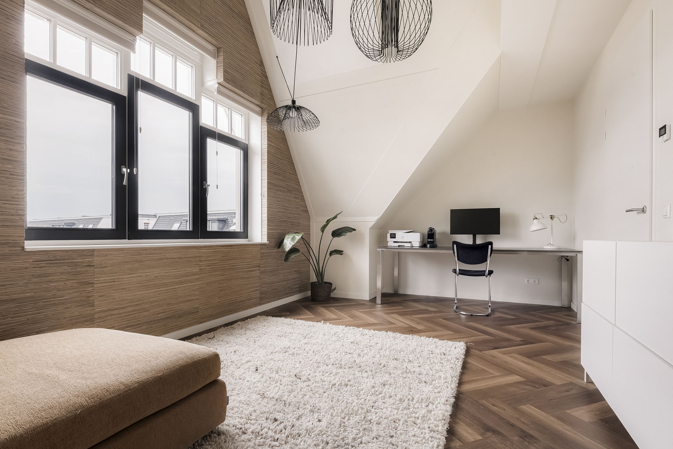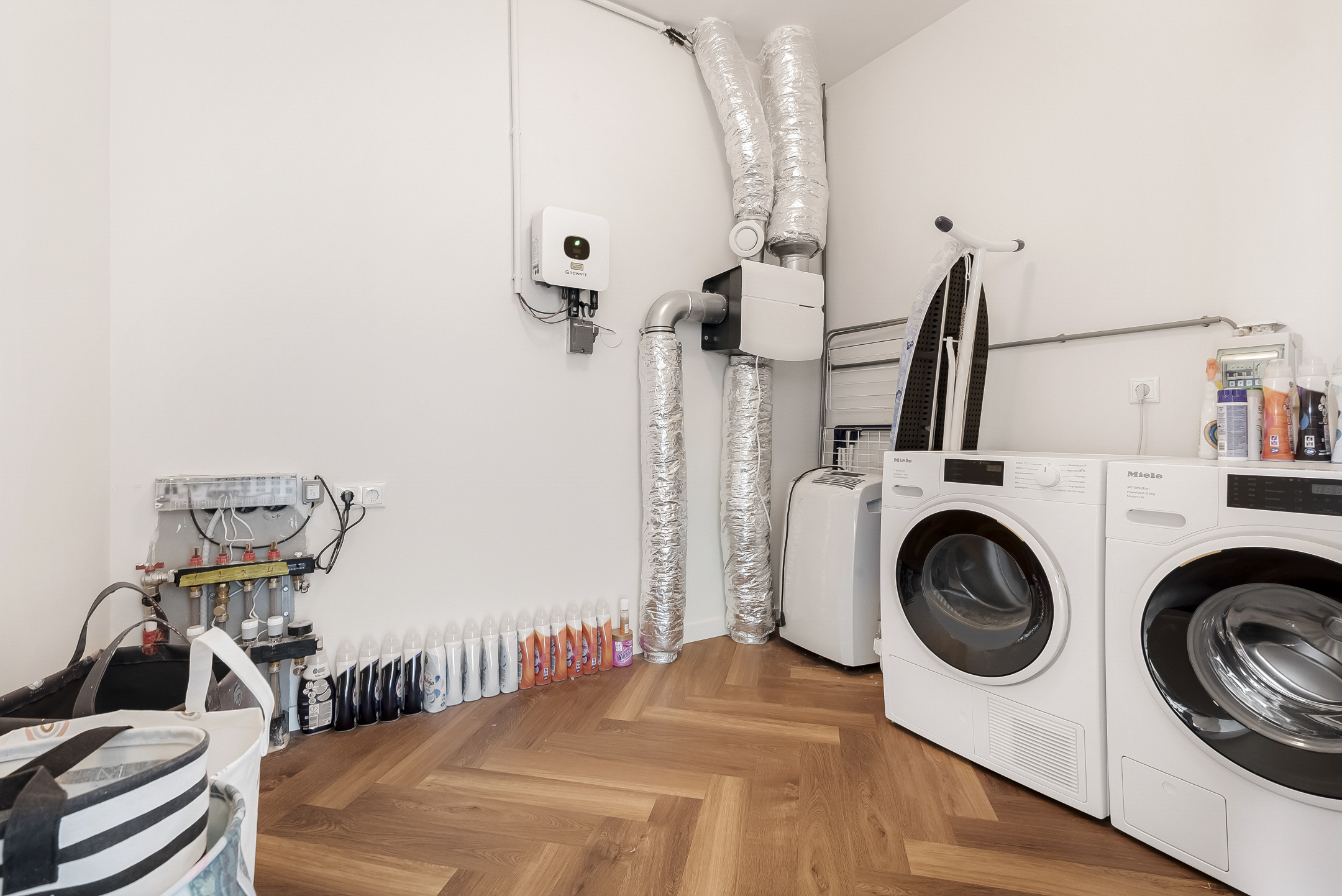 On the landing, a hatch with a folding ladder provides access to the loft, ideal for extra storage. The technical room houses connections for a washing machine and dryer, the ventilation unit and the inverter for the 15 solar panels. The entire floor, including the landing and bedrooms, is finished with PVC flooring.
