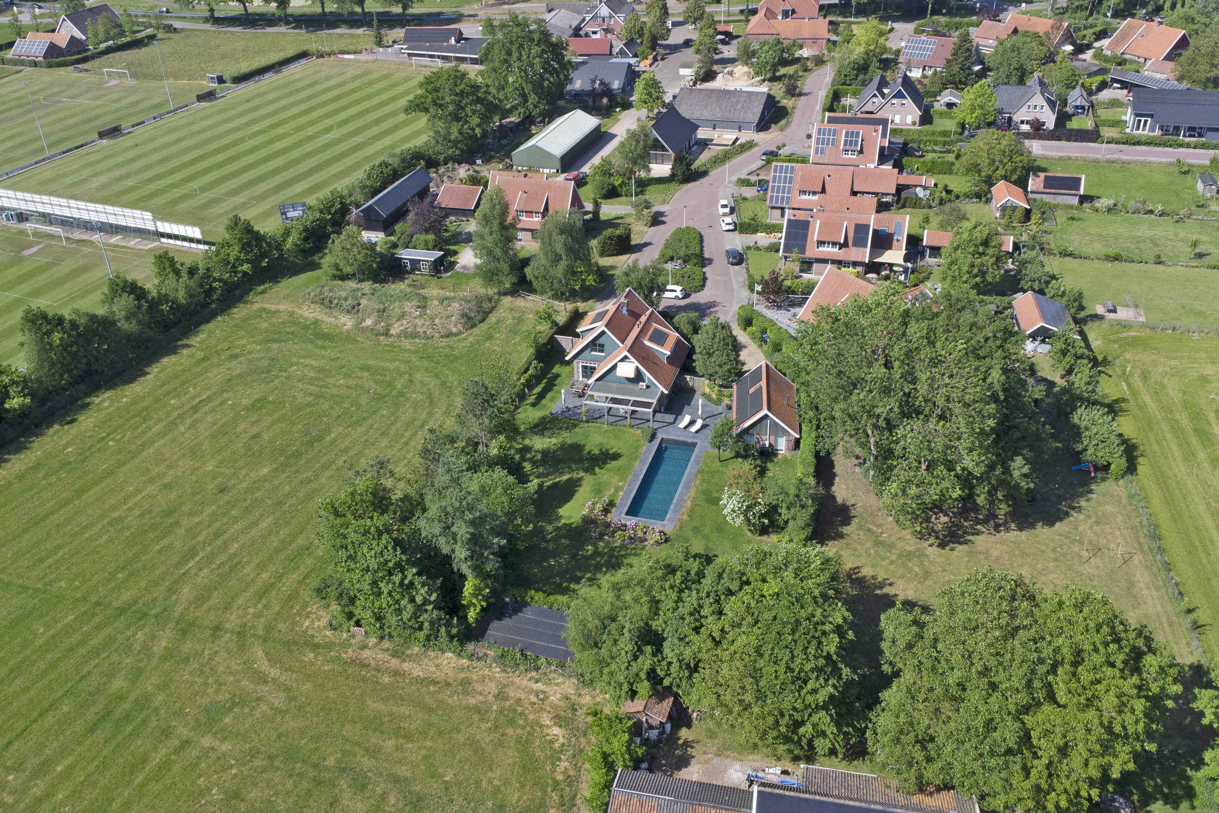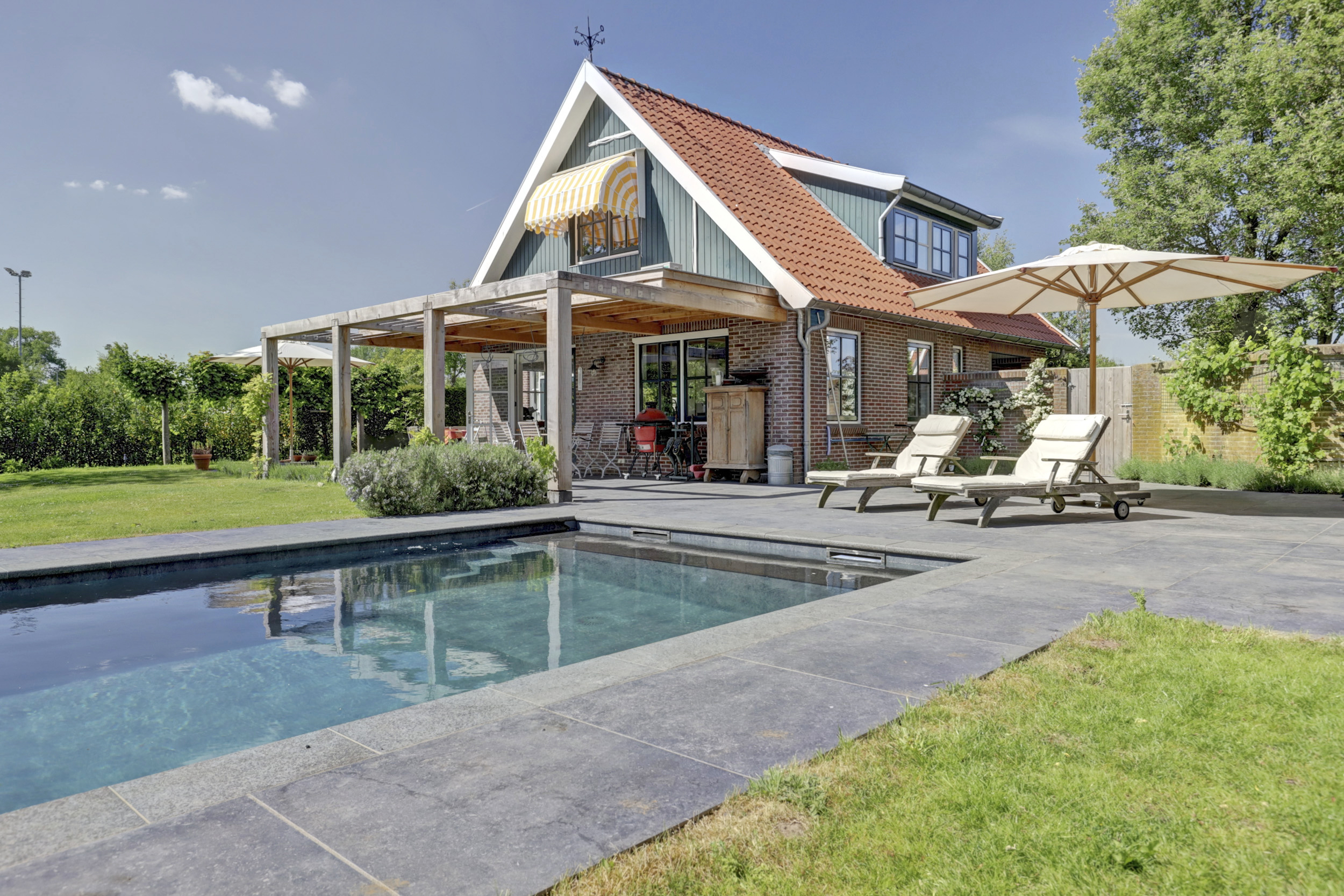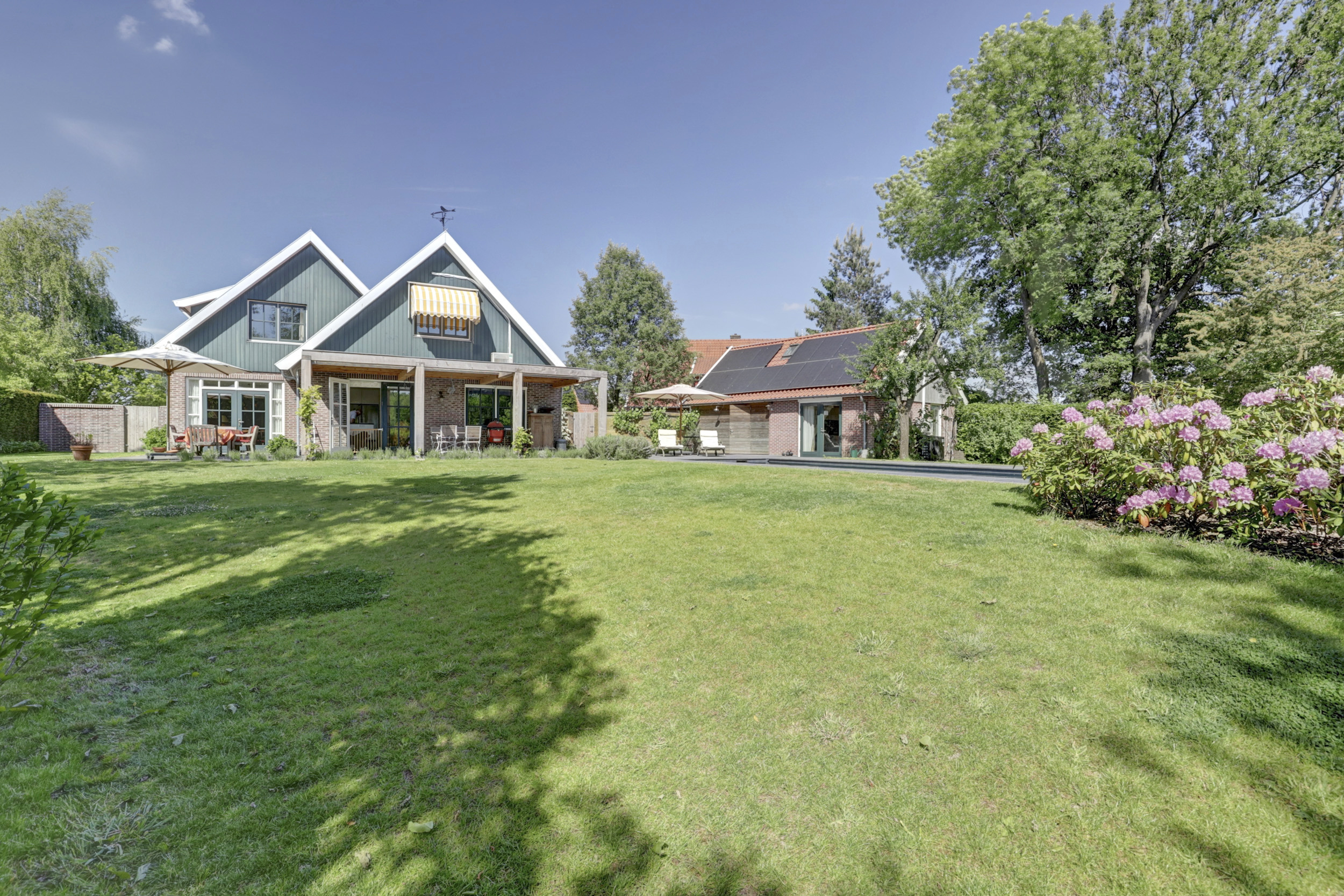 The country villa Winterswijk Miste stands quietly poised between Winterswijk and Bredevoort, offering 241 m² of living space, a detached 33 m² guesthouse, and a 15 × 4 metre heated saltwater swimming pool, all set within a 2,110 m² plot. This property blends traditional gabled farmhouse style with contemporary comfort, reflected in its energy class A certification, modern sustainability improvements, and 47 discreetly placed solar panels.