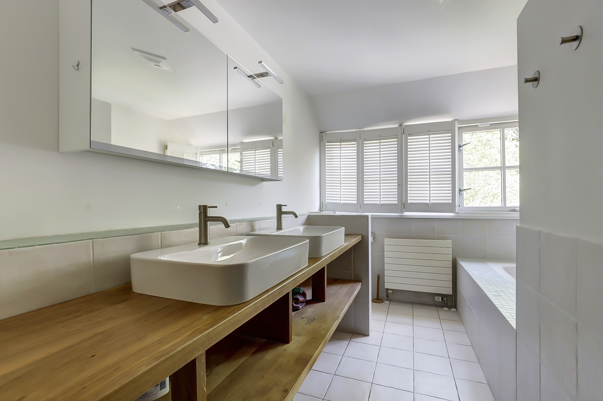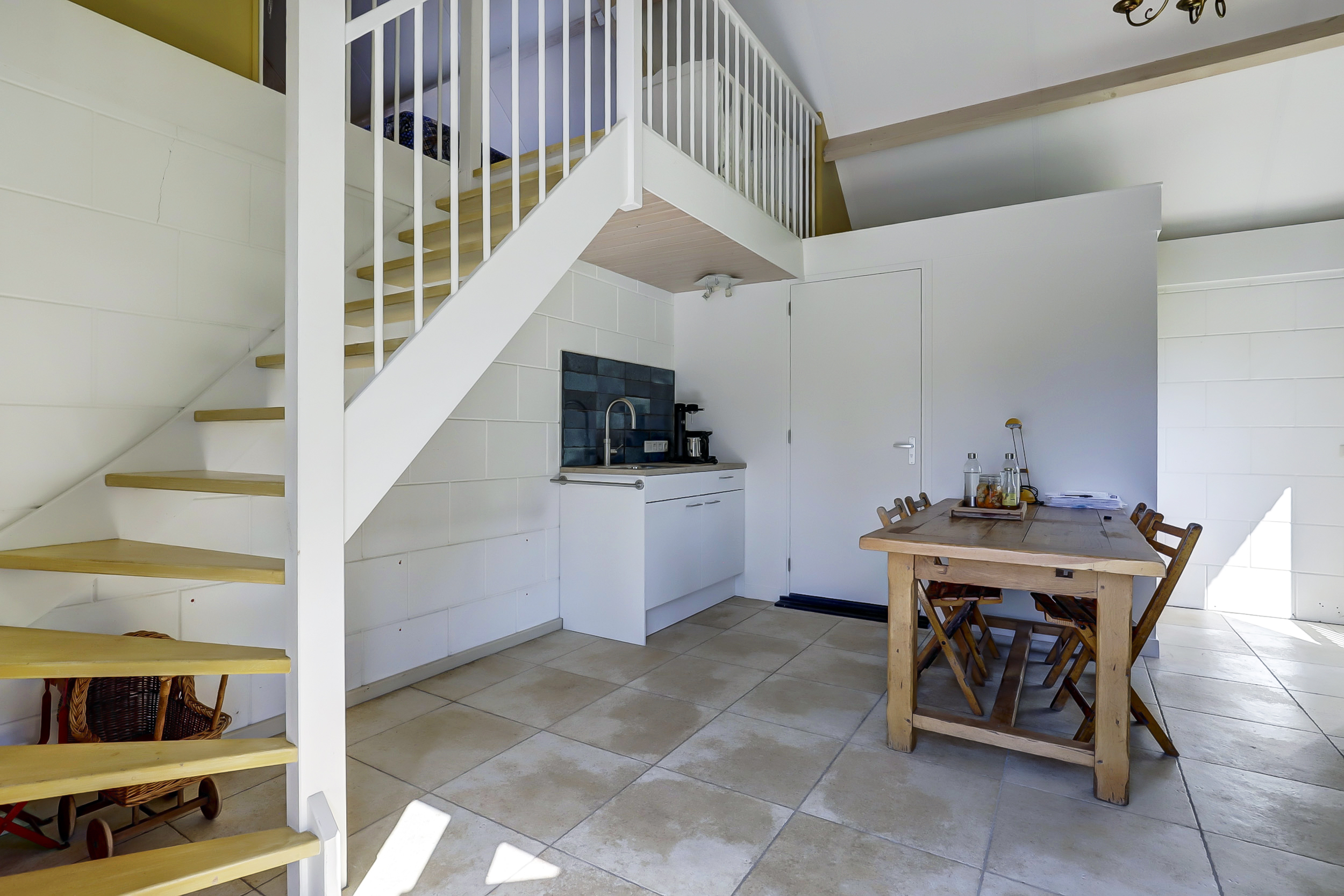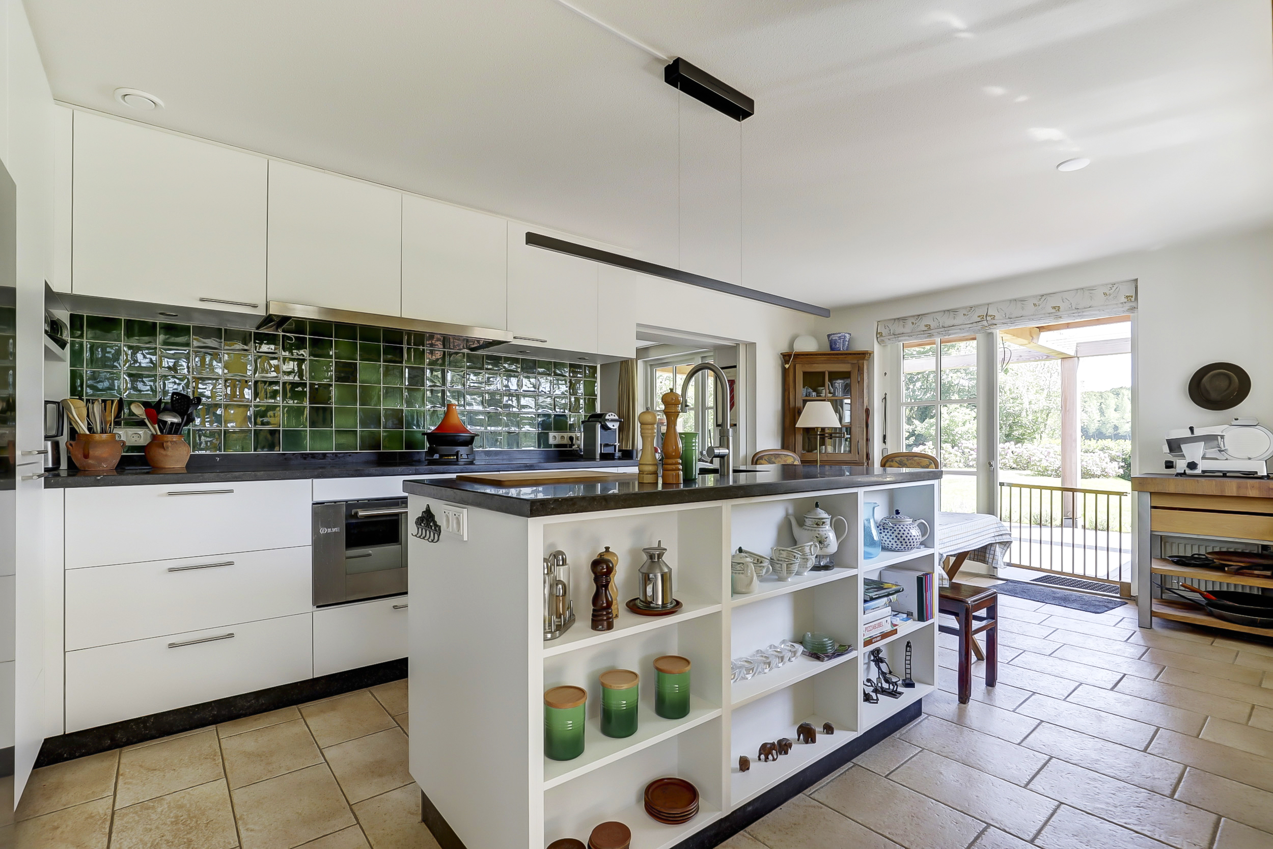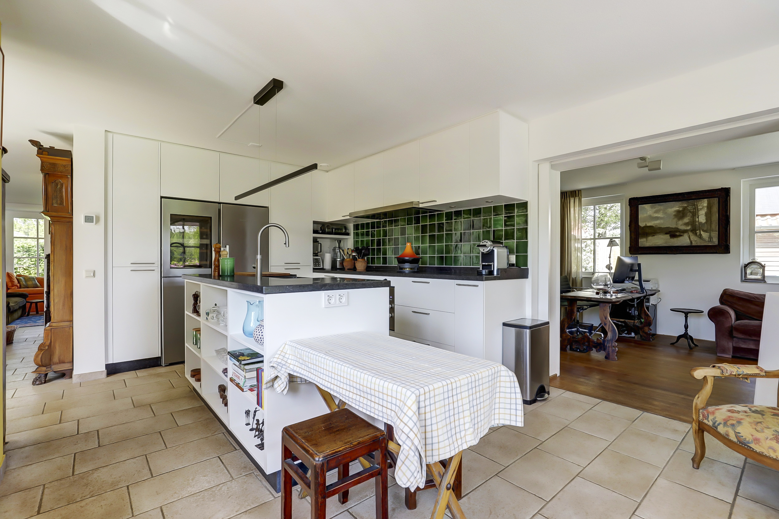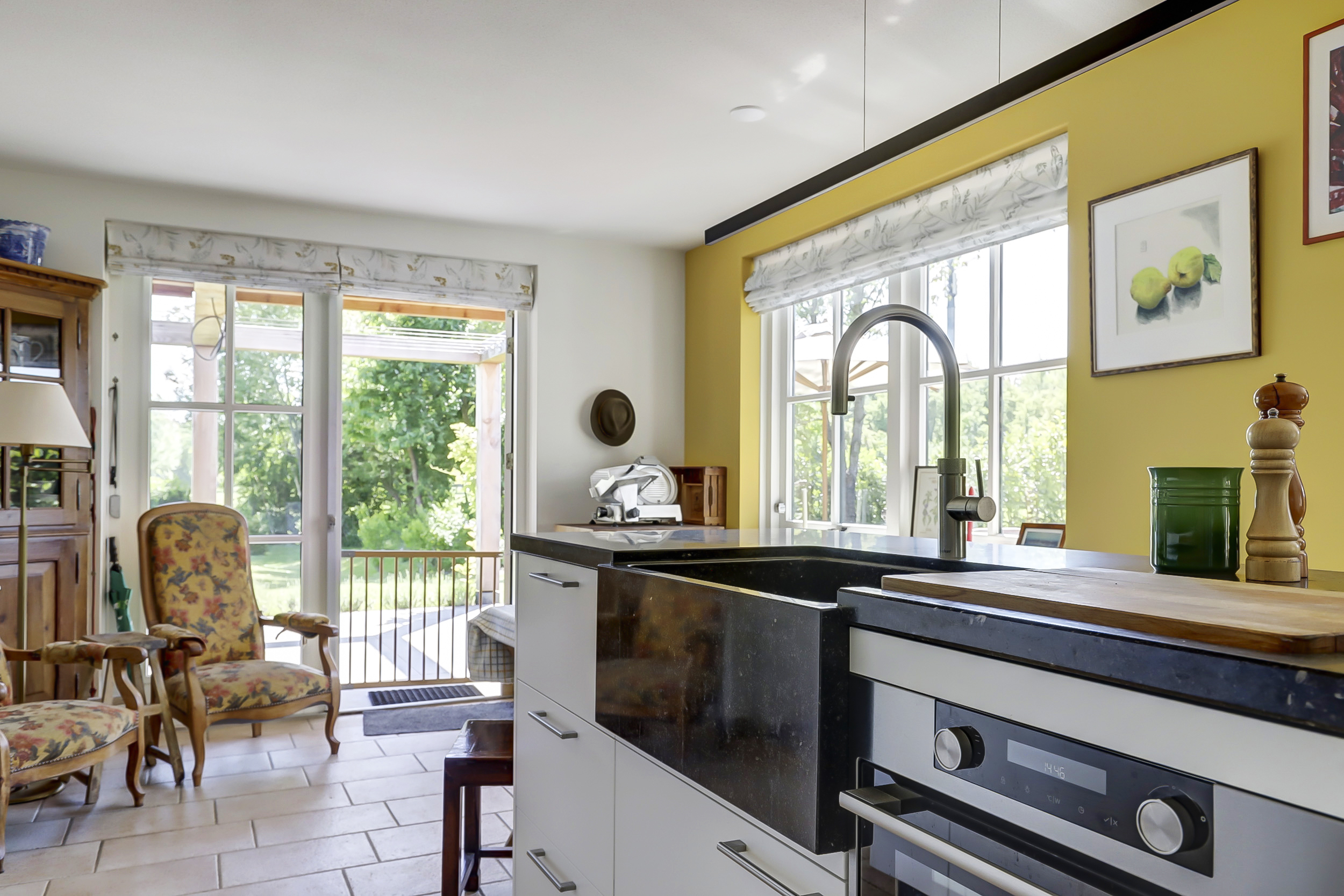 From the bay-windowed living room with open fireplace, light moves through wide French doors to a sunny terrace and the garden beyond. The 2023 kitchen, with matte white surfaces and natural stone worktop, includes a wine climate cabinet, 4-in-1 boiling-water tap, induction cooktop, and 90 cm convection oven, designed for both function and restrained elegance. The ground floor’s underfloor heating and the guesthouse’s thoughtful kitchen and amenities provide adaptability for hosting family or for launching a bed and breakfast.