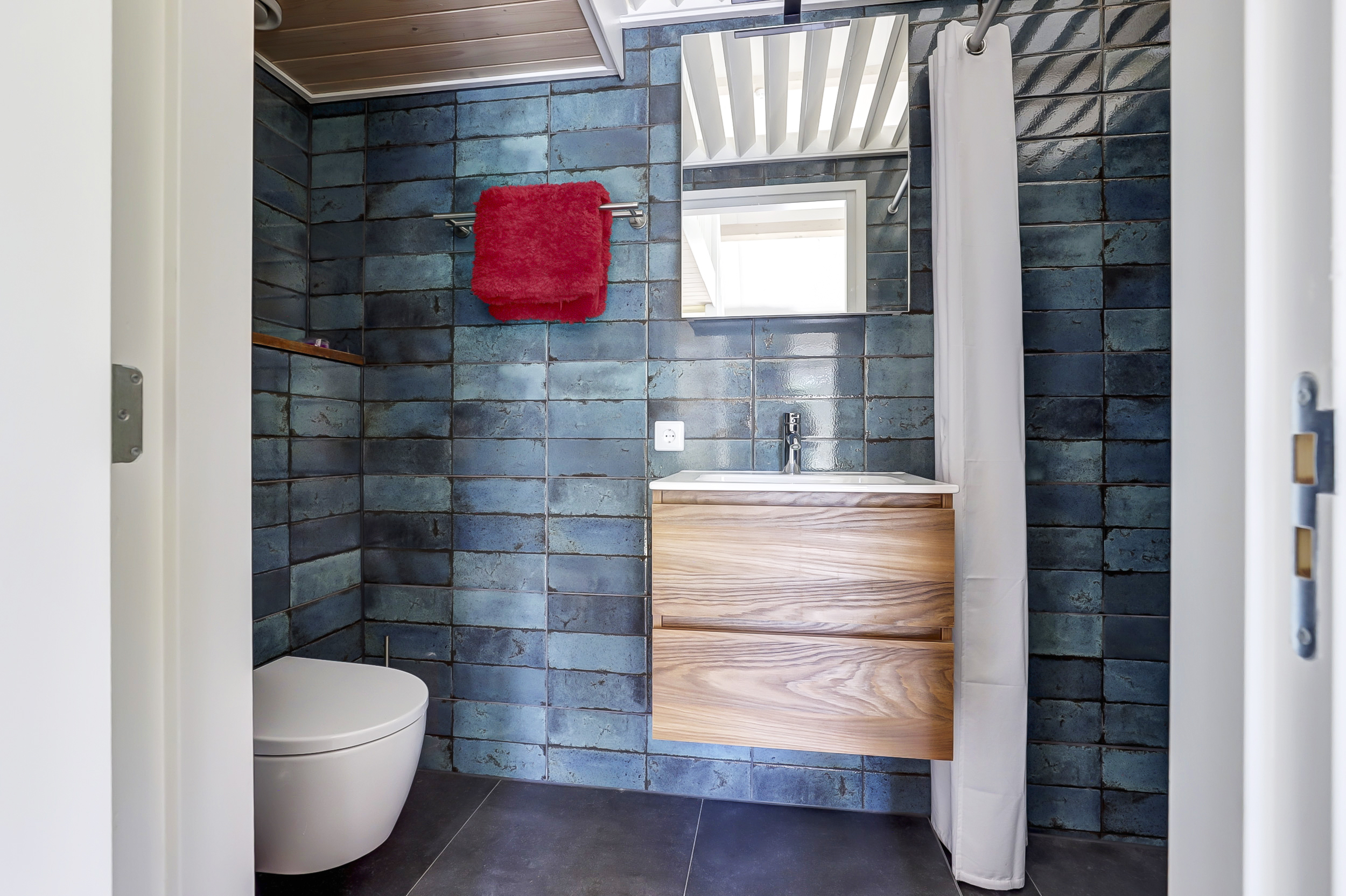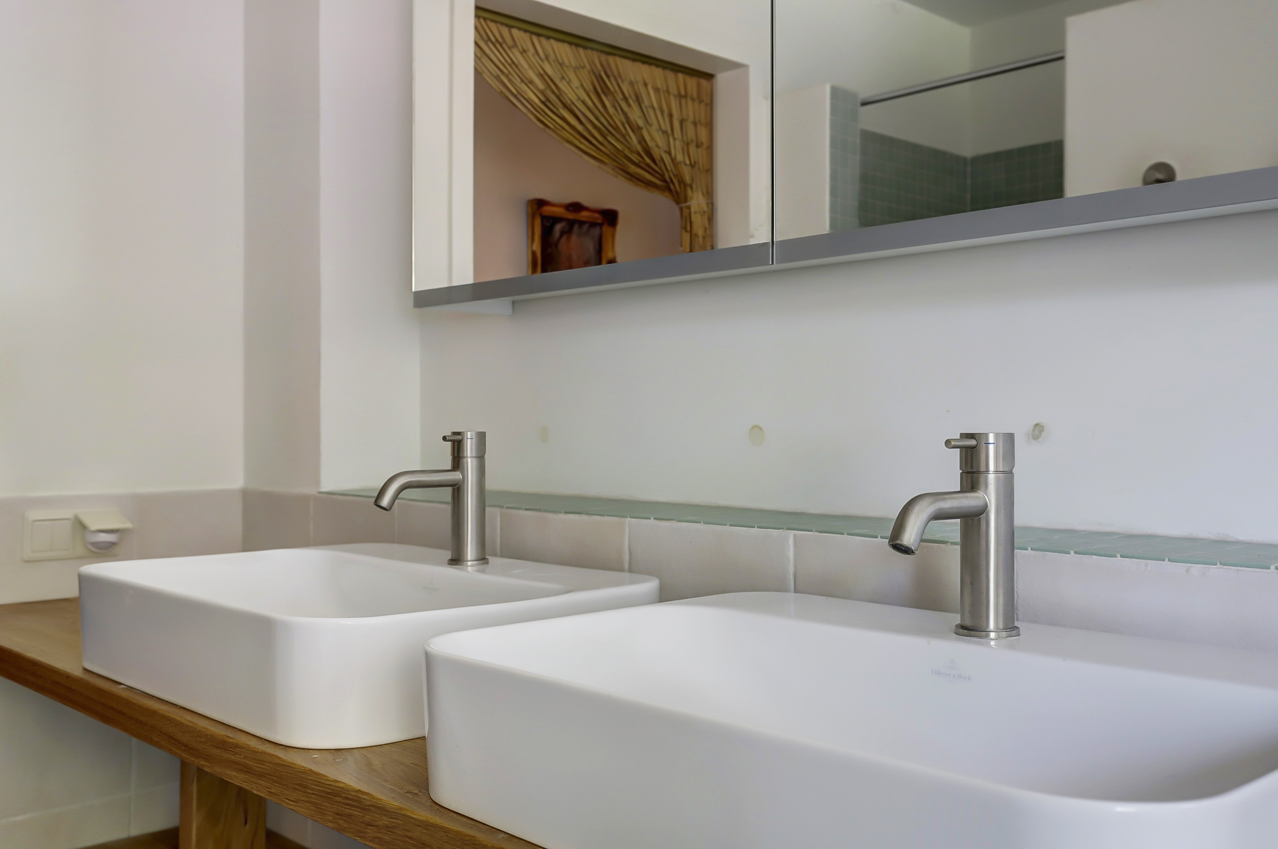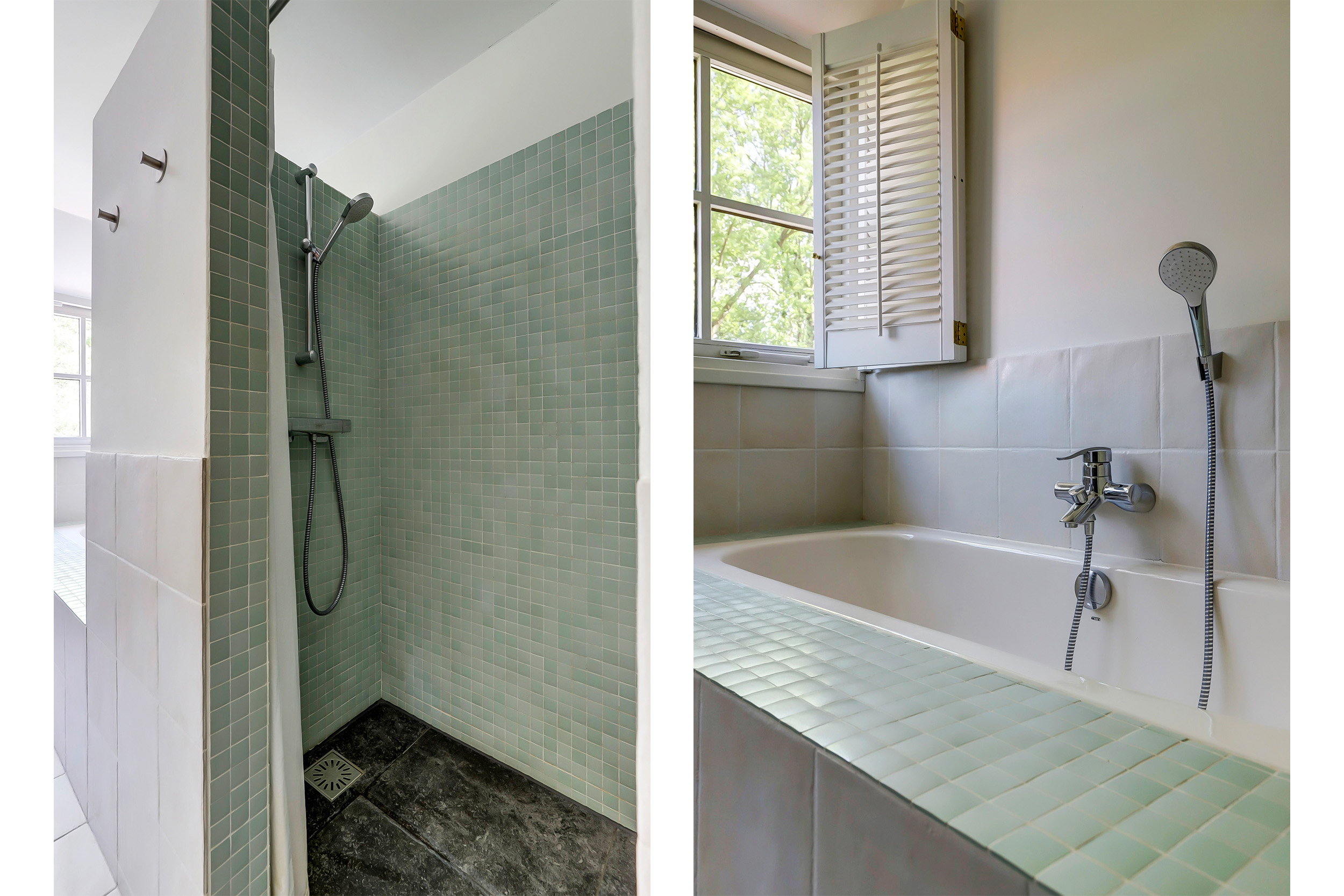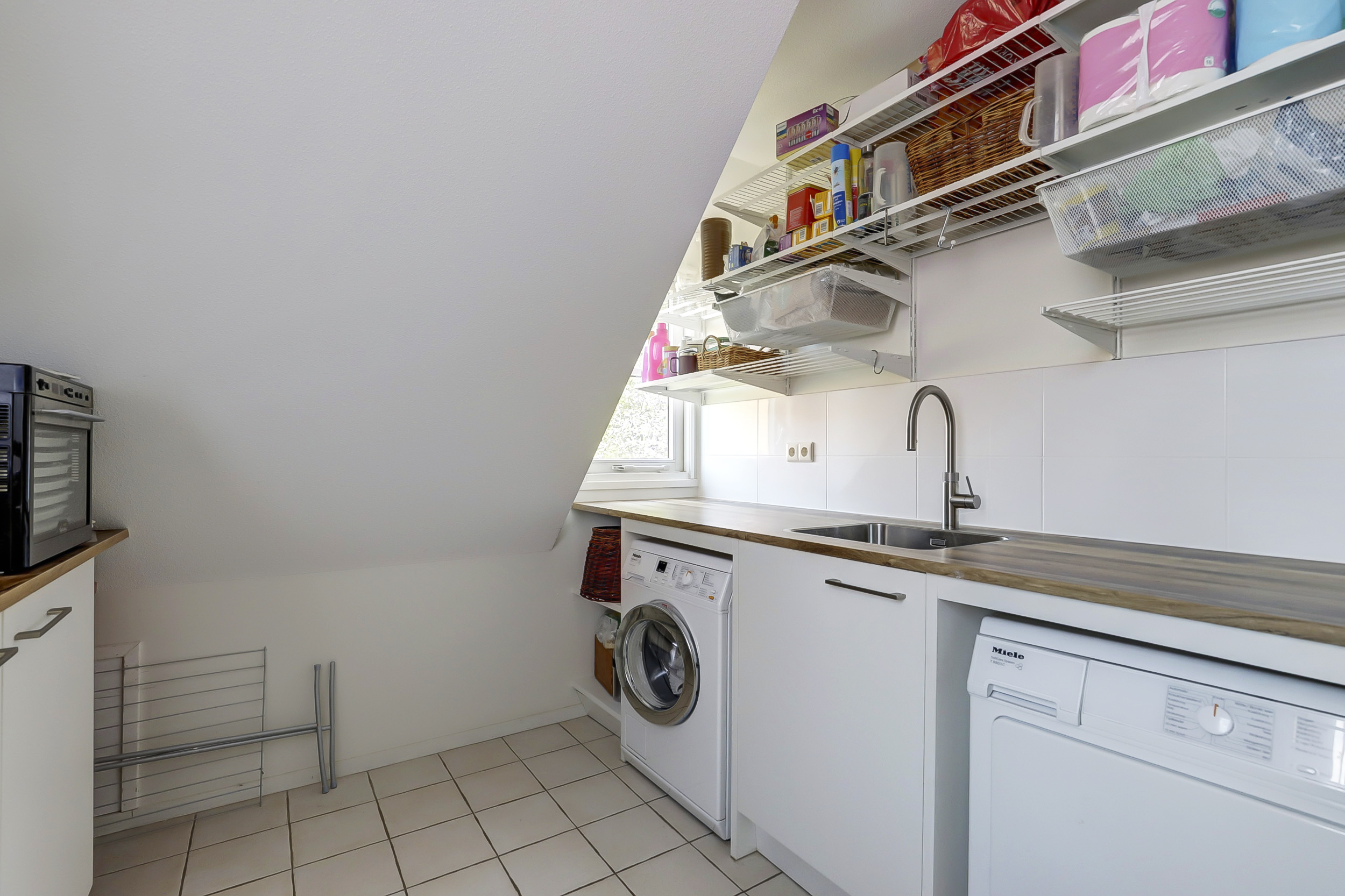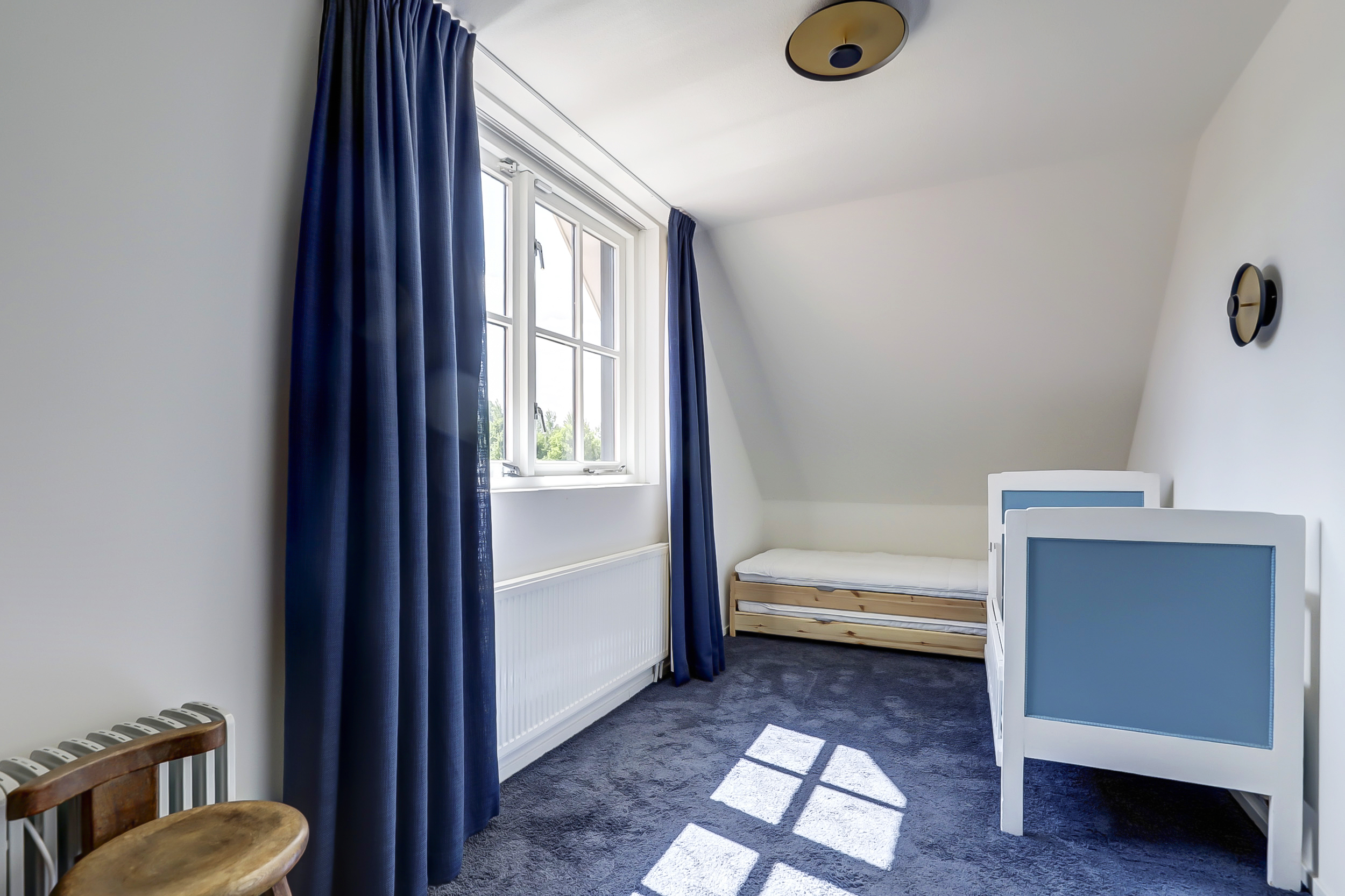 From the bay-windowed living room with open fireplace, light moves through wide French doors to a sunny terrace and the garden beyond. The 2023 kitchen, with matte white surfaces and natural stone worktop, includes a wine climate cabinet, 4-in-1 boiling-water tap, induction cooktop, and 90 cm convection oven, designed for both function and restrained elegance. The ground floor’s underfloor heating and the guesthouse’s thoughtful kitchen and amenities provide adaptability for hosting family or for launching a bed and breakfast.