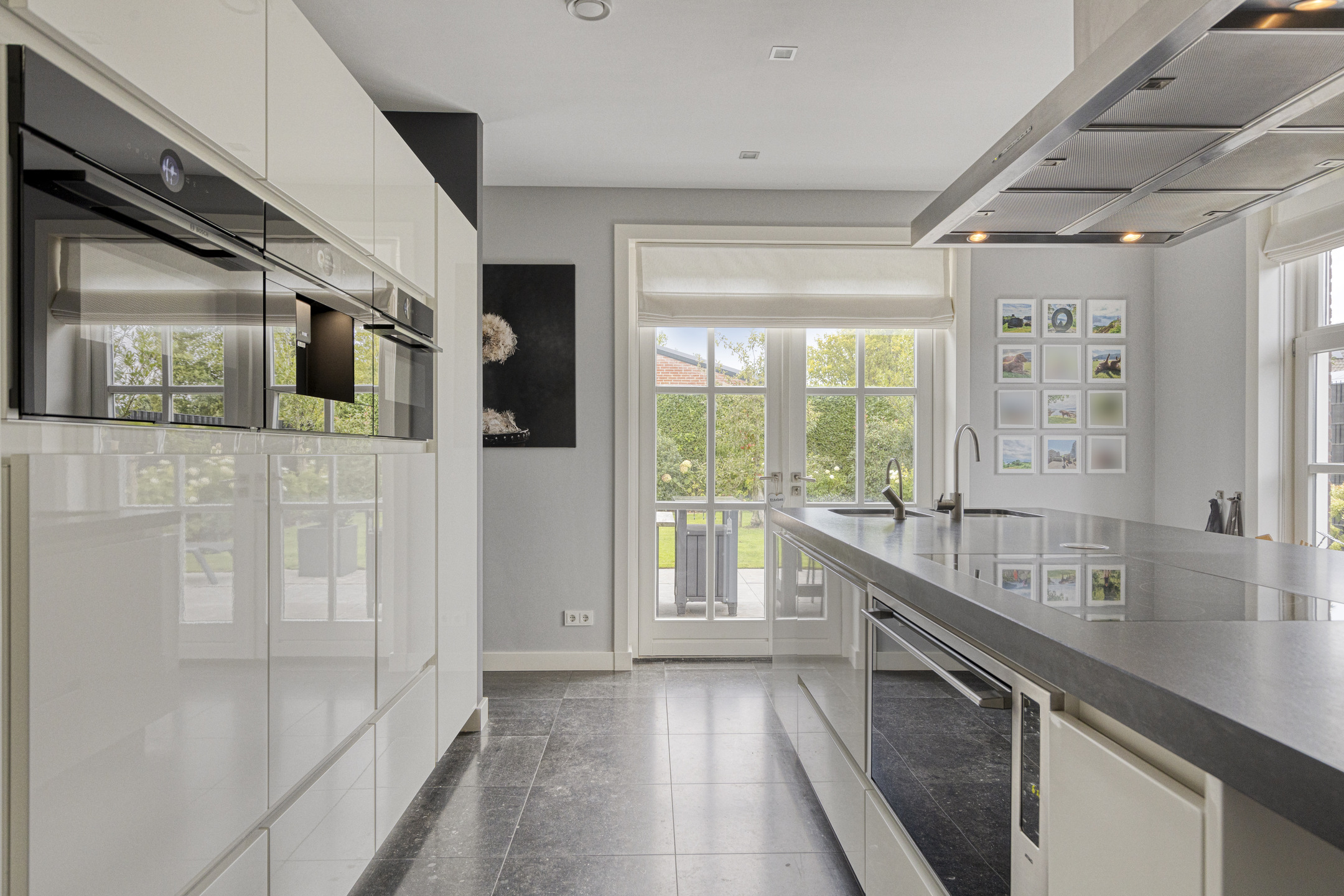 Kitchen: modern Bosch and Miele built-in appliances with cooking and sink island and integrated dining table; composite countertop with double sink and Quooker; Miele induction cooktop with Miele extractor hood; cabinet wall with Bosch built-in coffee machine, Bosch refrigerator (with fresh zone), Bosch freezer, two Bosch combination oven/microwaves, ATAG electric oven (90 cm) and Miele dishwasher at ergonomic height.