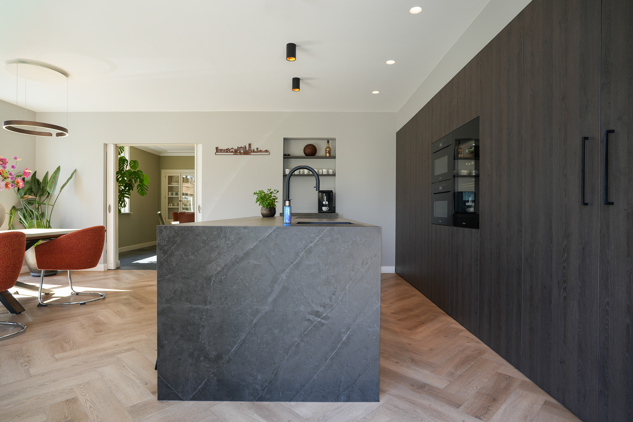 The kitchen is finished to a high standard, featuring a wide wall of cabinetry with premium built-in appliances and a large island with a Dekton worktop. On the dining side, the island incorporates a breakfast bar near the coffee corner. Adjacent to the gas fireplace there is space for a large dining table. Two sets of French doors provide an abundance of natural light and direct access to the full-width terrace and garden.