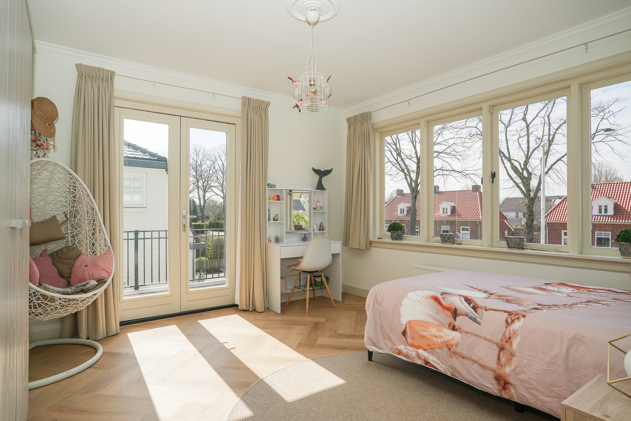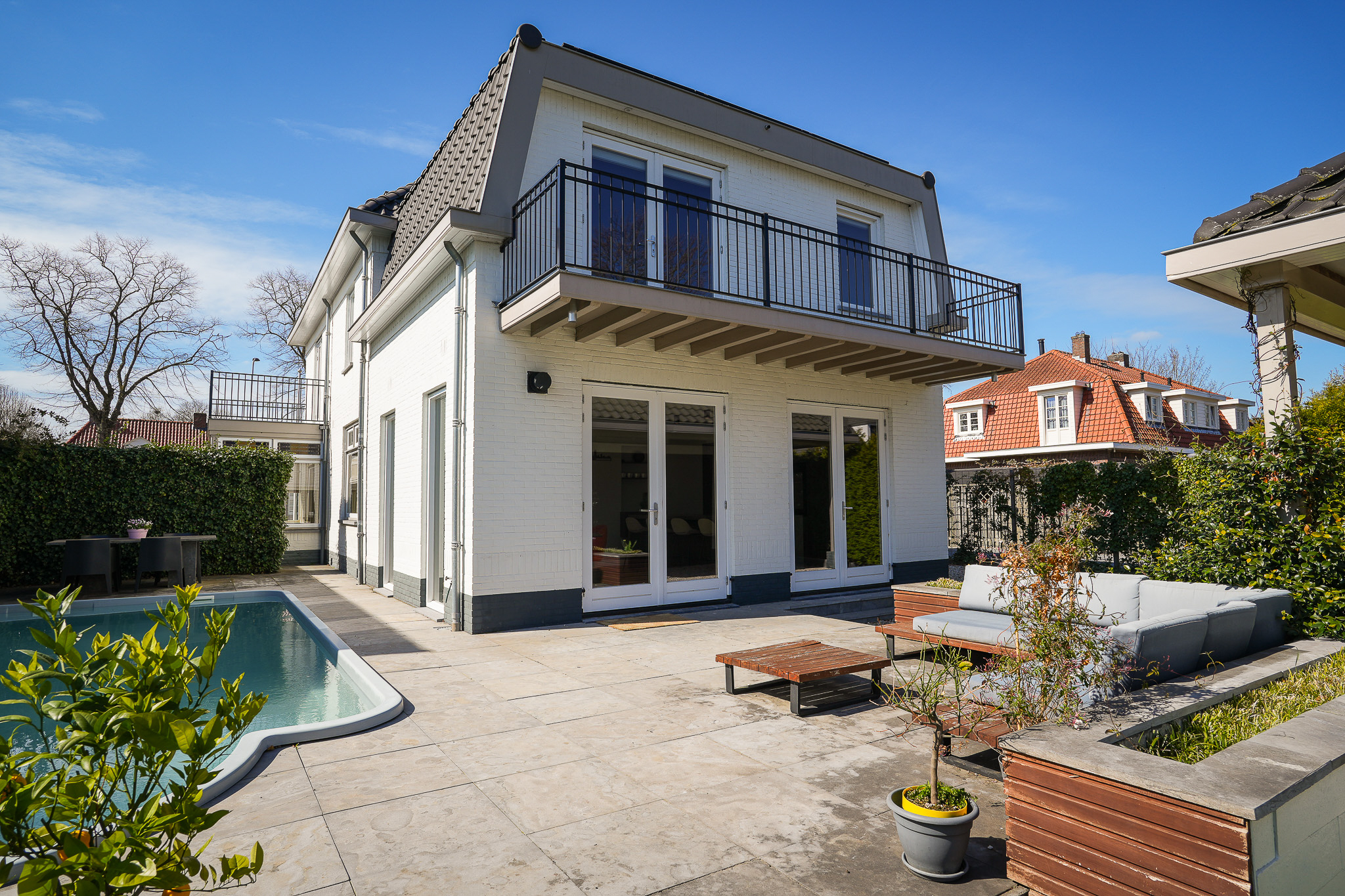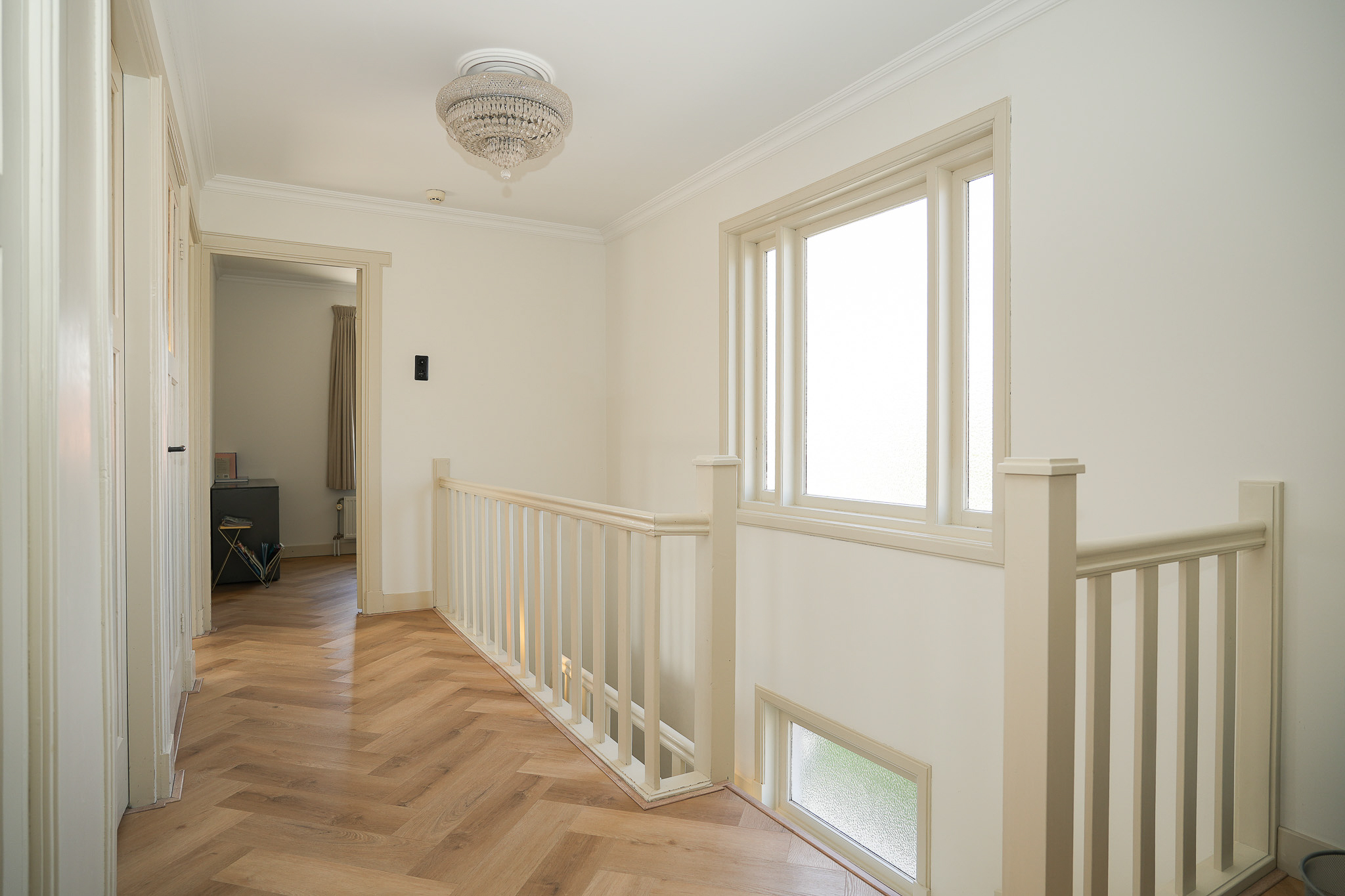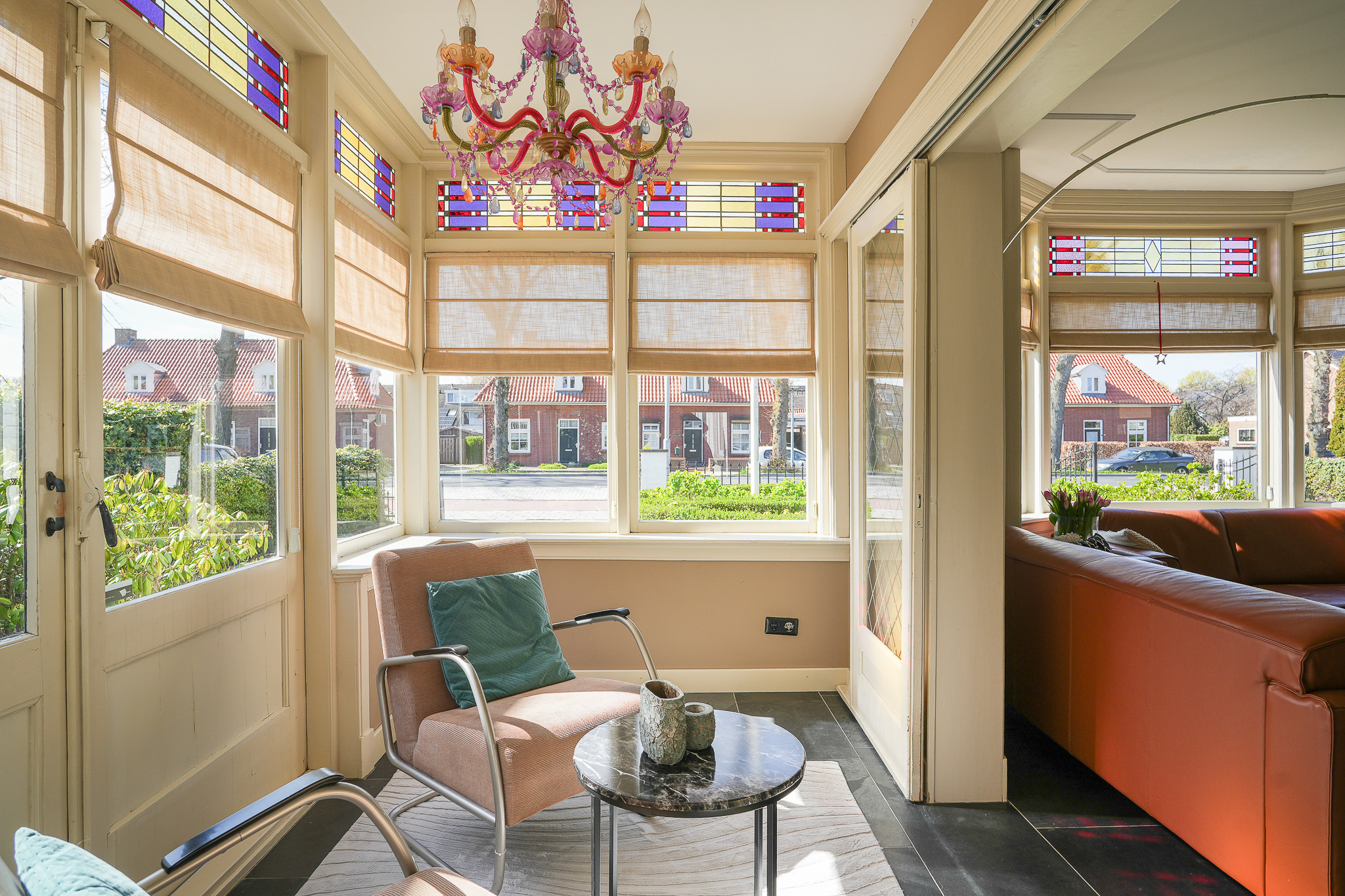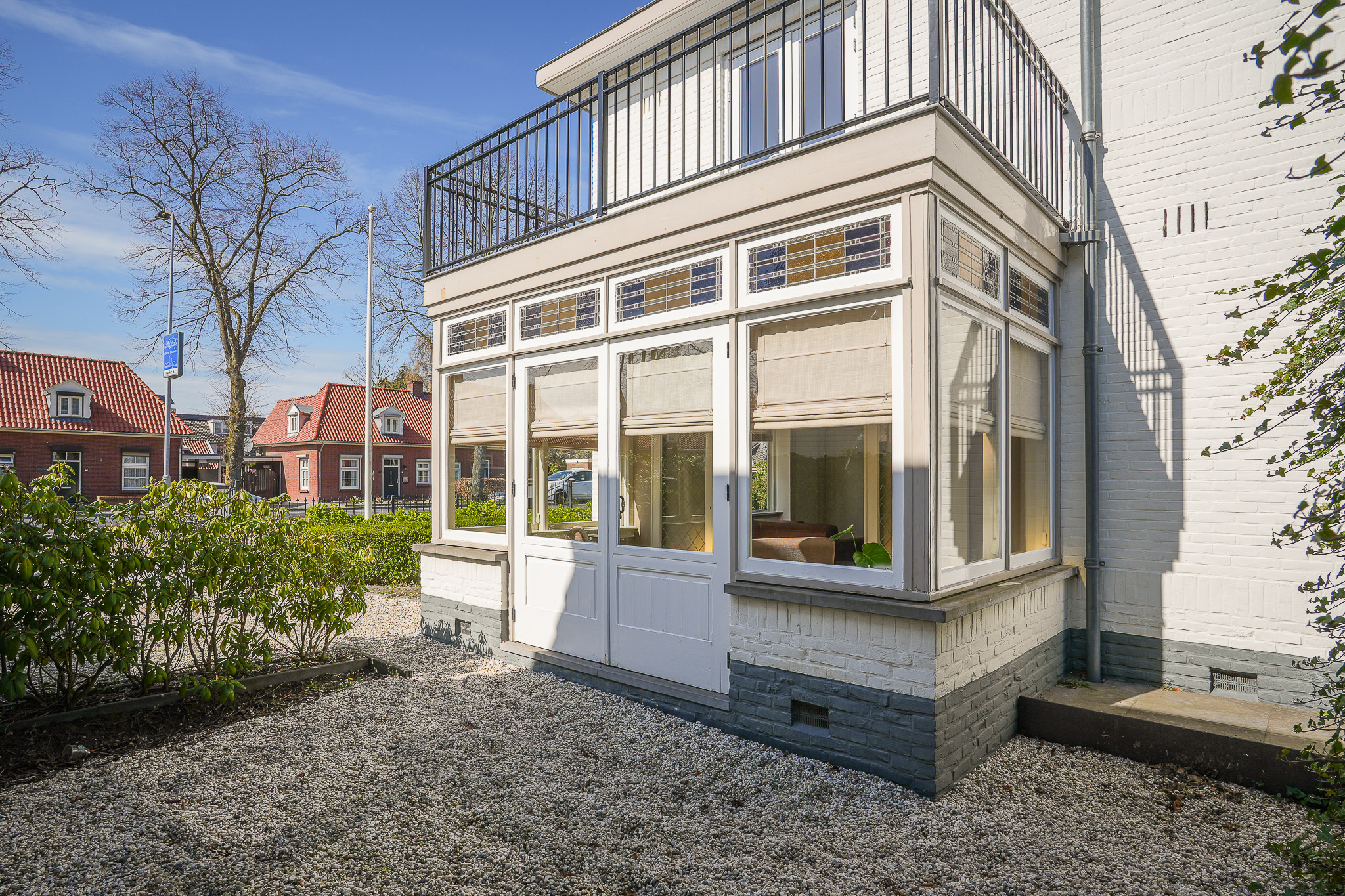 This striking white villa, named Vinkenburg, was built in 1929 to a design by municipal architect De Groot. Characteristic features from the period have been carefully preserved, including the wide overhangs, bay window, conservatory, stained-glass transoms and panelled doors with traditional ironmongery.
