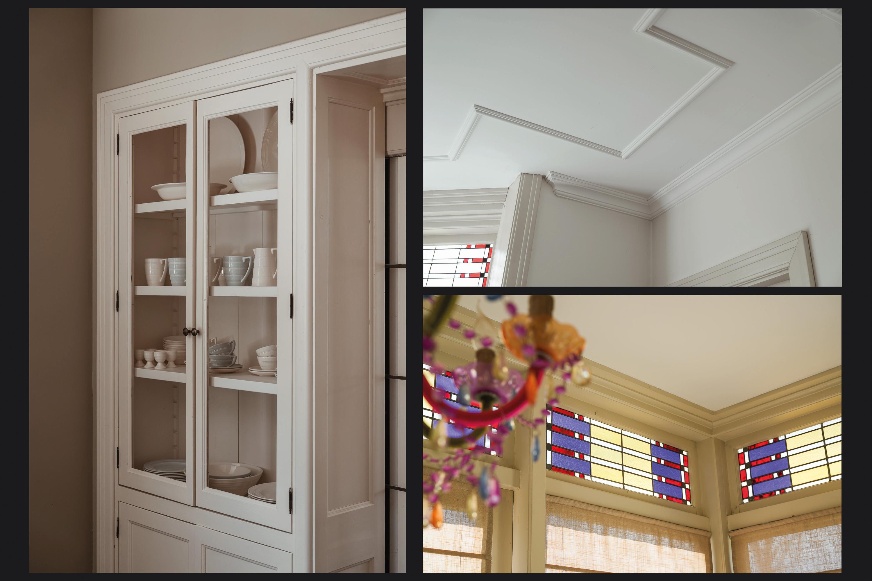 The living room en suite is wonderfully bright, with windows facing south at both the front and rear. The front room features a fireplace with wood-burning stove, a high plastered ceiling with decorative mouldings and a bay window with stained-glass transoms. From here there is access to the music/study and the enclosed conservatory. In the conservatory, double doors open onto the side garden, where the stained-glass transoms have also been retained.