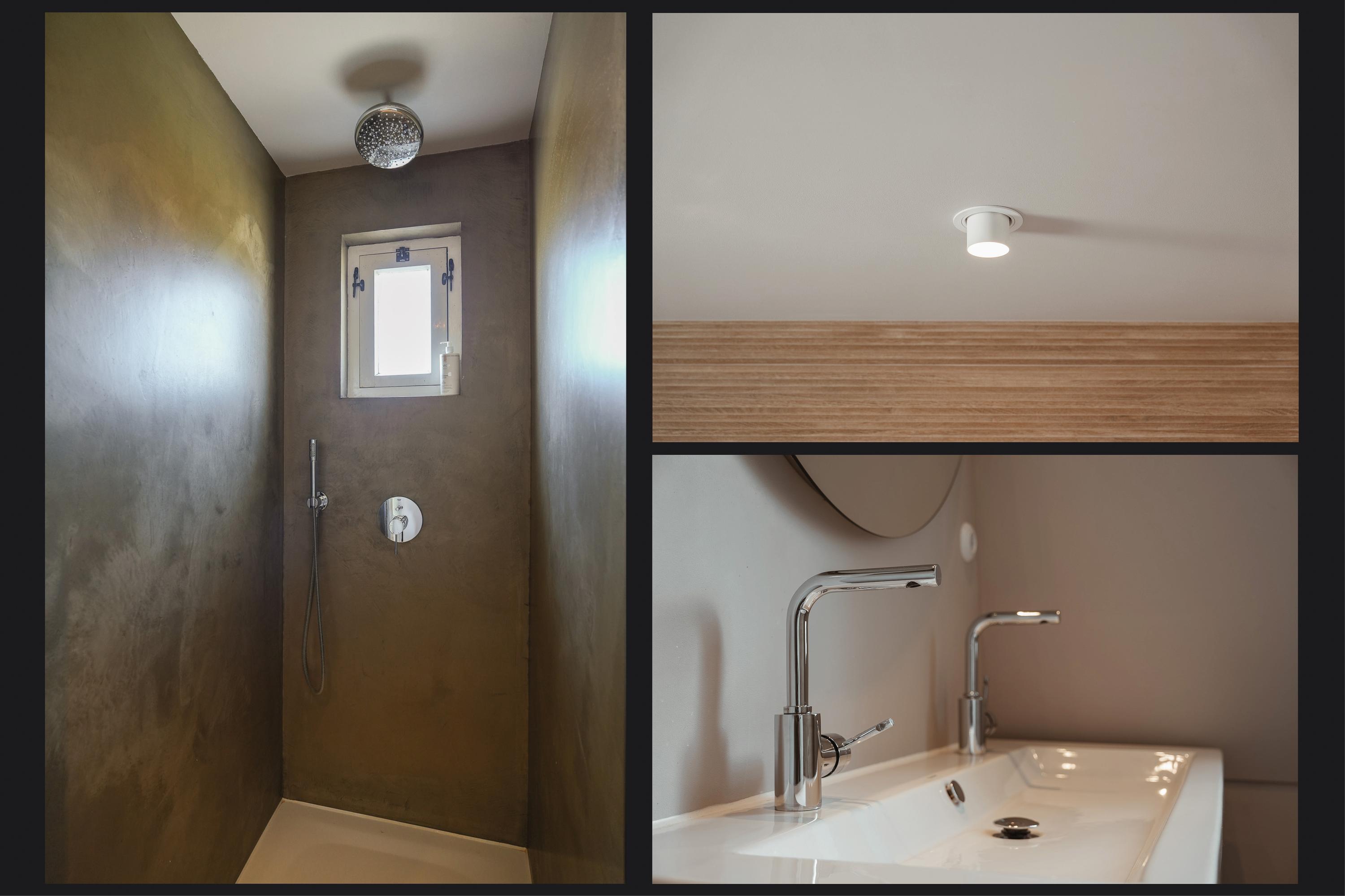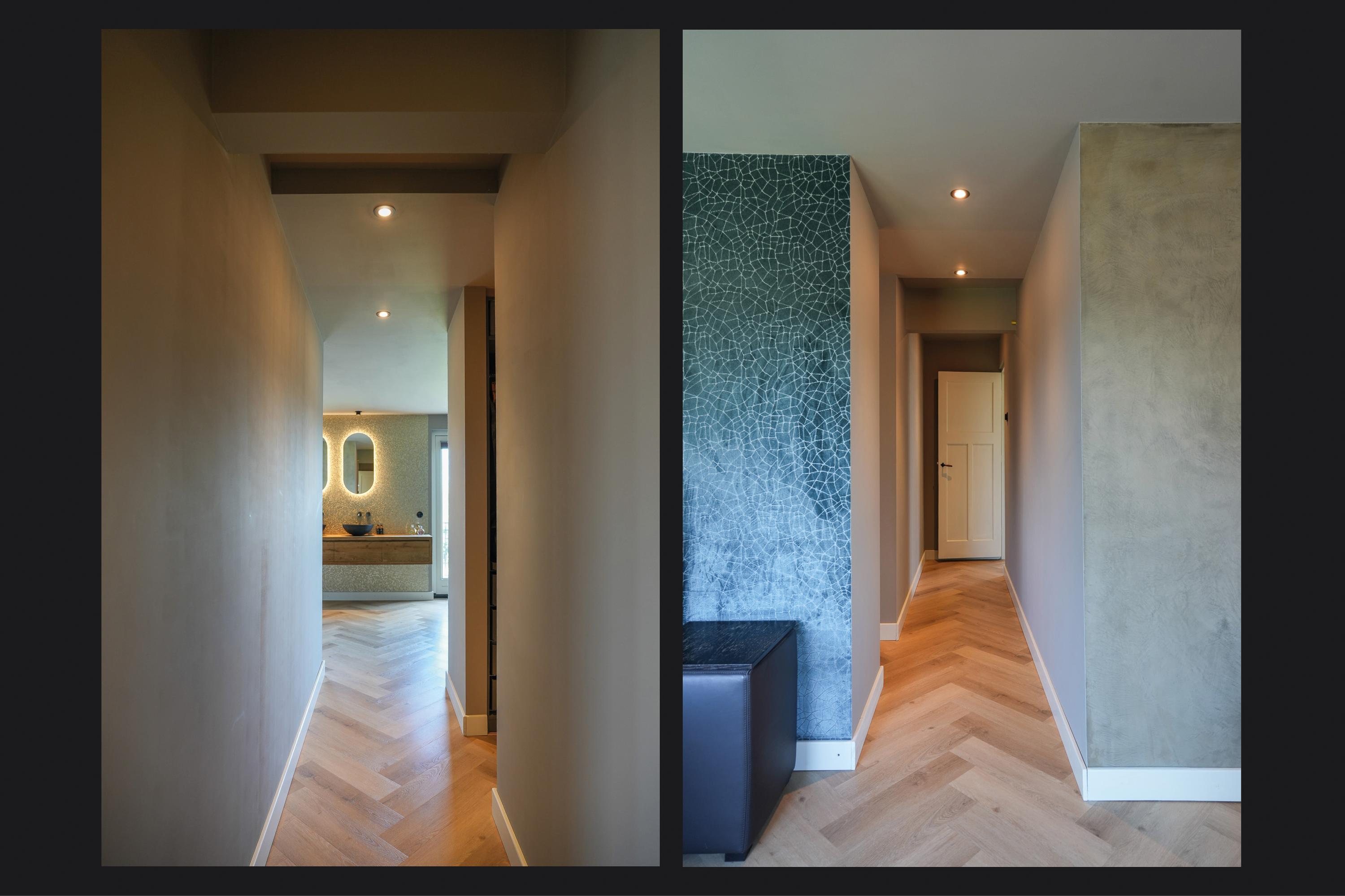 The landing reflects the care and attention given to the renovation. The new extension blends seamlessly with the original architecture. There is also a separate toilet on this level. In the rear extension is a bedroom with balcony, a luxurious open bathroom and a walk-in closet. The bathroom is fitted with a semi-freestanding bathtub, a spacious walk-in shower with rainfall shower and a stylish vanity unit. The wall behind the vanity is finished with hexagonal mosaic tiles, while the shower and bath areas feature concrete ciré finishes. Thanks to its east-facing position, the morning sun enters here, and the balcony is directly accessible from the bedroom.