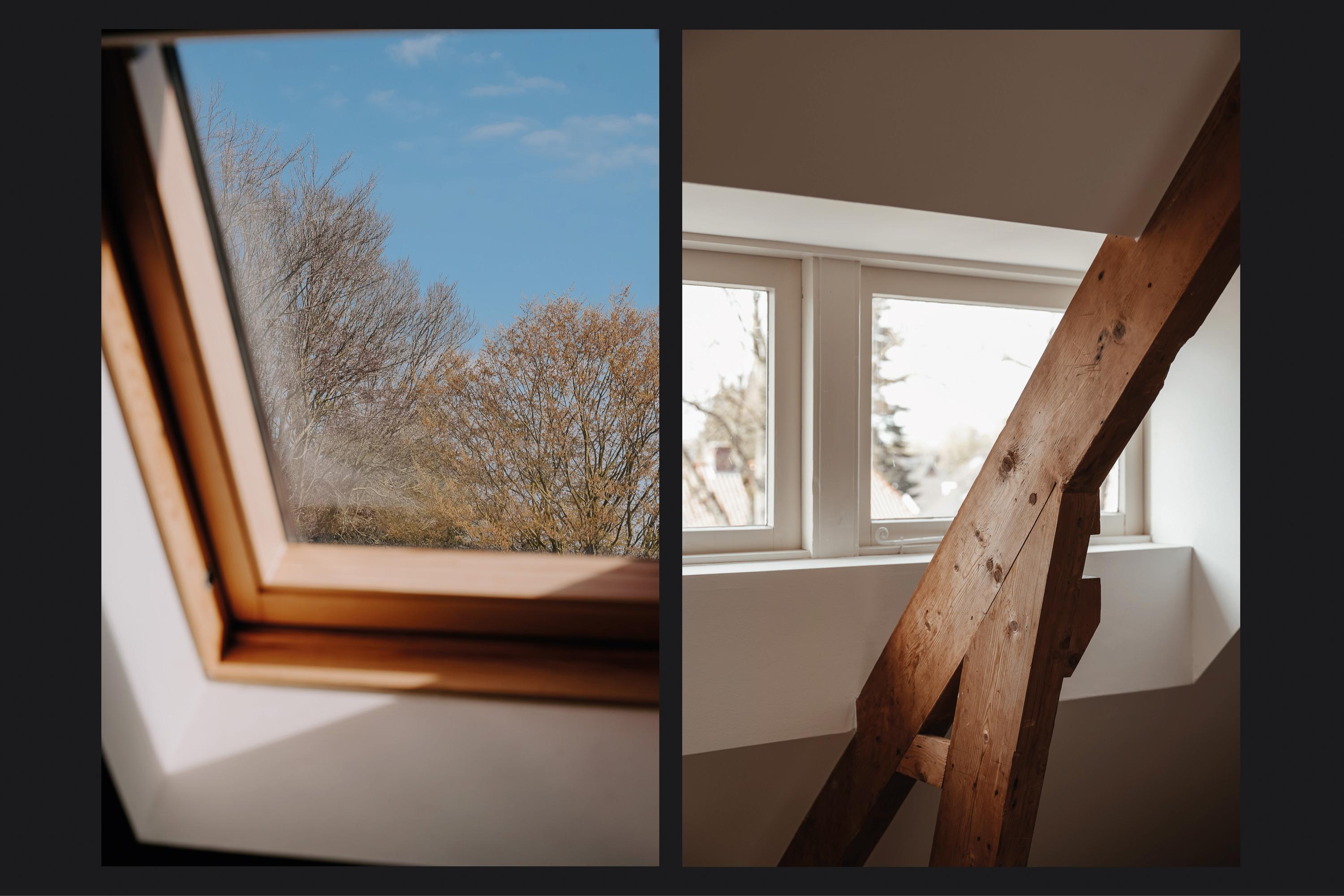 The original main house comprises a total of five bedrooms, three of which are located on this floor. Two are currently used as bedrooms and one as a study. One of the bedrooms provides access to the balcony above the conservatory. These rooms share a second fully fitted bathroom with bathtub, shower cabin with rainfall shower and a double vanity unit. A large roof window provides pleasant natural light. The entire floor is finished with a herringbone PVC floor.