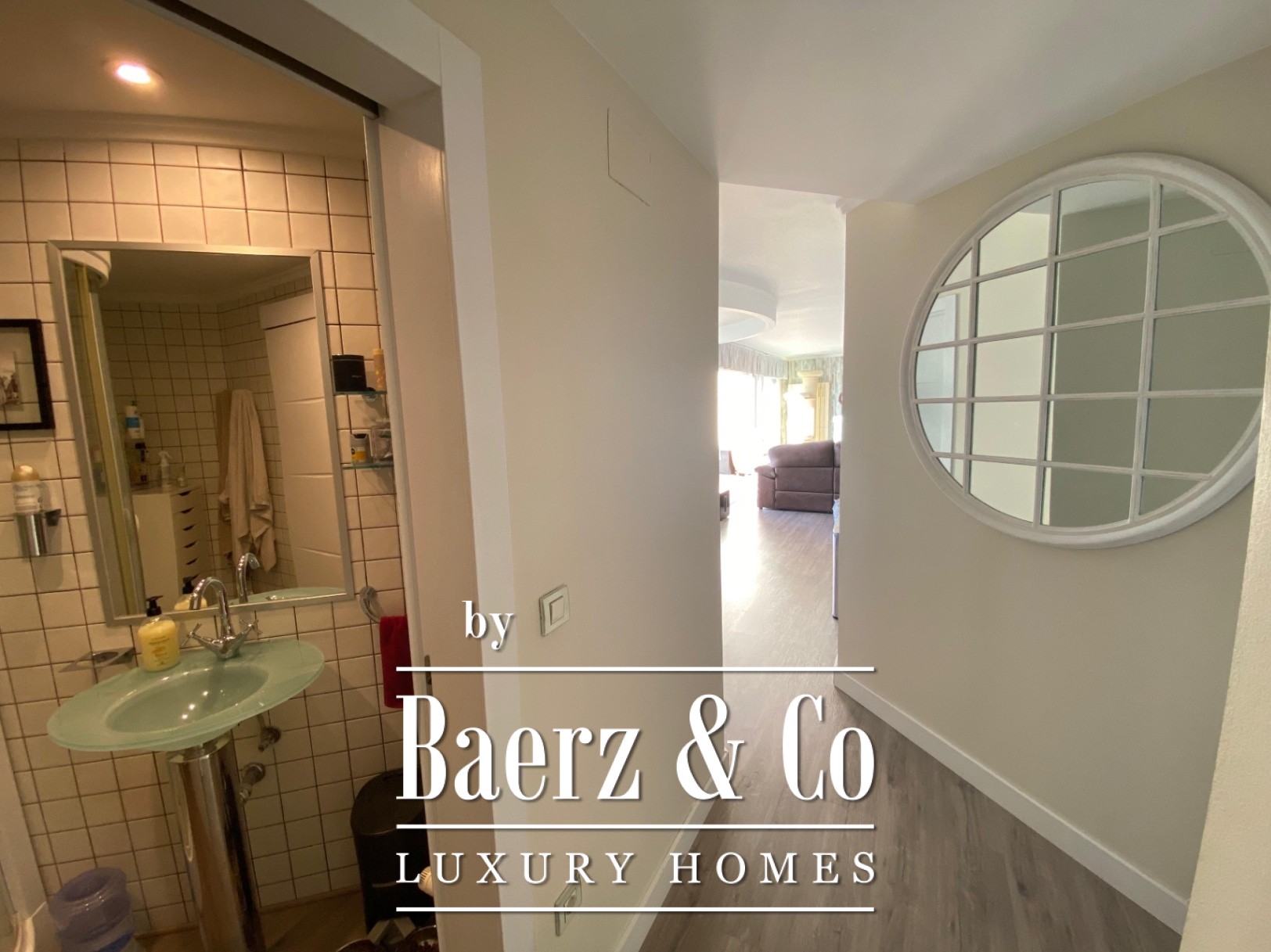 El espacio de salón y comedor de planta abierta recibe abundante luz natural, con una chimenea de gas como punto central y ventanales panorámicos que integran el mar y la montaña. Dispone de dos dormitorios, ambos con armarios empotrados, y dos baños, uno de ellos en suite, garantizando comodidad y privacidad en la vida diaria.
