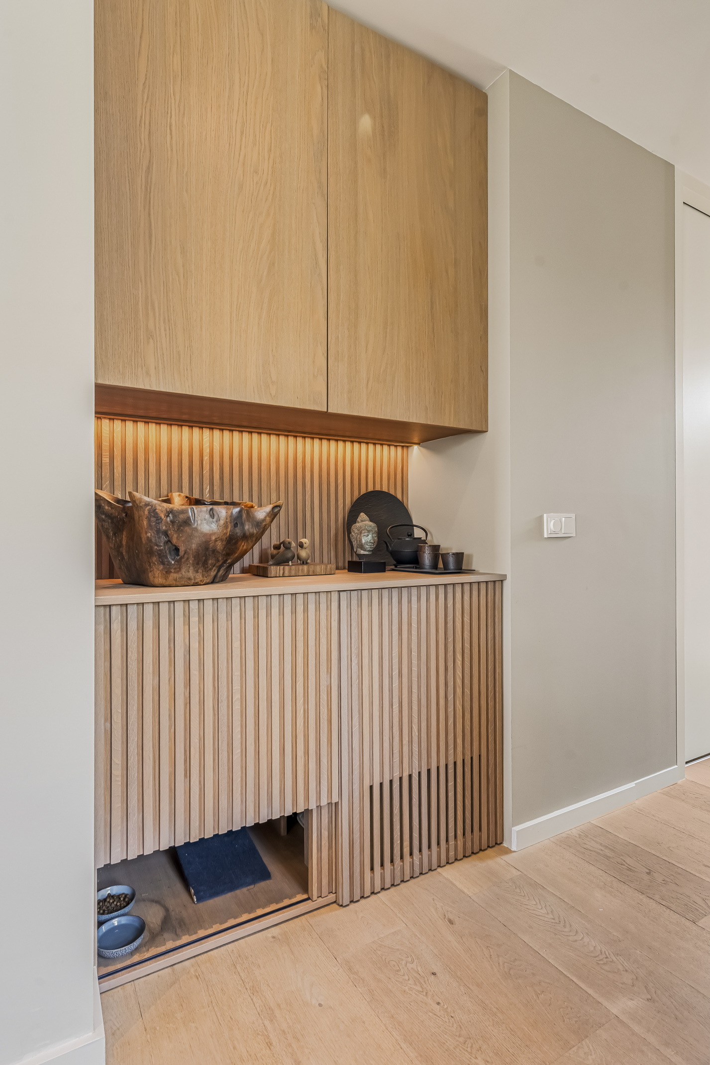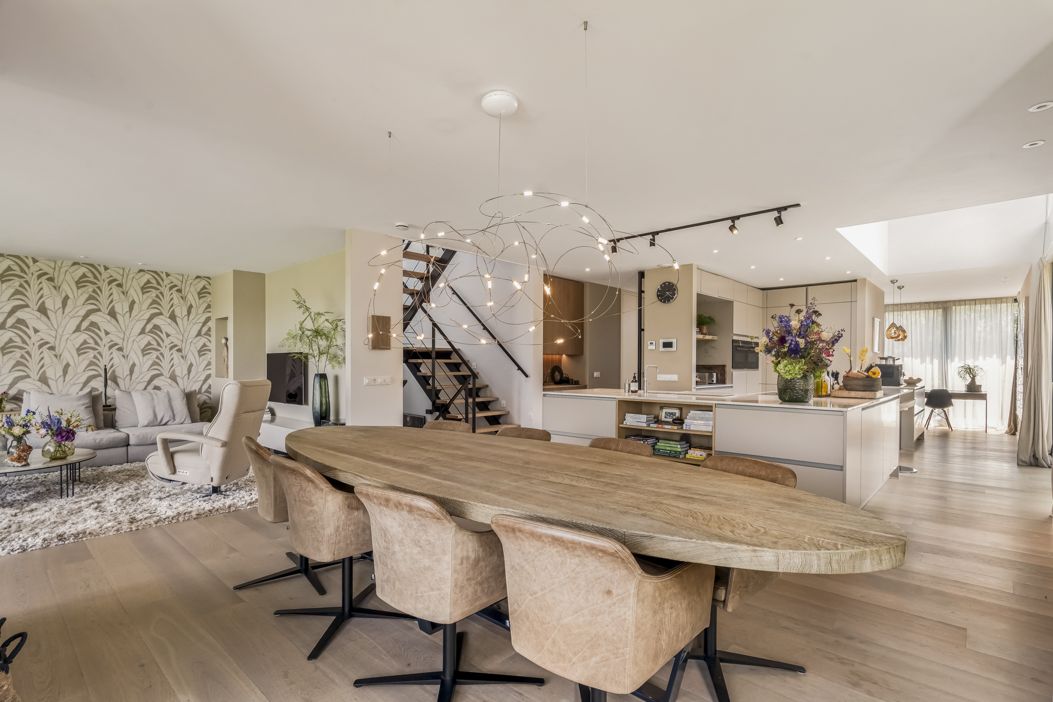 Distribuida en tres plantas principales y un refinado sótano, la villa cuenta con seis dormitorios, con opción a un séptimo, tres baños completos y una suite principal con vestidor y bañera exenta con vistas al agua. La cocina aúna artesanía refinada y funcionalidad cotidiana: placa de inducción Bora con extracción integrada, grifo Quooker, frigorífico espacioso y una exclusiva área de café que destaca la hospitalidad y atención al detalle.