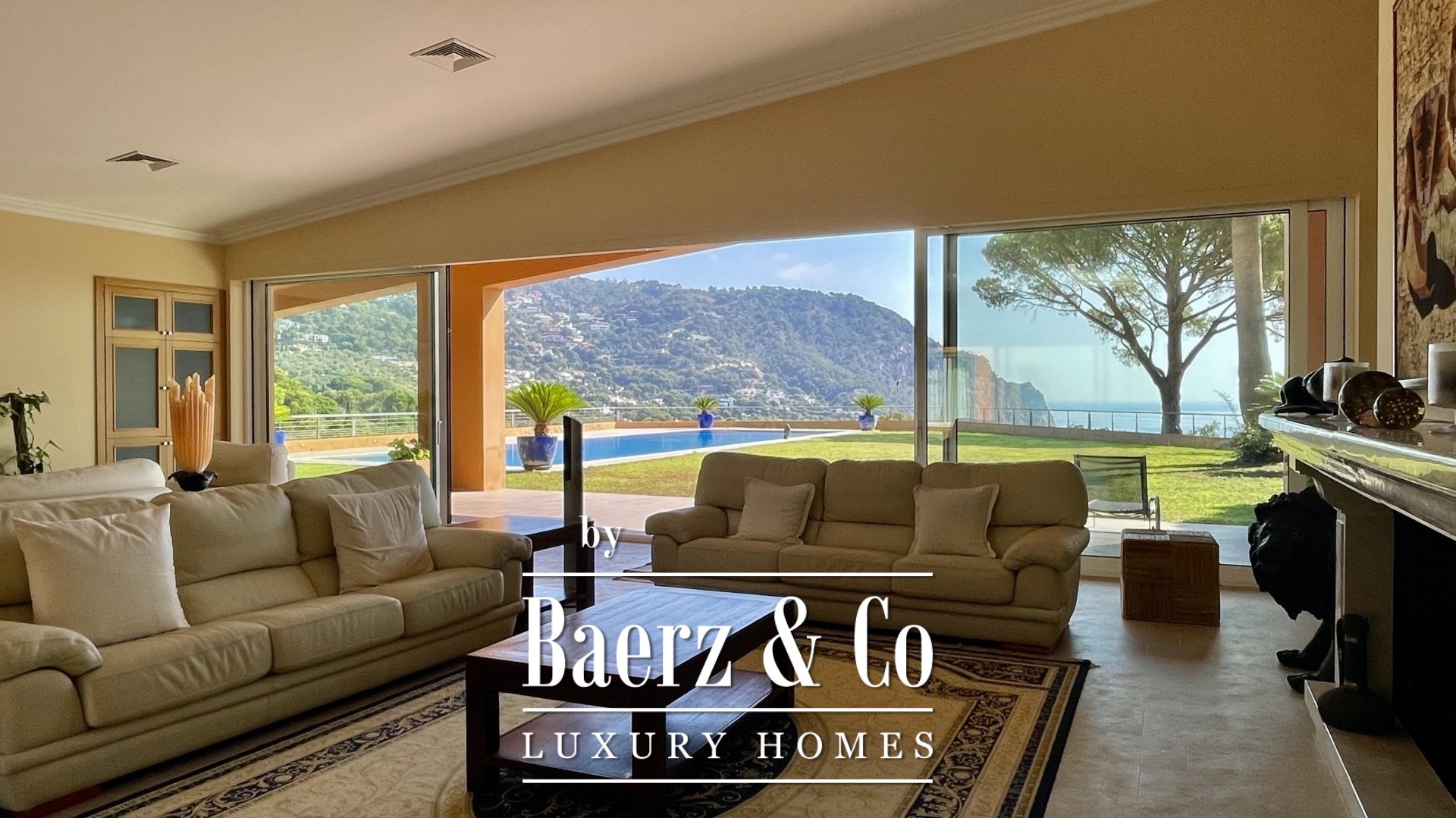 Le parcours débute par une allée sculptée qui mène à une entrée majestueuse, ouvrant sur un salon aux plafonds double hauteur baigné de lumière naturelle. Les espaces communiquent naturellement entre des recoins intimes près du feu, un salon de lecture et des espaces de réception ouverts, tous tournés vers des vues saisissantes sur la mer et le jardin. Une salle à manger formelle prolonge une cuisine généreuse avec îlot central, s’ouvrant sur une terrasse couverte dotée d’un salon et d’un barbecue à gaz pour savourer les soirées en plein air.
