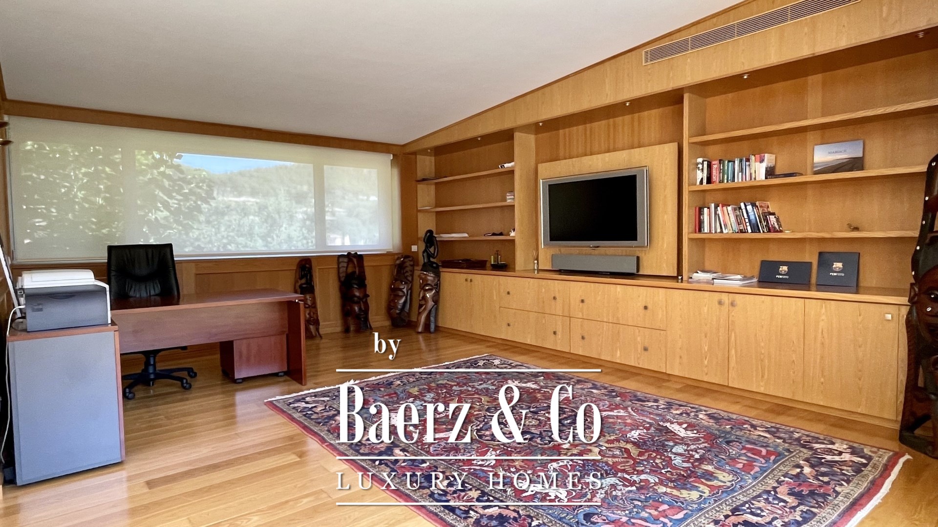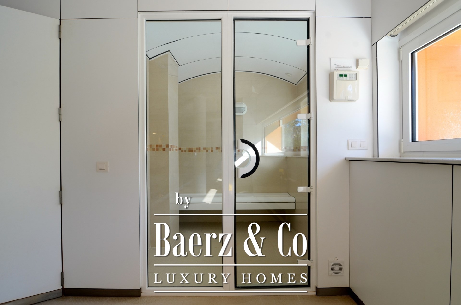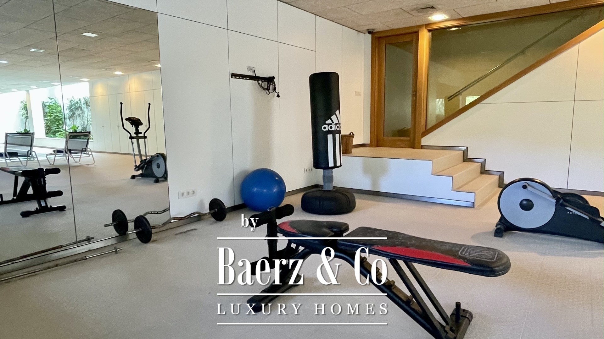 Un niveau inférieur, dédié aux invités et au bien-être, élargit les perspectives grâce à une piscine intérieure chauffée, une salle de sport, un spa et trois chambres doubles en suite, idéales pour recevoir ou loger le personnel. À l’extérieur, une piscine de 21 x 7 mètres s’impose au cœur des jardins soignés, entourée de terrasses et d’un patio propice à la contemplation.