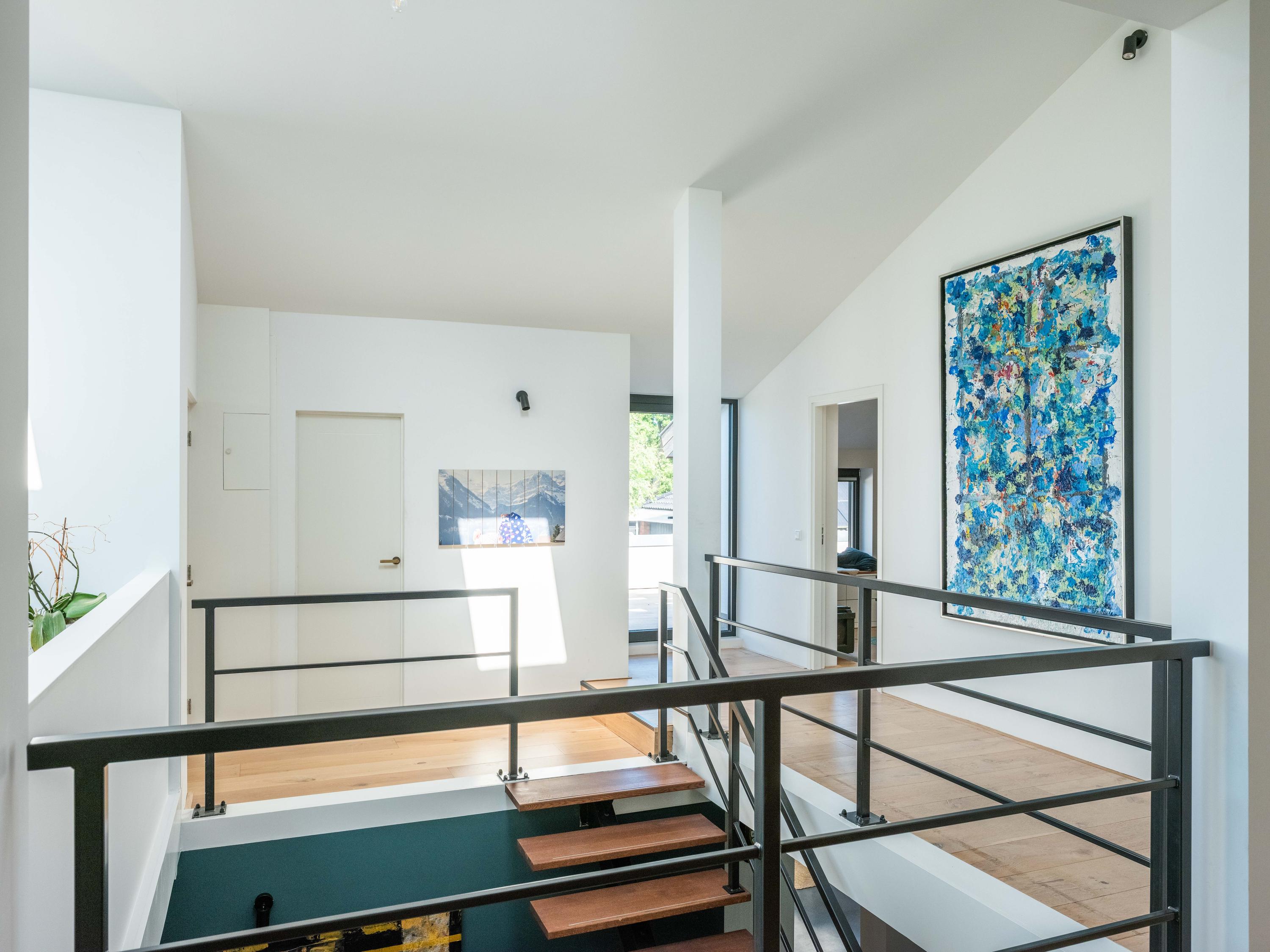 À l’étage, trois chambres, un bureau polyvalent avec vue panoramique, une salle de yoga et une mezzanine à la conception ludique répondent à la fois à la vie de famille et aux projets créatifs. Une seconde salle de bain complète, une buanderie séparée et un soin du détail constant offrent un confort réfléchi.