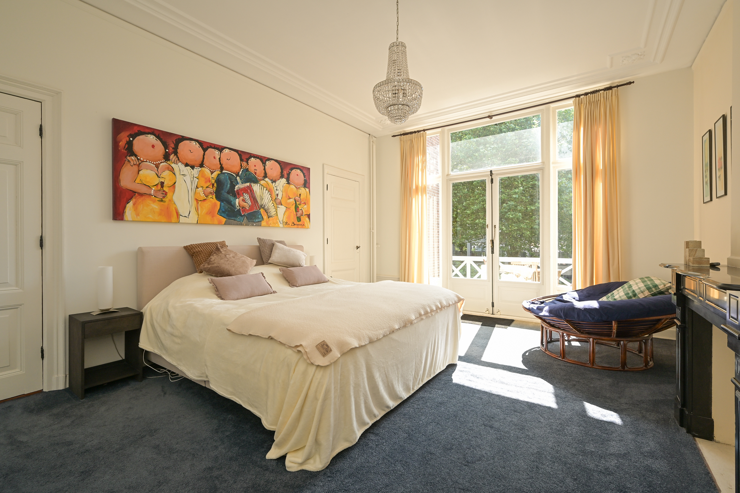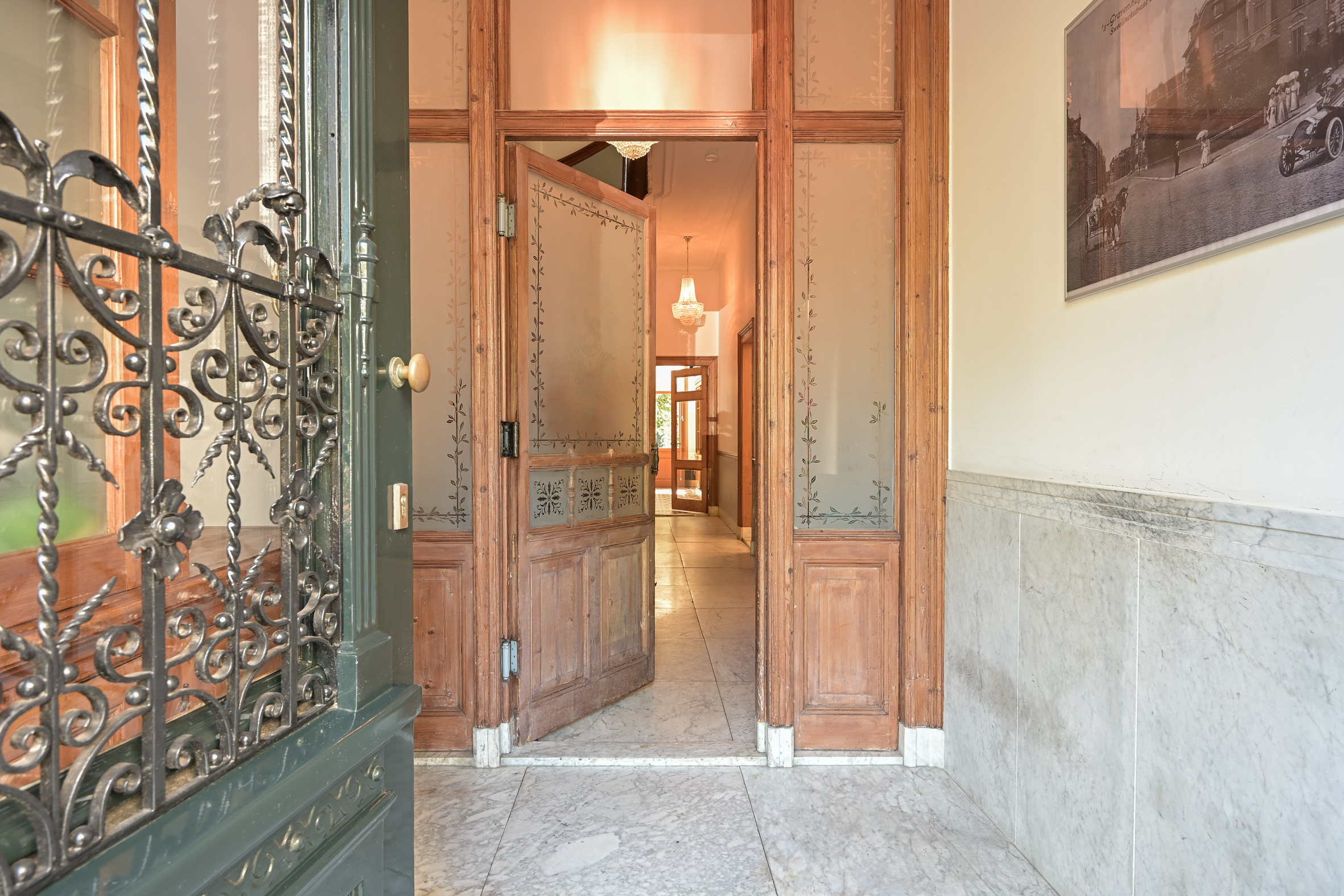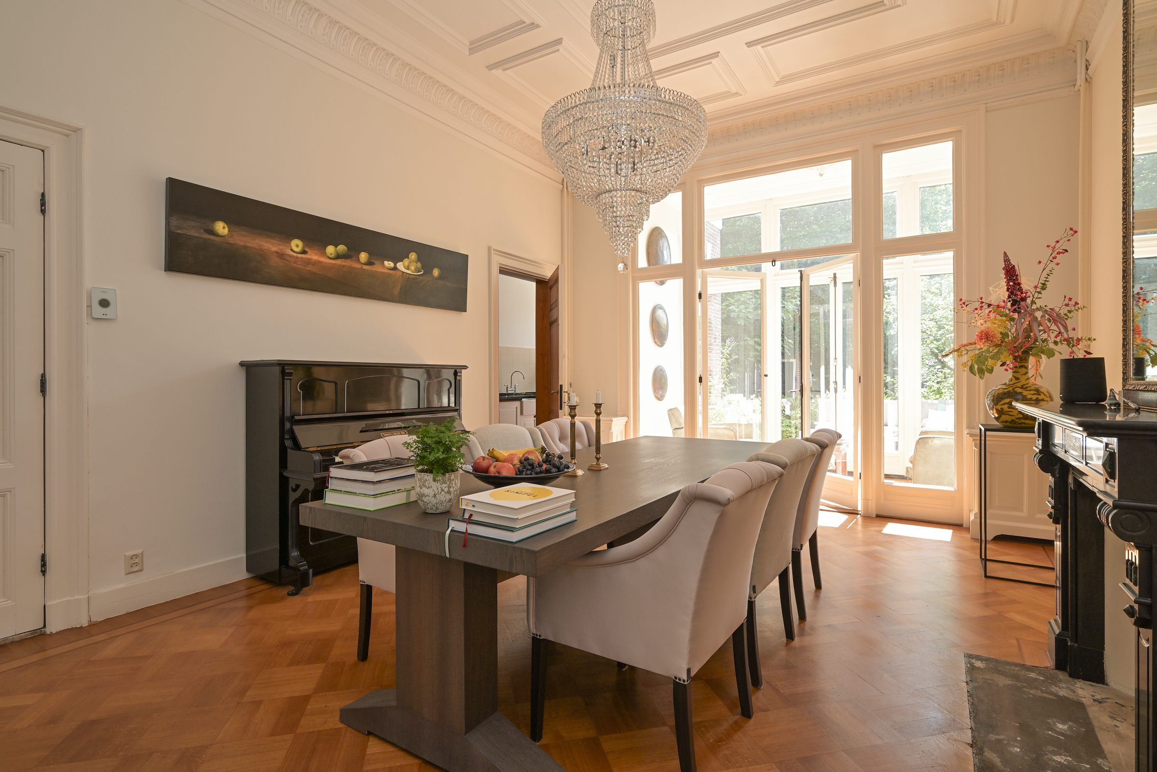 Indeling: entree, ruime hal met marmeren vloeren, tochtseparatie, brede gang met marmeren vloerdelen, fraai trappenhuis met spijltjes, open ruimte onder de trap, moderne wc met fonteintje. Royale brede kamers met marmeren schouwen (met in de voorkamer een houthaard), hoge geornamenteerde plafonds, suite separatie met schuifdeuren en vaste kasten en fraaie parketvloeren. De achterkamer heeft dubbele deuren naar de serrekamer en is eveneens in verbinding met de royale moderne keuken voorzien van (inbouw)apparatuur aan de ene zijde en een prachtige originele ingebouwde servieskast aan de andere zijde. Zowel de keuken als de serrekamer bieden toegang tot de ruime zonnige achtertuin met diverse schuurtjes en een achteringang (afsluitbare toegangsdeur aan de straat). Onder de keuken ligt een praktische kelderruimte van ca. 14 m2 en 1,81m hoog.
