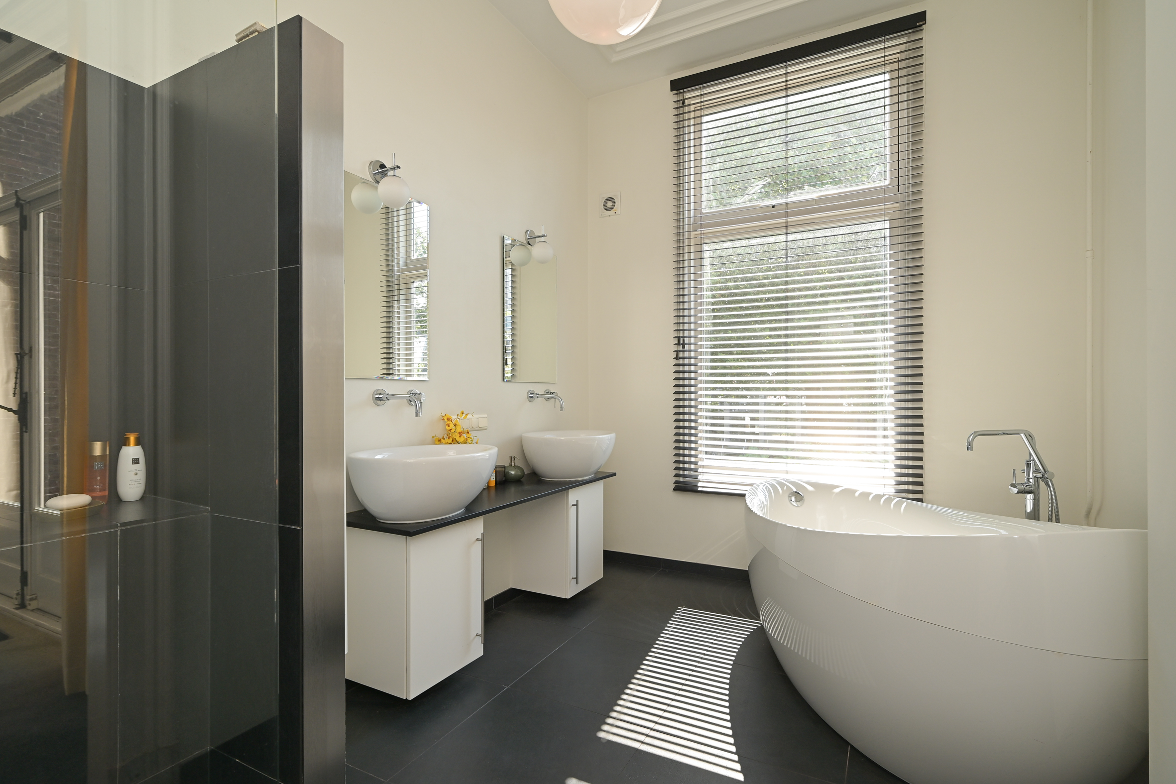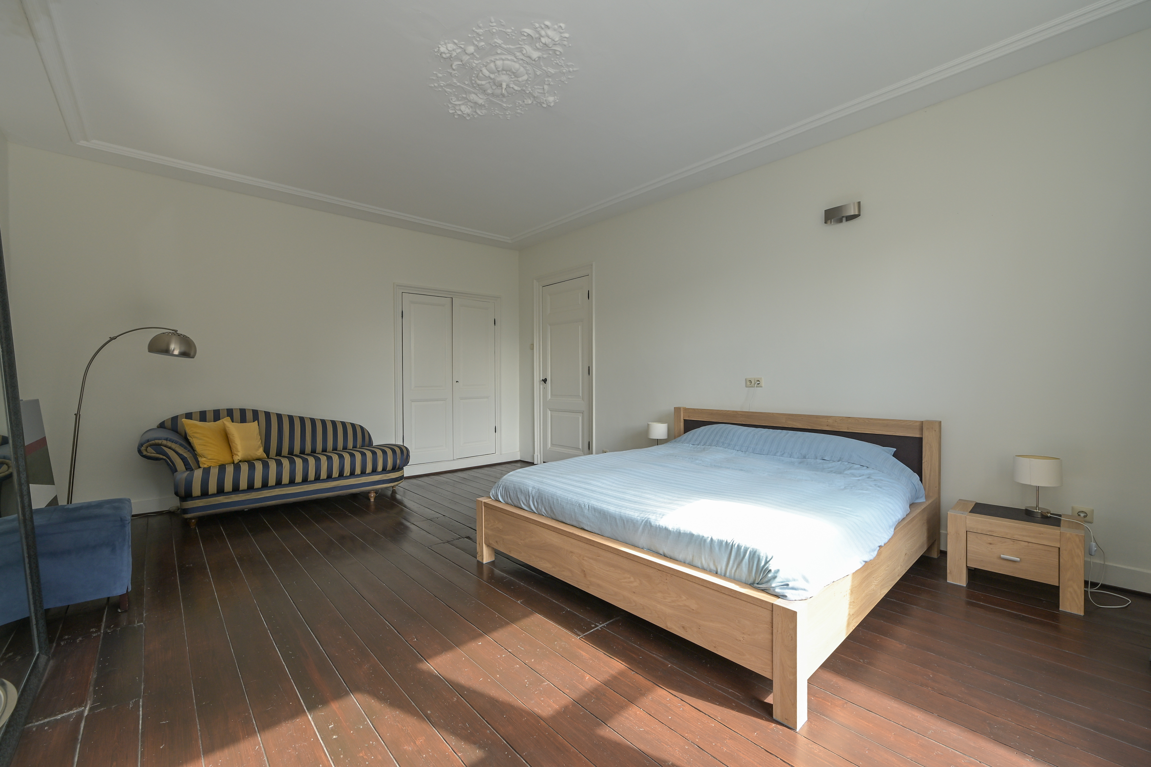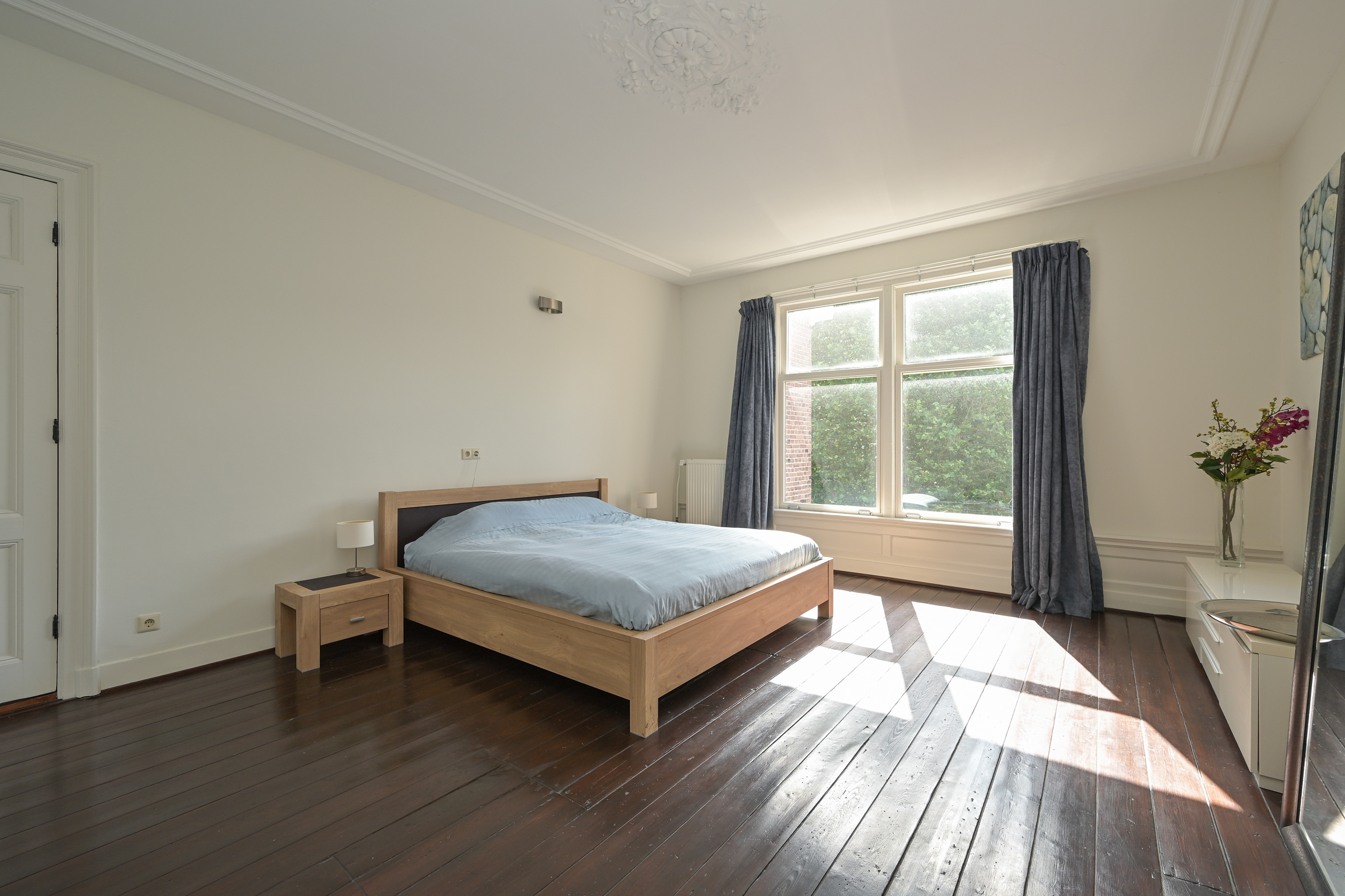 De fraaie trap leidt naar de overloop met moderne wc met fonteintje, de voorkamer biedt vrij zicht en heeft een fraaie parketvloer, hoog plafond met lijstwerk, marmeren schouw en ingebouwde kasten. De voorzijkamer is thans in gebruik als inloopgarderobekamer maar kan ook als studeerkamer of extra slaapkamer fungeren. De achterkamer heeft eveneens ingebouwde kasten, een fraai plafond en marmeren schouw en biedt enerzijds toegang tot het ruime achterbalkon en anderzijds toegang tot de moderne badkamer met design ligbad, dito wastafels met ombouw en inloopdouche. De badkamer is voorzien van elektrische vloerverwarming en is ook vanaf de overloop bereikbaar.