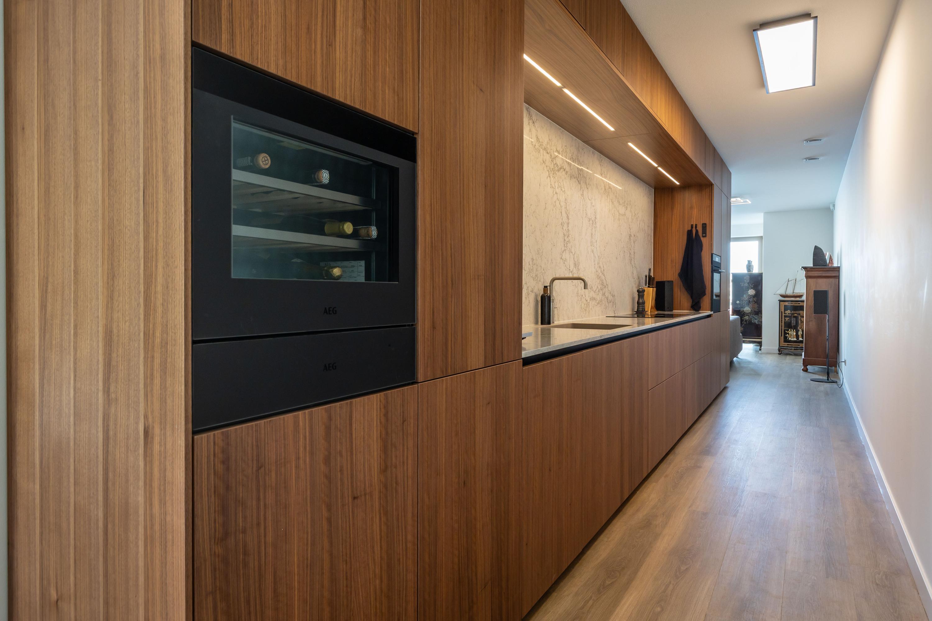 Tussen de living en de eetkamer ligt de indrukwekkende 7,20 meter lange keukenopstelling van NEXT-125. Een keuken die zich moeiteloos kan meten met high-end interieurdesign. De hoge kasten zijn uitgerust met een wijnklimaatkast, warmhoudlade, combi-oven, koel-/vriescombinatie. De brede inductiekookplaat met geïntegreerde afzuiging, de stille vaatwasser en de Quooker-kraan maken de uitrusting compleet. De fronten zijn uitgevoerd in warm walnoothout en het werkblad en de achterwand zijn afgewerkt met luxe composiet in een marmerdesign met doorlopend aderpatroon. Een stijl die rust, luxe en tijdloosheid uitstraalt.