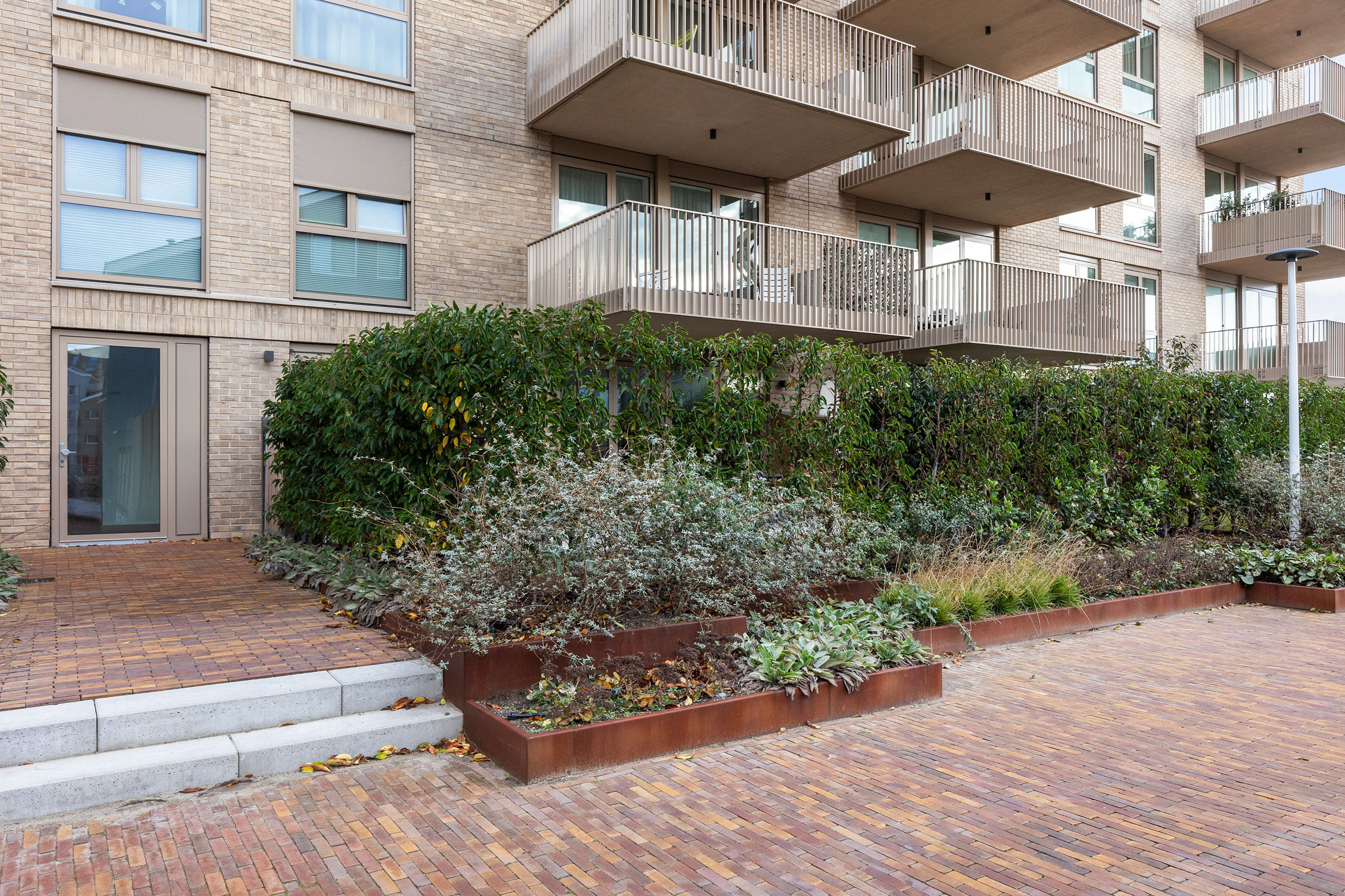 De twee openslaande deuren in de eetkamer geven toegang tot het zonneterras en de eigen tuin, ideaal voor een ochtendkoffie of zomeravond met vrienden. De tuin grenst aan de gezamenlijke binnentuin en biedt een groene beleving die je zelden vindt bij een appartement.